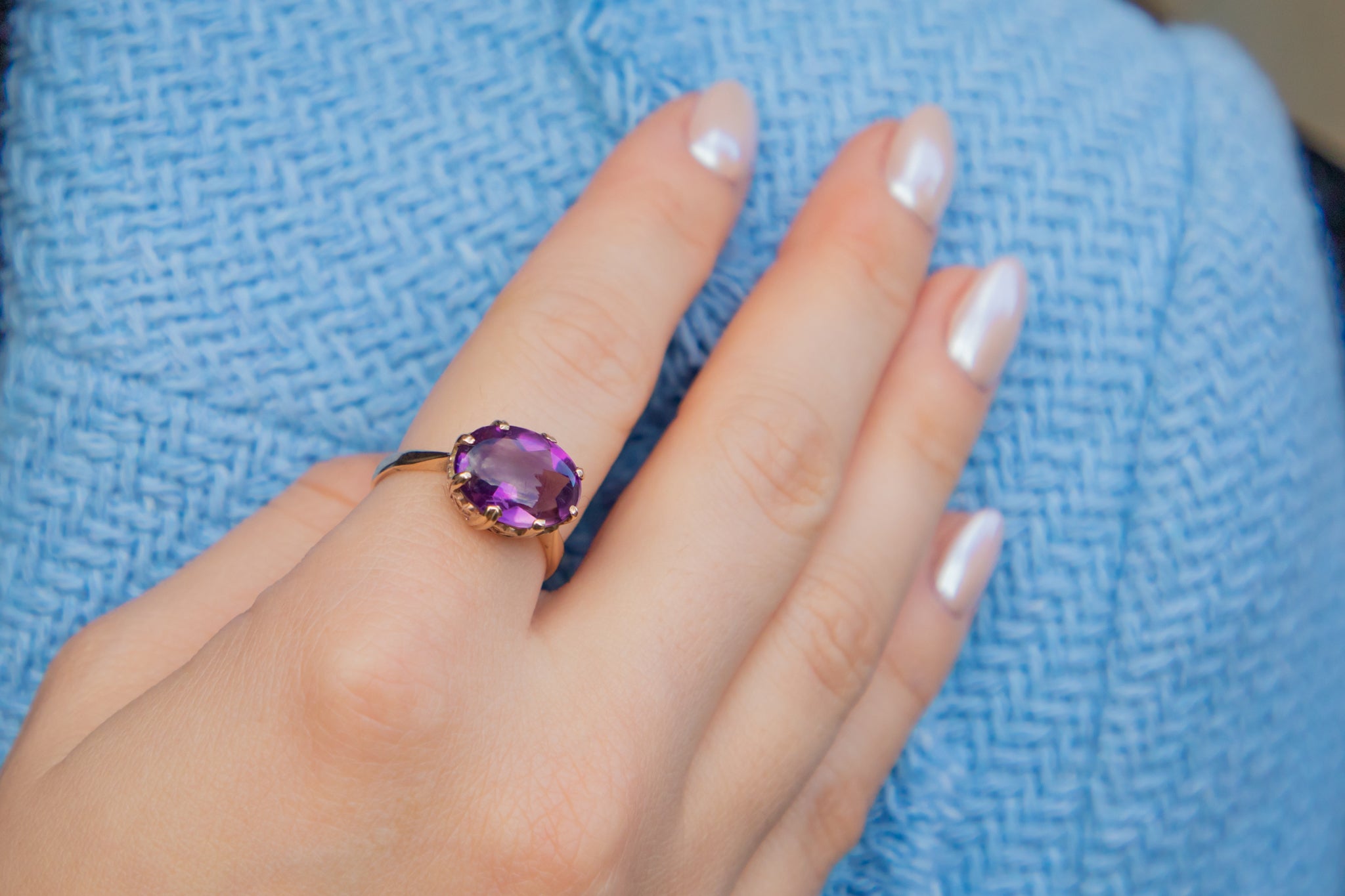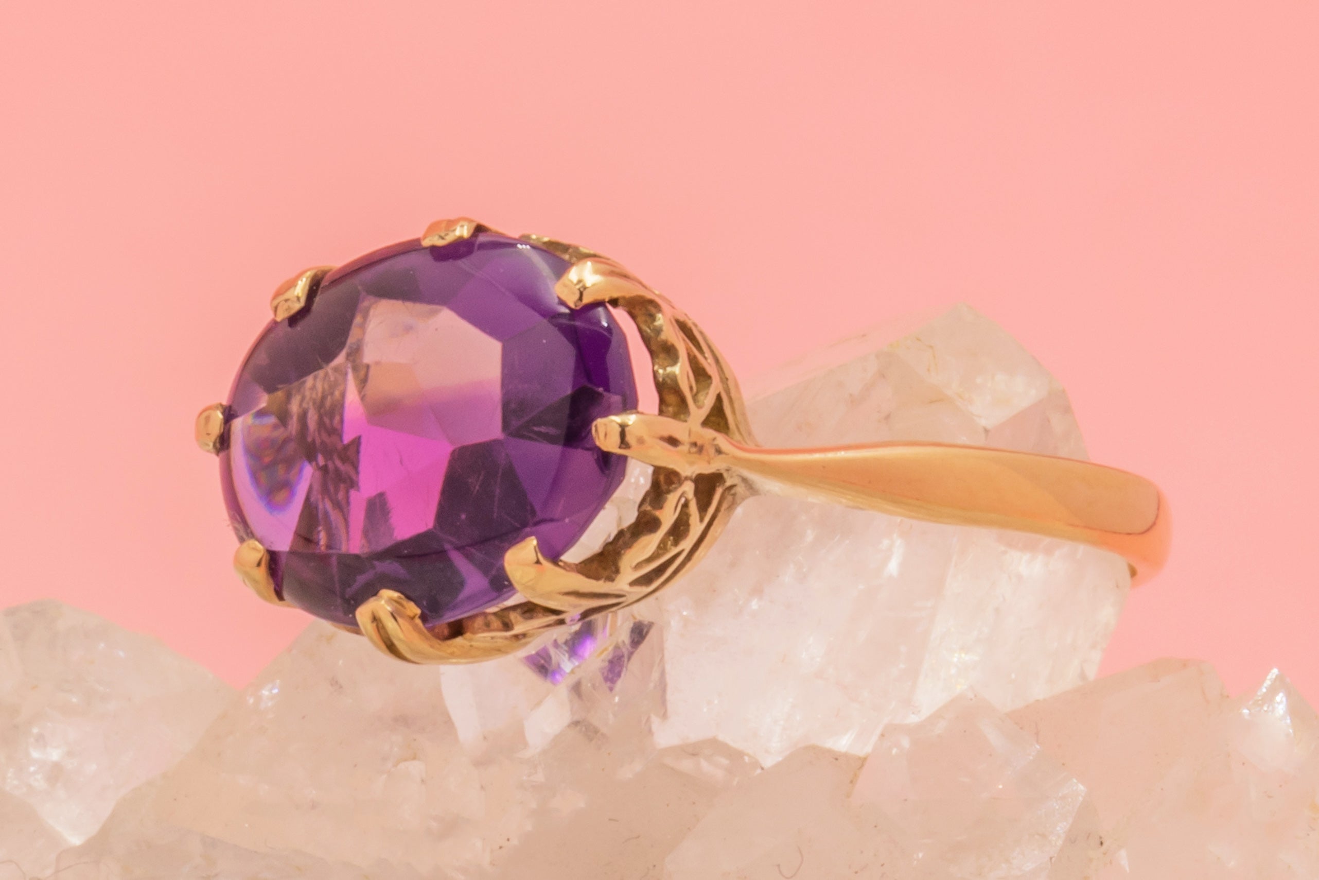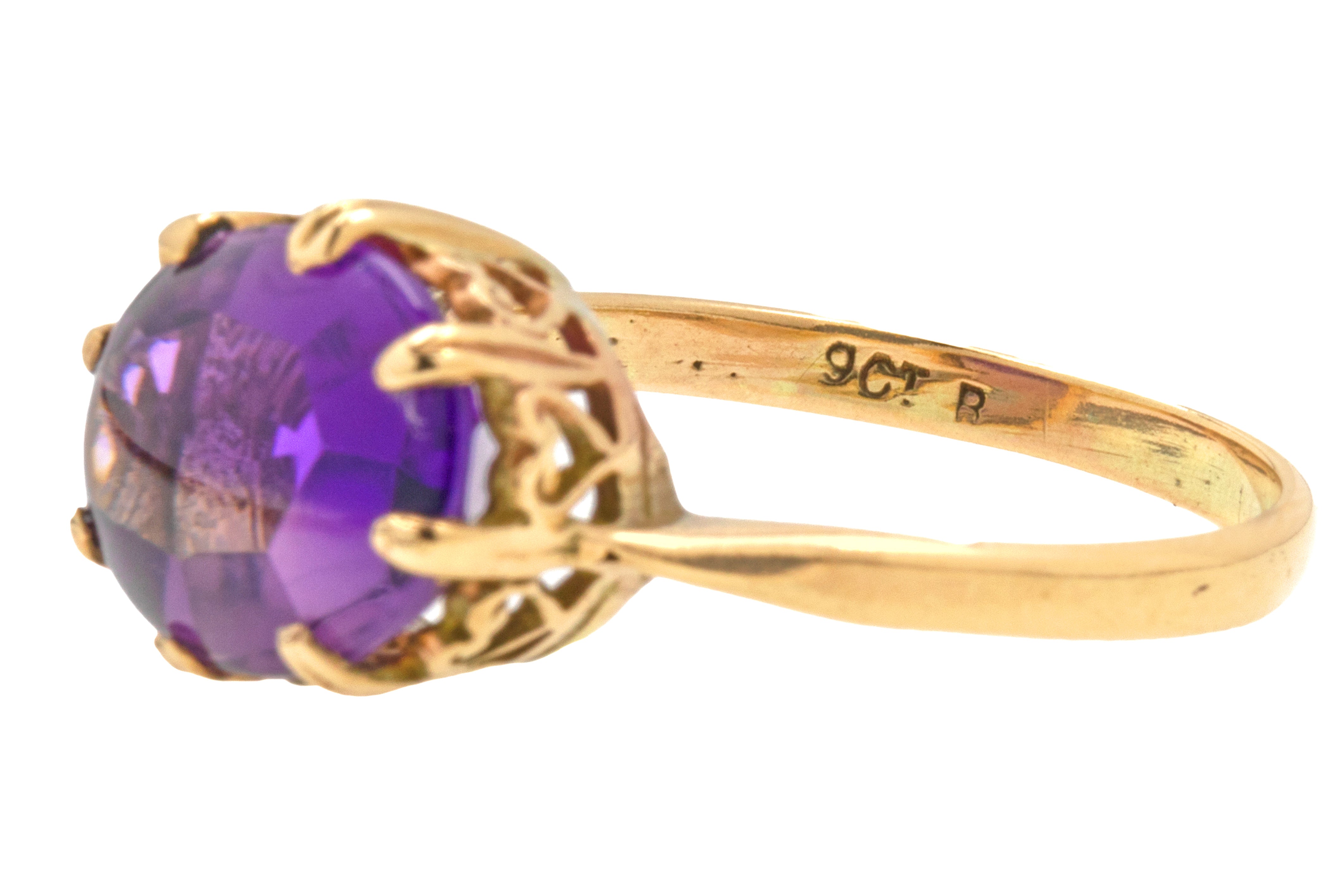 VERY GOOD. A gorgeous 9ct gold Amethyst cabochon ring in very good condition. This stunner has very little wear to note, the Amethyst is secure and smooth on the top aside from a few little surface scratches which are only visible up close. The ring band is a lovely Gold hue, and hallmarked on the inside!