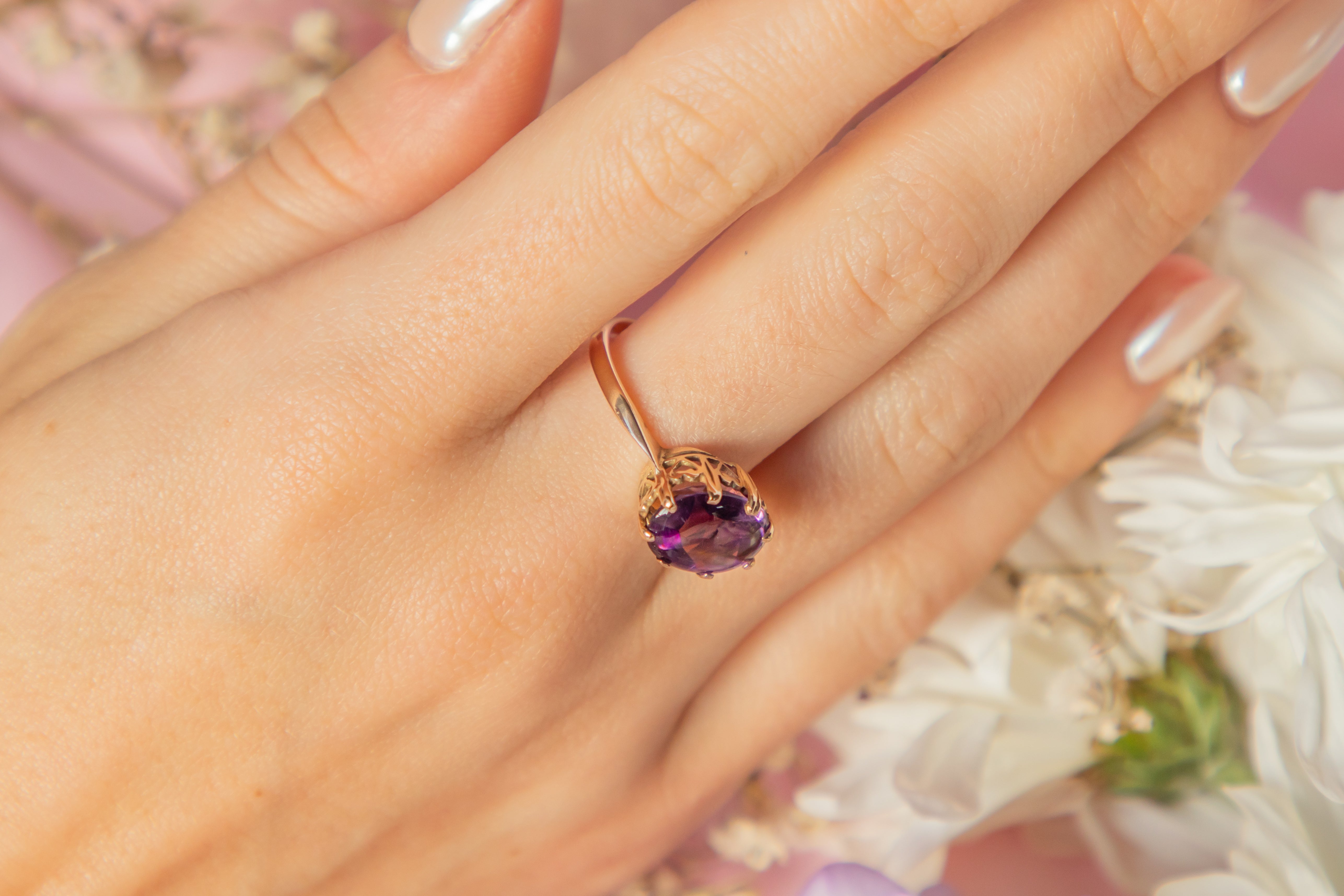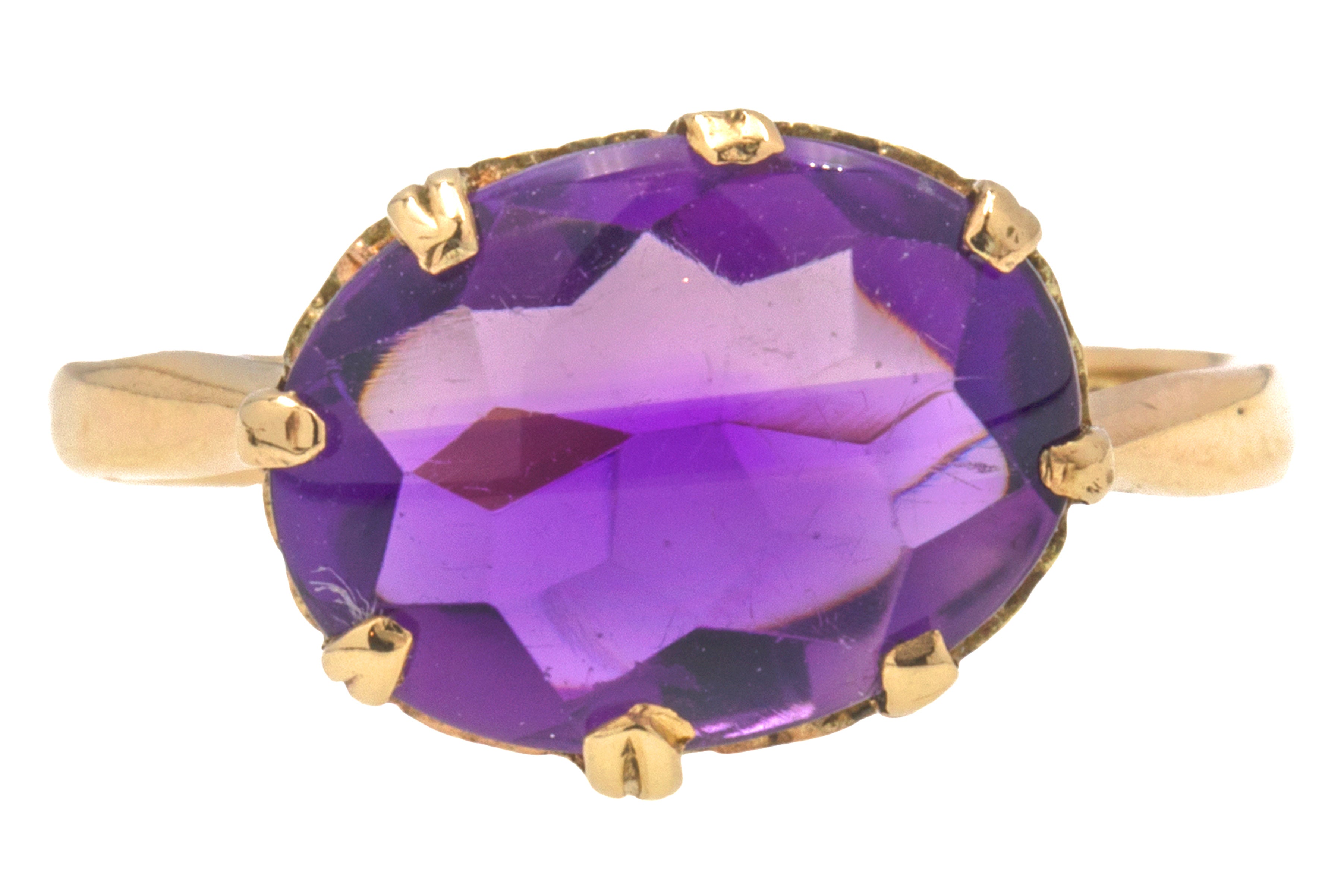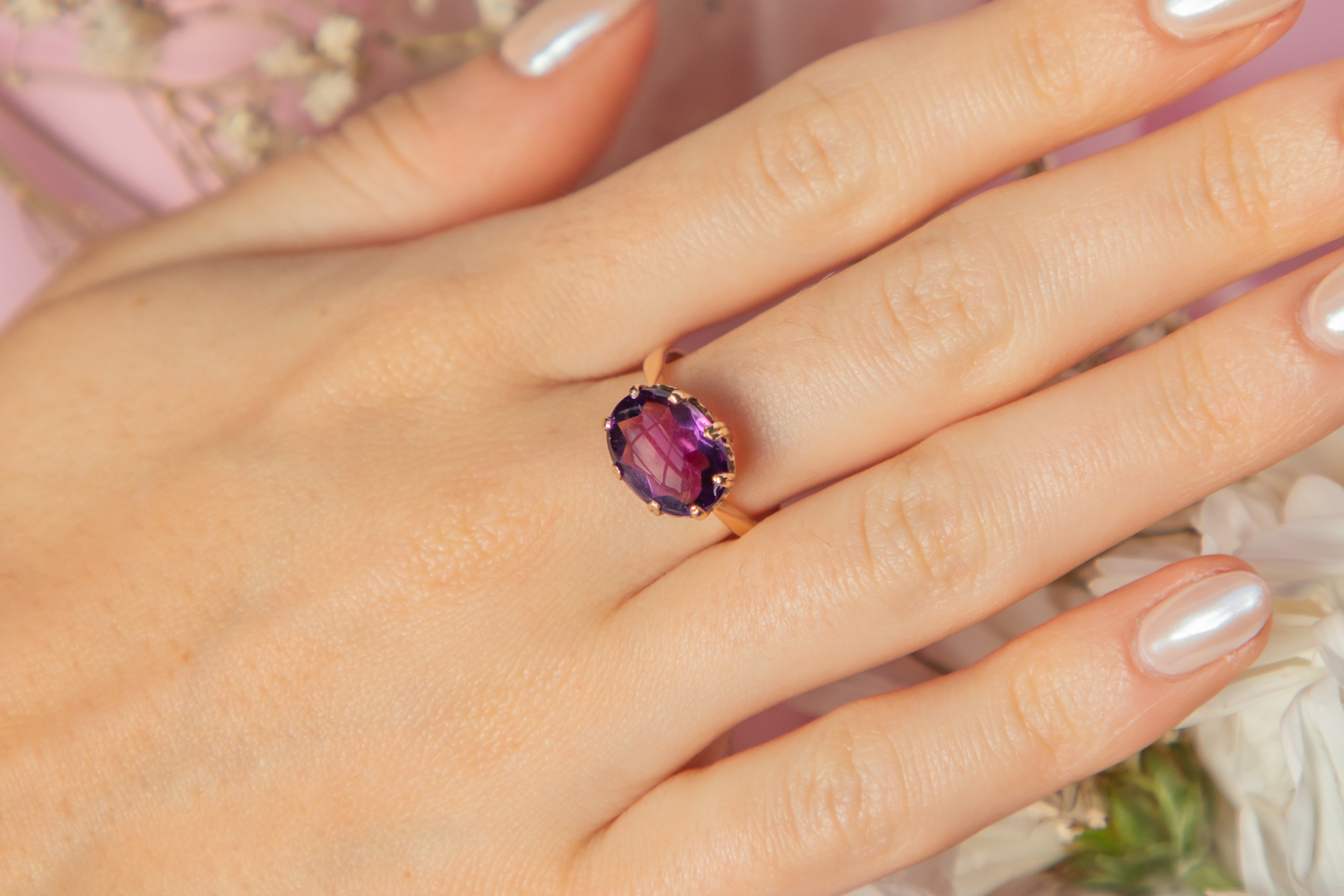 VERY GOOD. A gorgeous 9ct gold Amethyst cabochon ring in very good condition. This stunner has very little wear to note, the Amethyst is secure and smooth on the top aside from a few little surface scratches which are only visible up close. The ring band is a lovely Gold hue, and hallmarked on the inside!