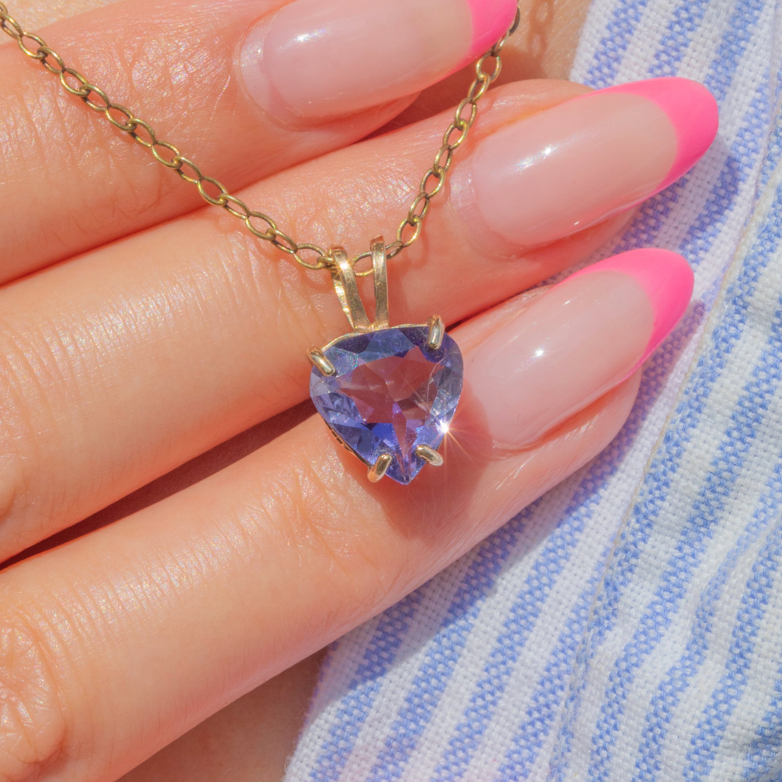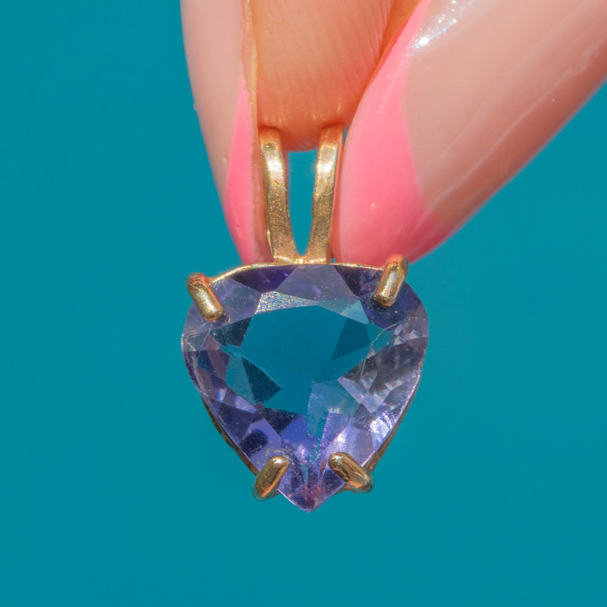 VERY GOOD: This 9ct Gold Amethyst heart charm is in very good condition. Her Amethyst is faceted wonderfully and is securely set. There is a surface crack present, as well as a small fleabite, though this isn't overly noticeable and doesn't impact the integrity of the stone. With a securely soldered bale, you can wear her with utmost confidence!
