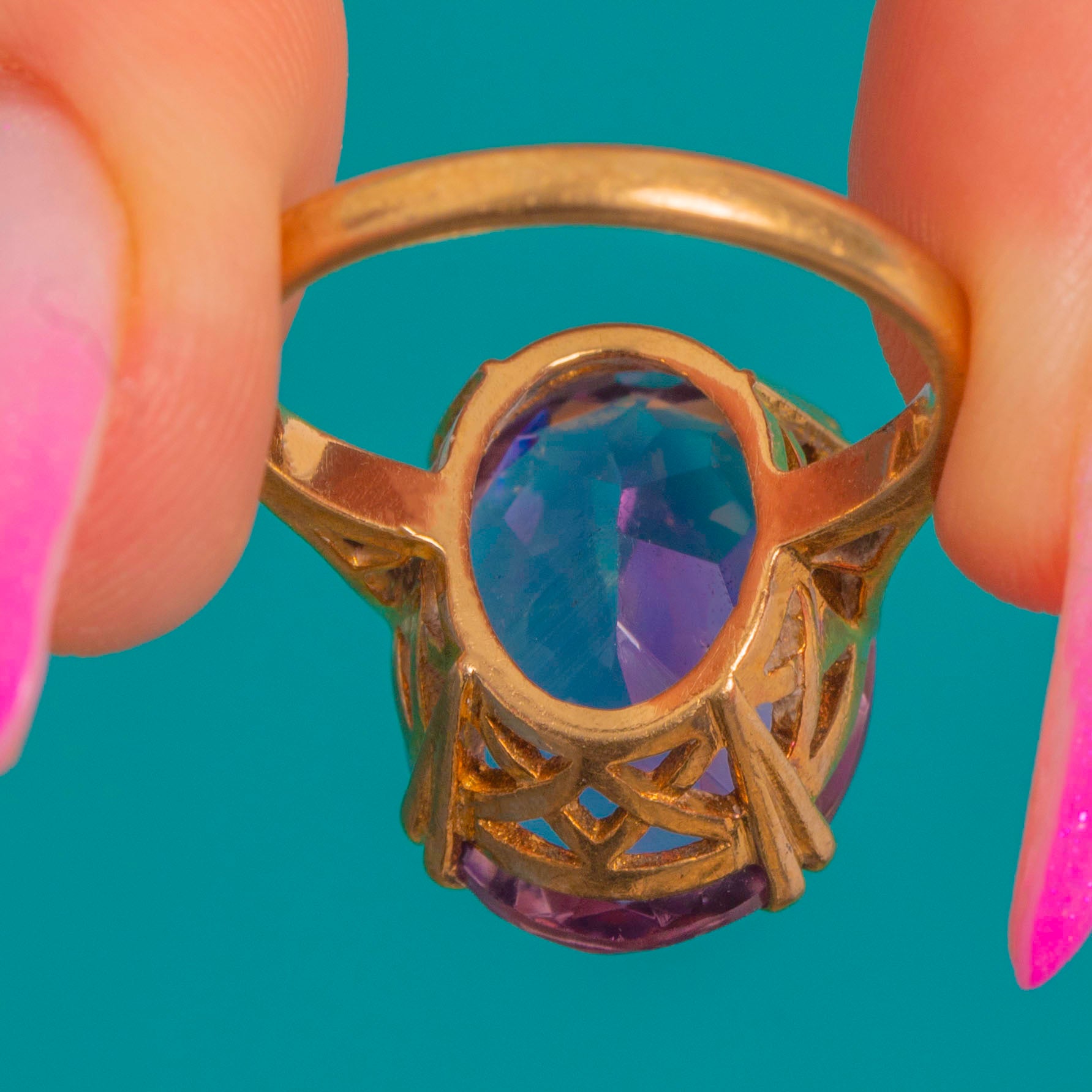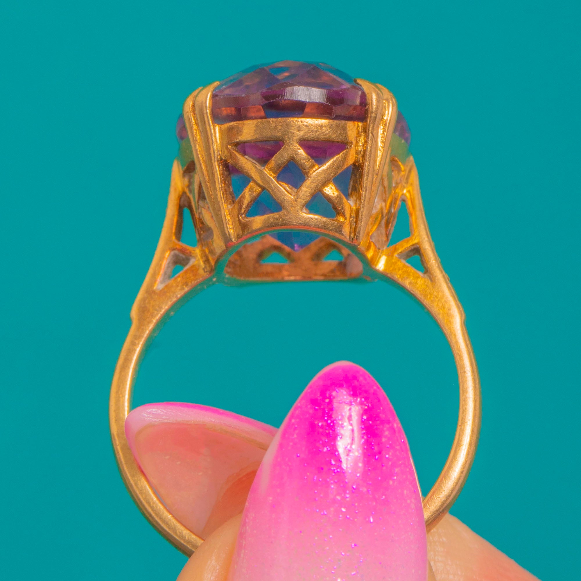 EXCELLENT: The Amethyst presents beautifully with no obvious chips or abrasions, and crisp facet edges showing only light age-consistent wear under magnification. The 9ct Gold setting, openwork gallery and prongs are secure with minor surface marks and a soft patina in recessed areas. The shank remains in good shape with no visible repairs or evidence of recent resizing.