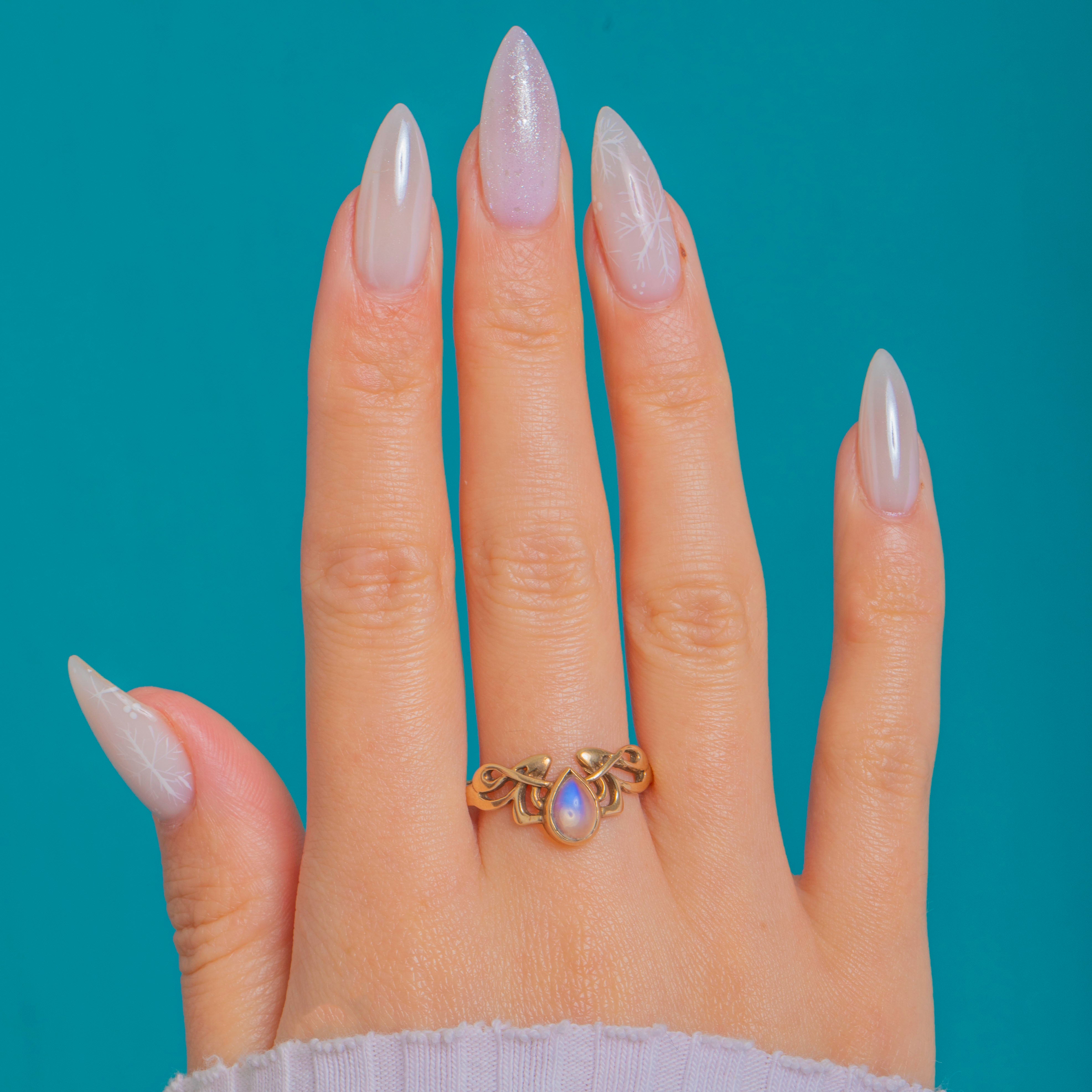 A dreamy Moonstone shimmers at the heart of this 9ct Gold ring, its pear-shaped cabochon glowing with ethereal blue-lilac adularescence. The gemstone is cradled in a smooth bezel setting, giving a sleek, elegant profile that’s both refined and wearable.