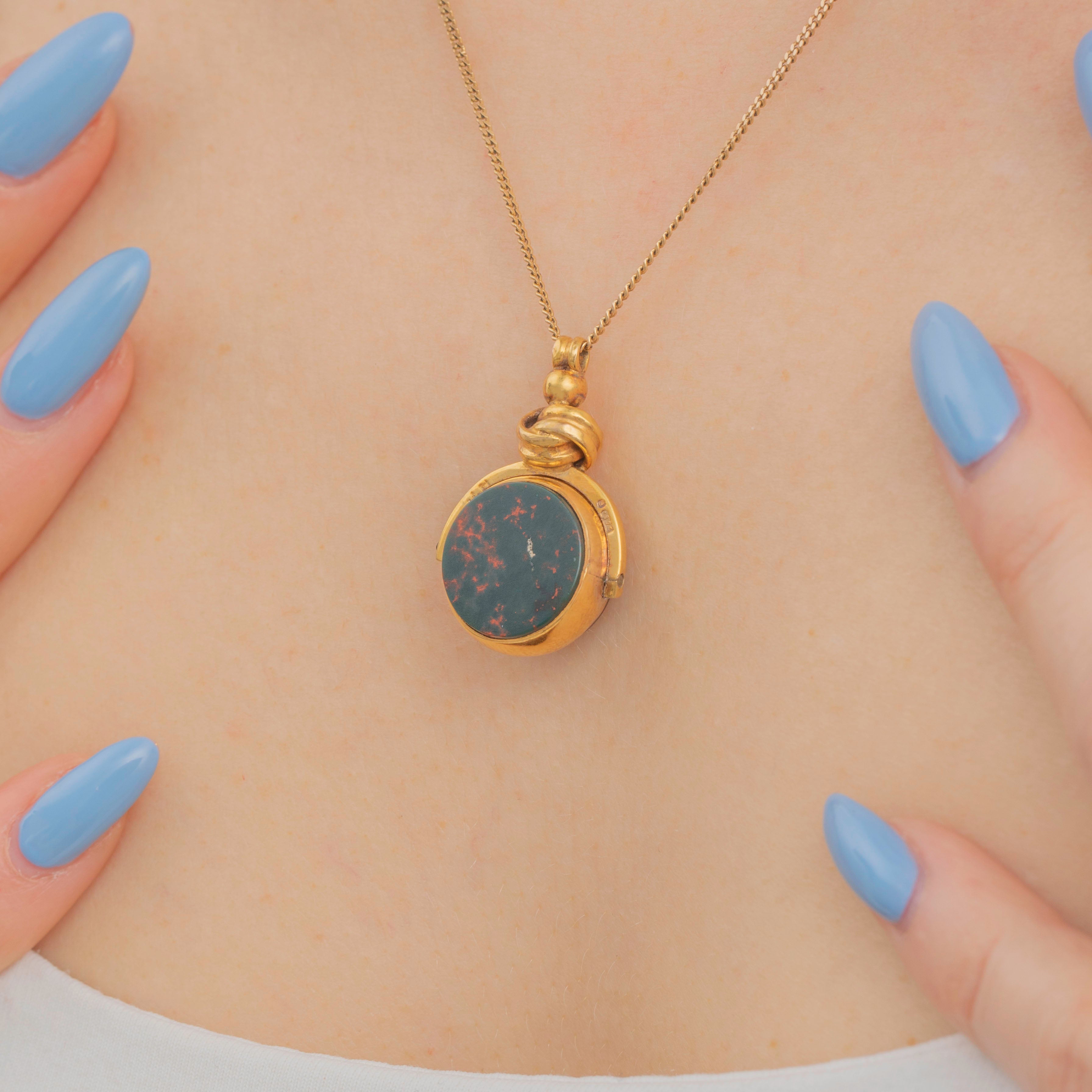 Her Carnelian face boasts a deep crimson red hue and her deep green Bloodstone face is speckled with flashes of fiery oranges. A beacon of warmth and antique charm, this spinner fob pendant would look beautiful suspended from a fine chain and is perfect for both everyday and occasion wear!