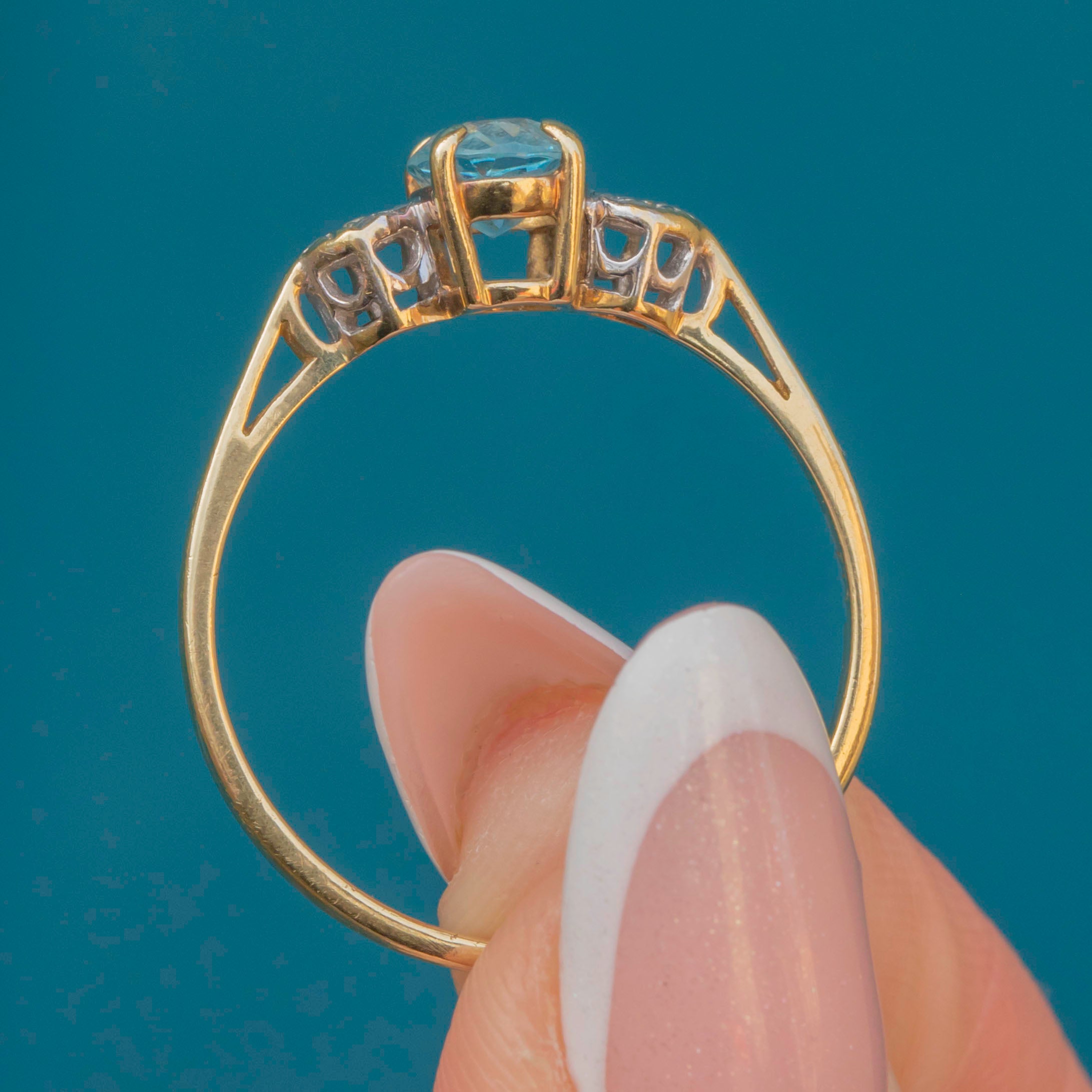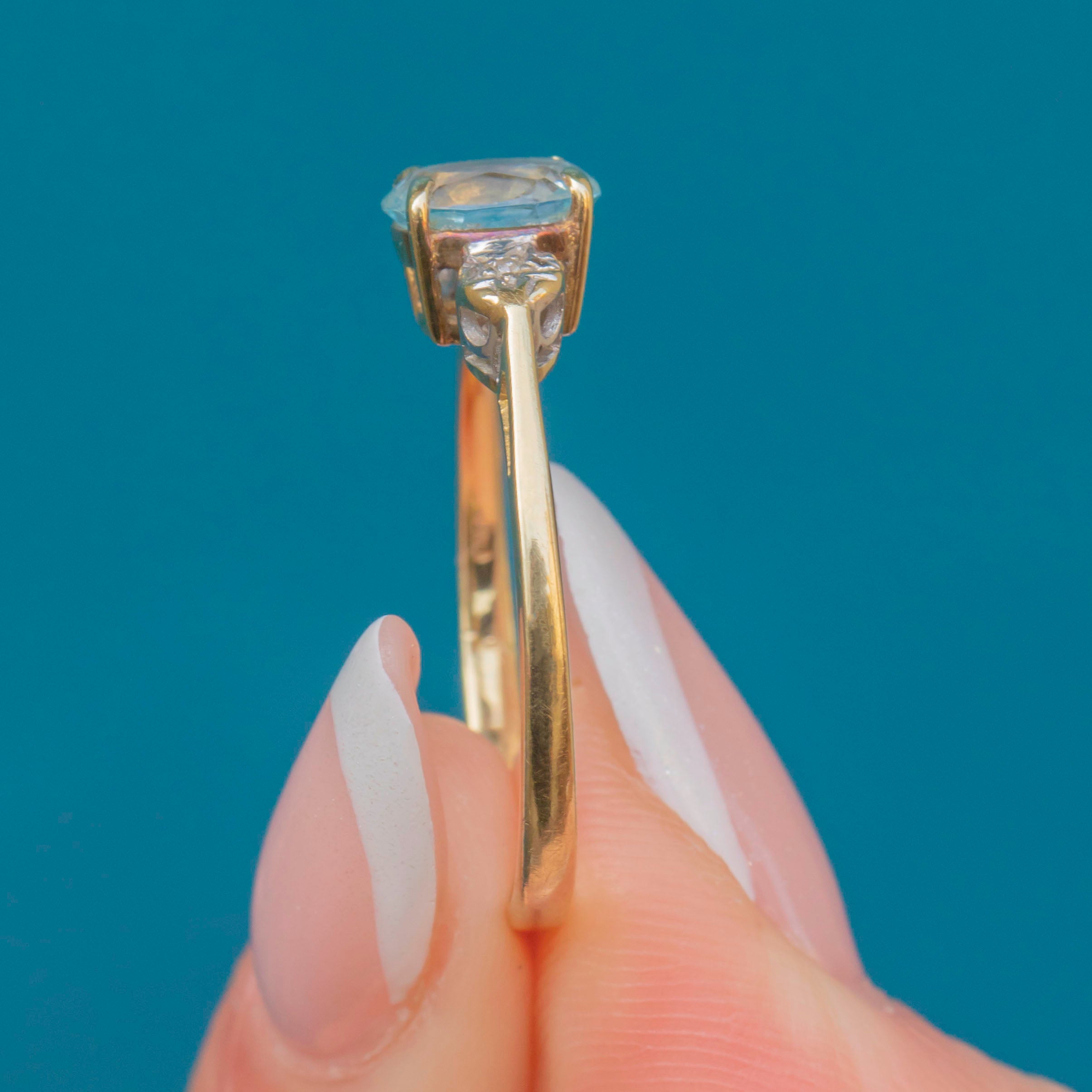EXCELLENT: This 9ct Gold blue Topaz trilogy ring is in excellent condition! Each gemstone is radiant and set securely. With a glossy Gold band and very minor signs of wear, you can wear her with confidence!