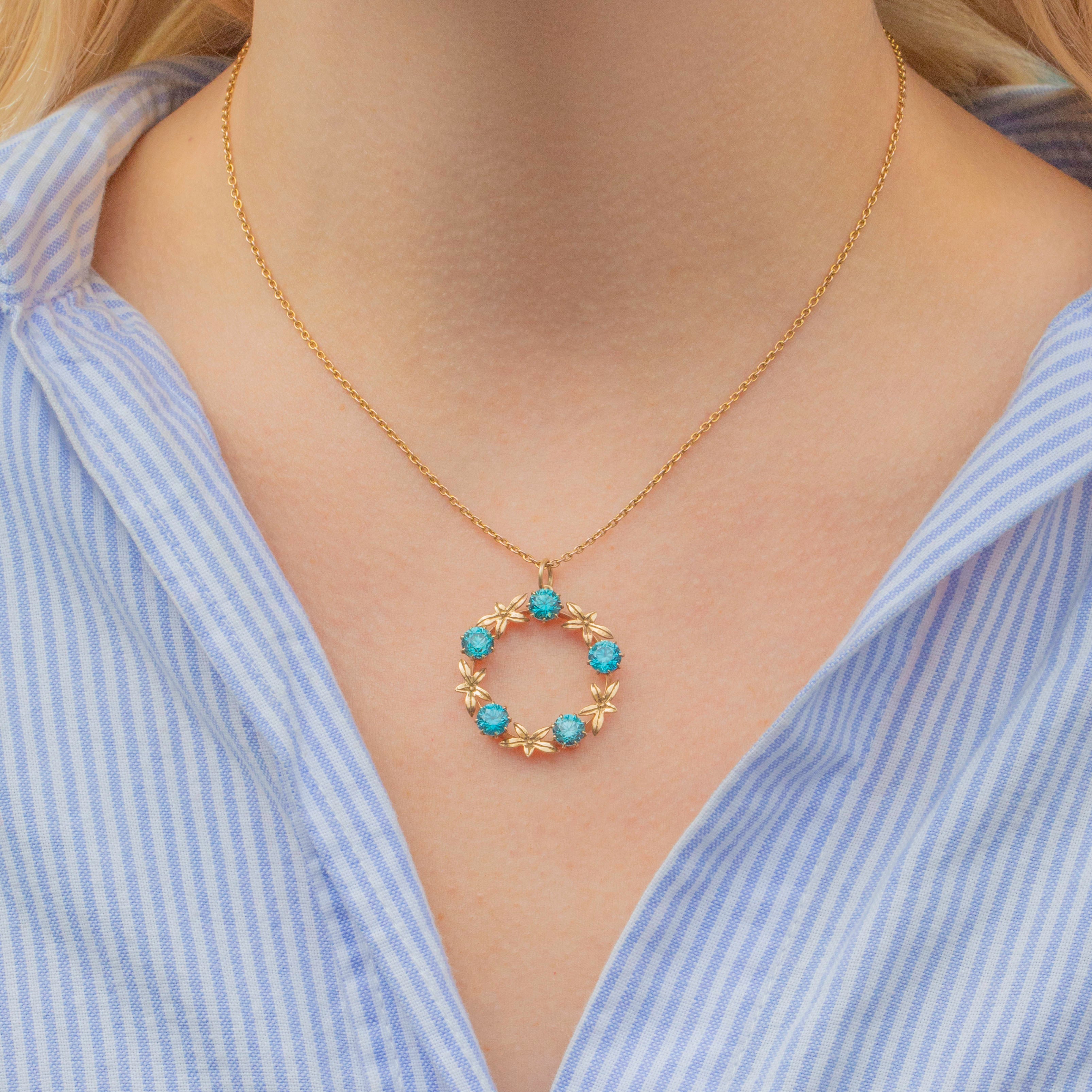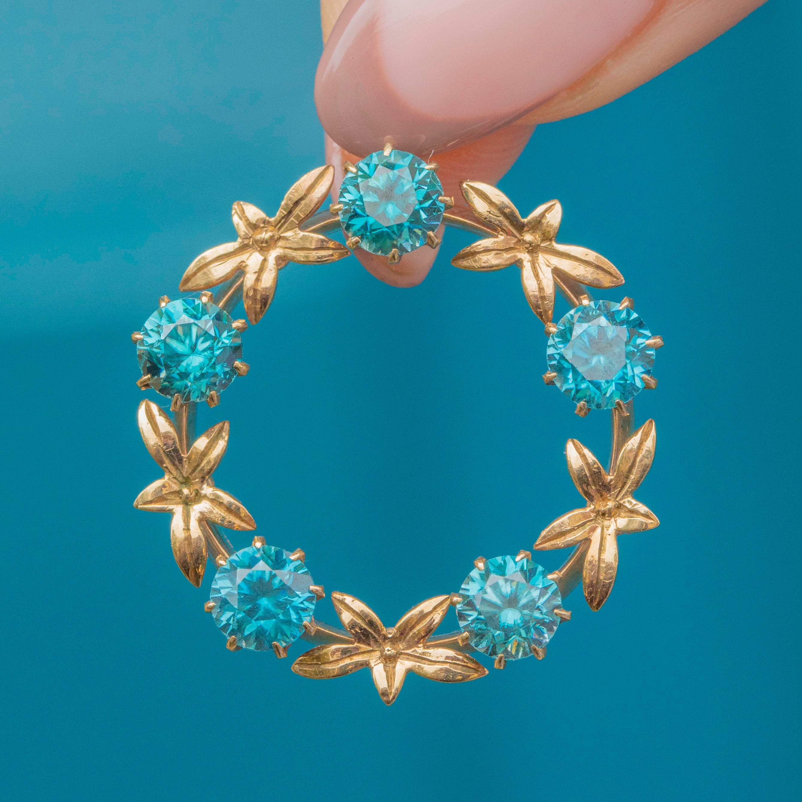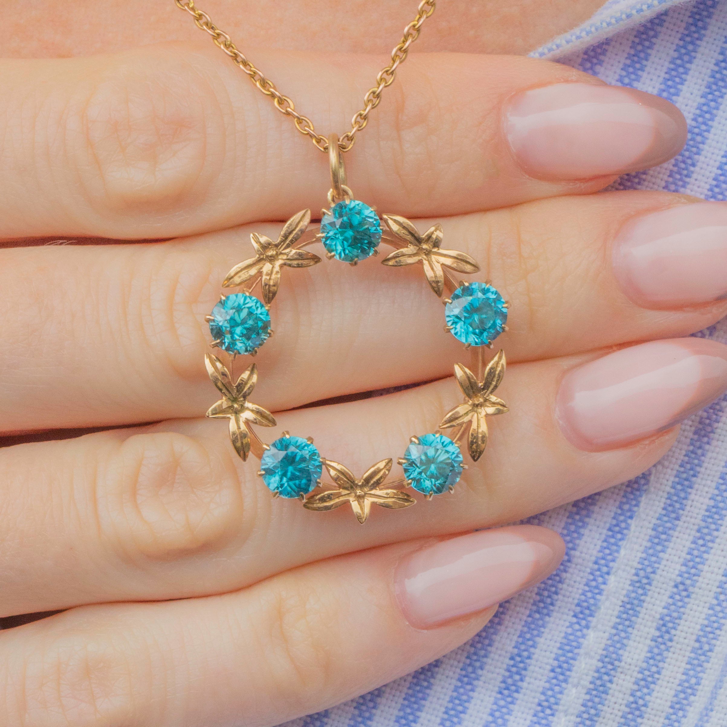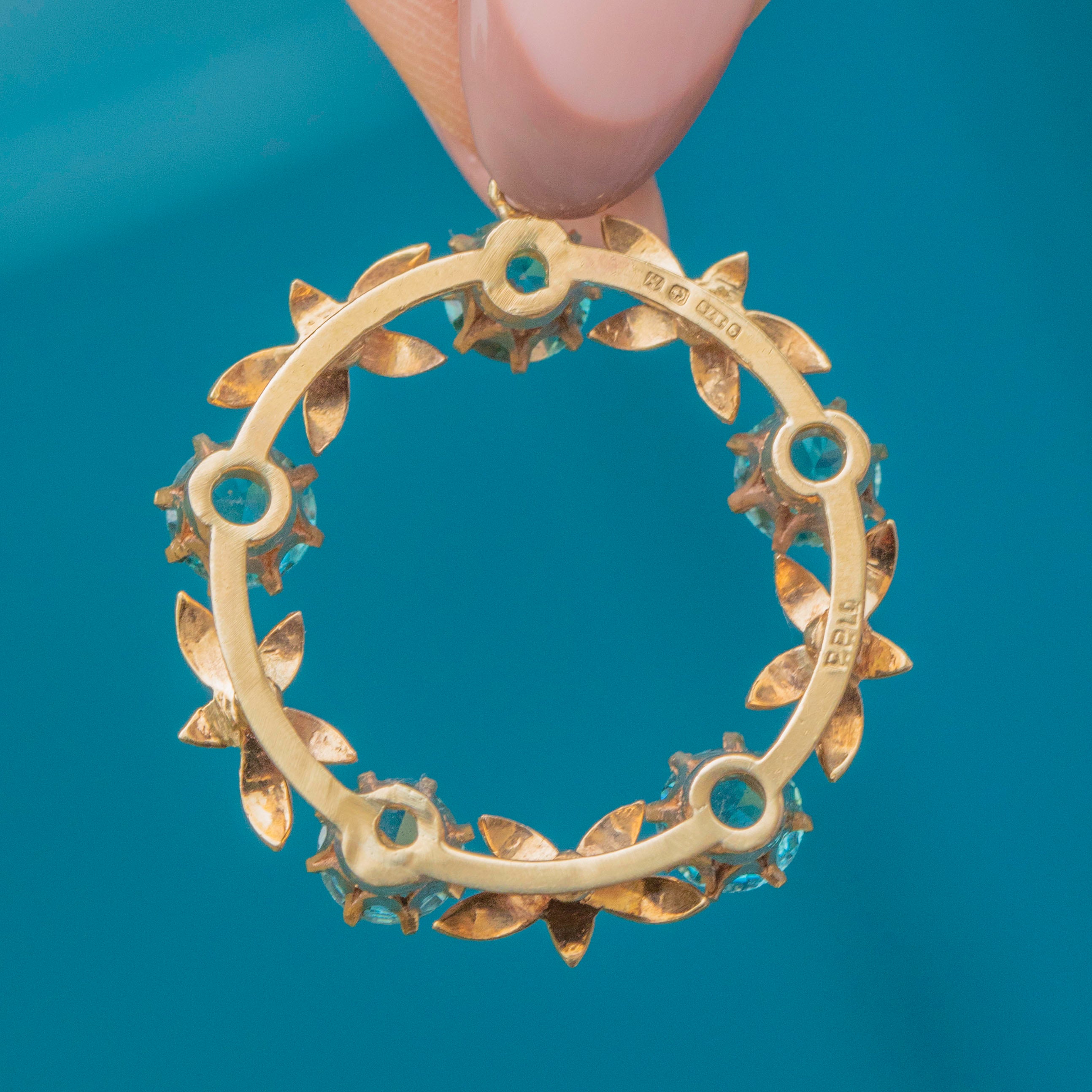 VERY GOOD-EXCELLENT. This 9ct Gold blue Zircon roundel pendant is in wonderful condition. The Zircons are pristine, with no chips or abrasions, and are secure within their claw settings. There is subtle evidence of a previous brooch conversion on the back, but this has been carried out well and the back is smooth and comfortable against the skin. The Gold has a lovely saturation and the floral details have remained defined and are securely affixed.