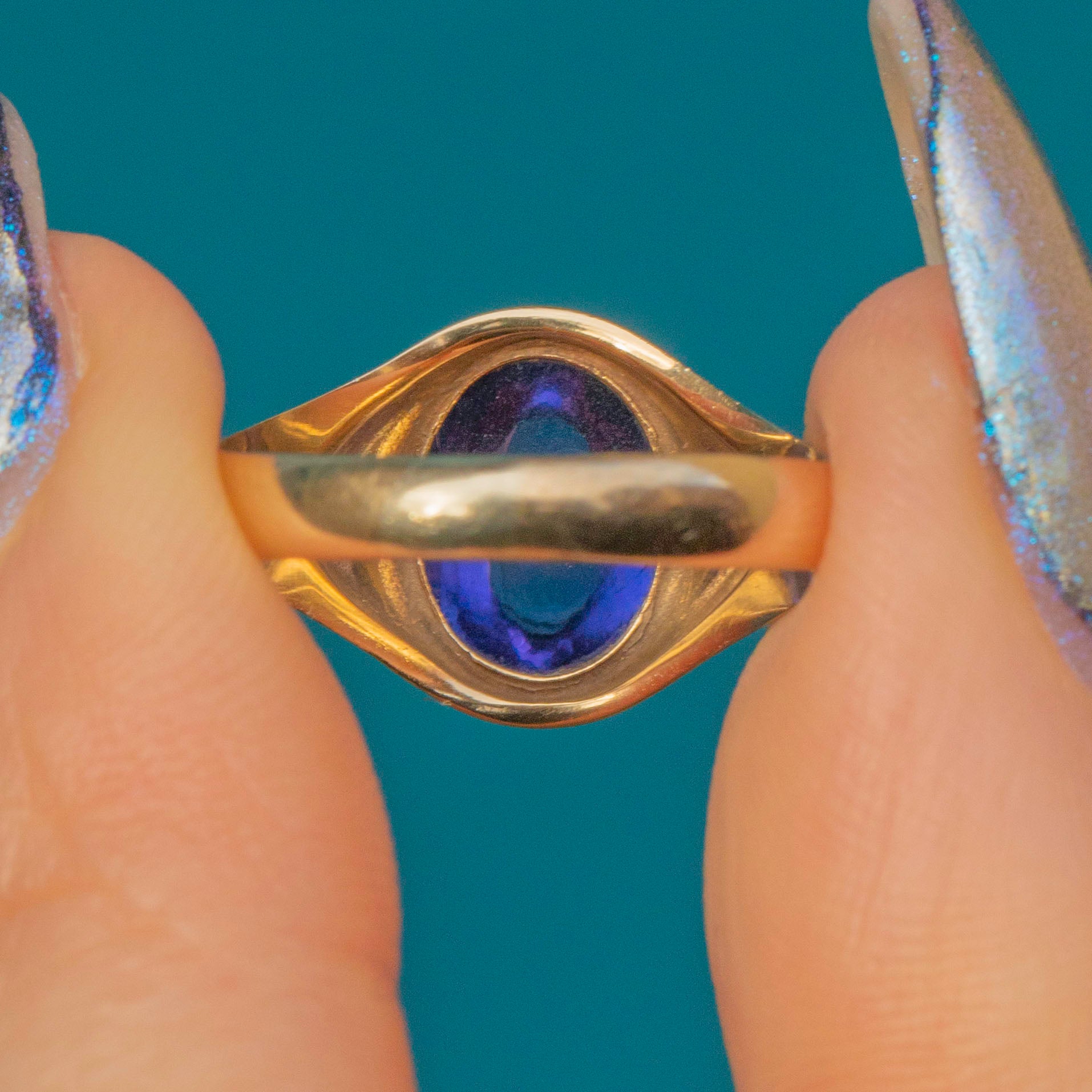 A fabulous glowing 9ct Gold purple Sapphire cabochon ring full of life and light! This mid-century delight boasts a pretty 3.20ct, with blue-purple base tones and flashes of indigo and mauve she is spectactular.