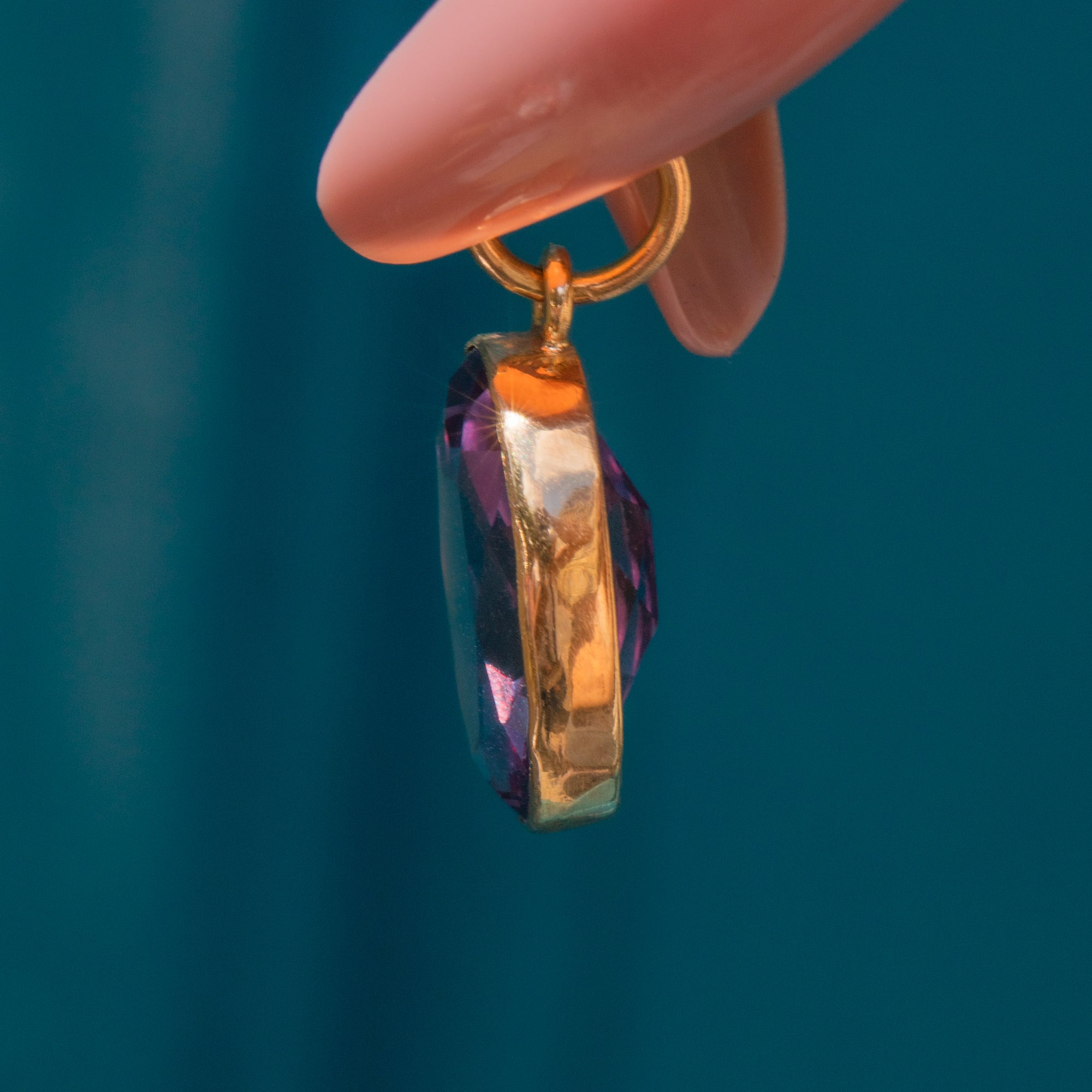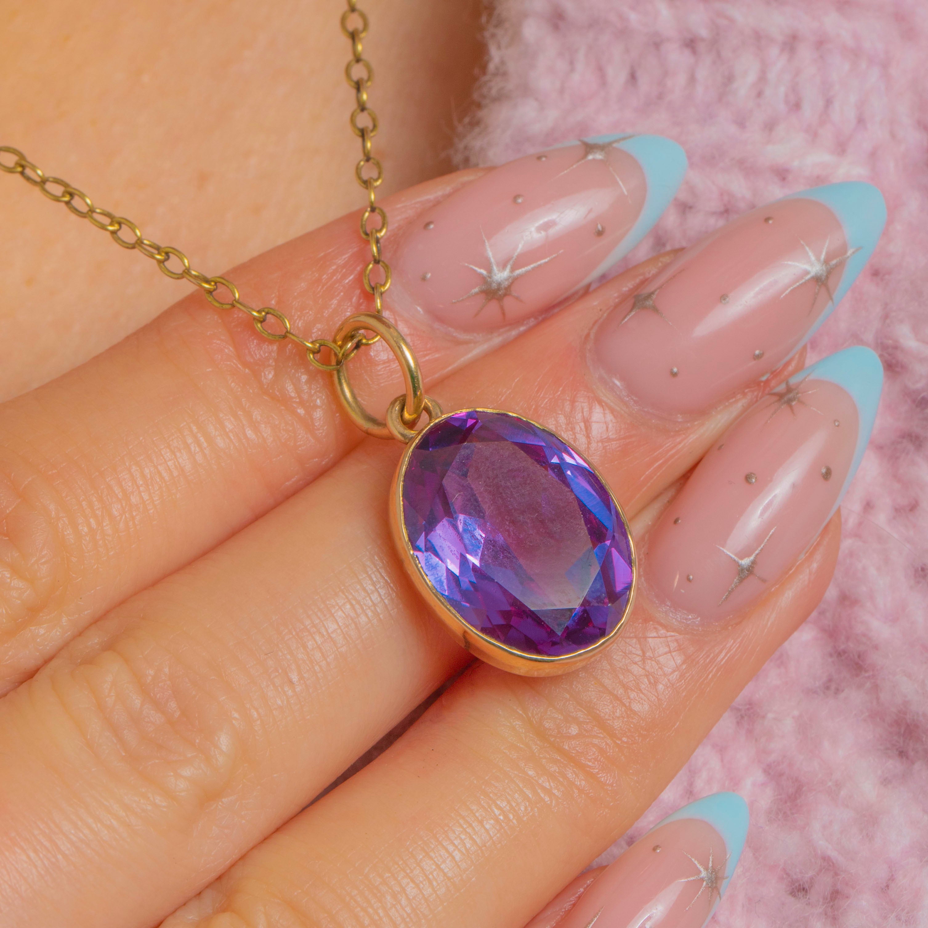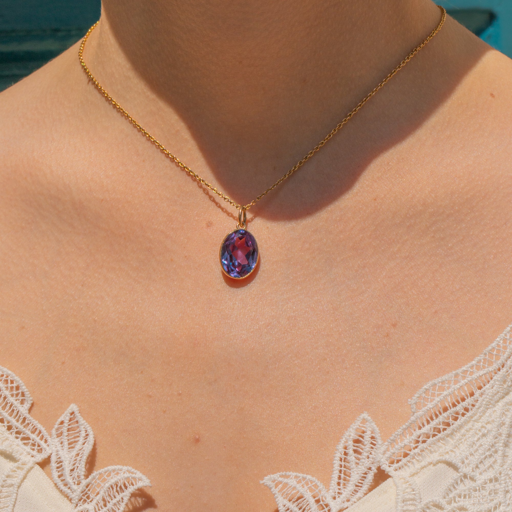 We are pleased to present this rare 9ct Gold colour change Sapphire pendant! You will be mesmerised by the array of spectacular deep violet hues as the Art Deco pendant catches the light; she is truly a sight to behold.