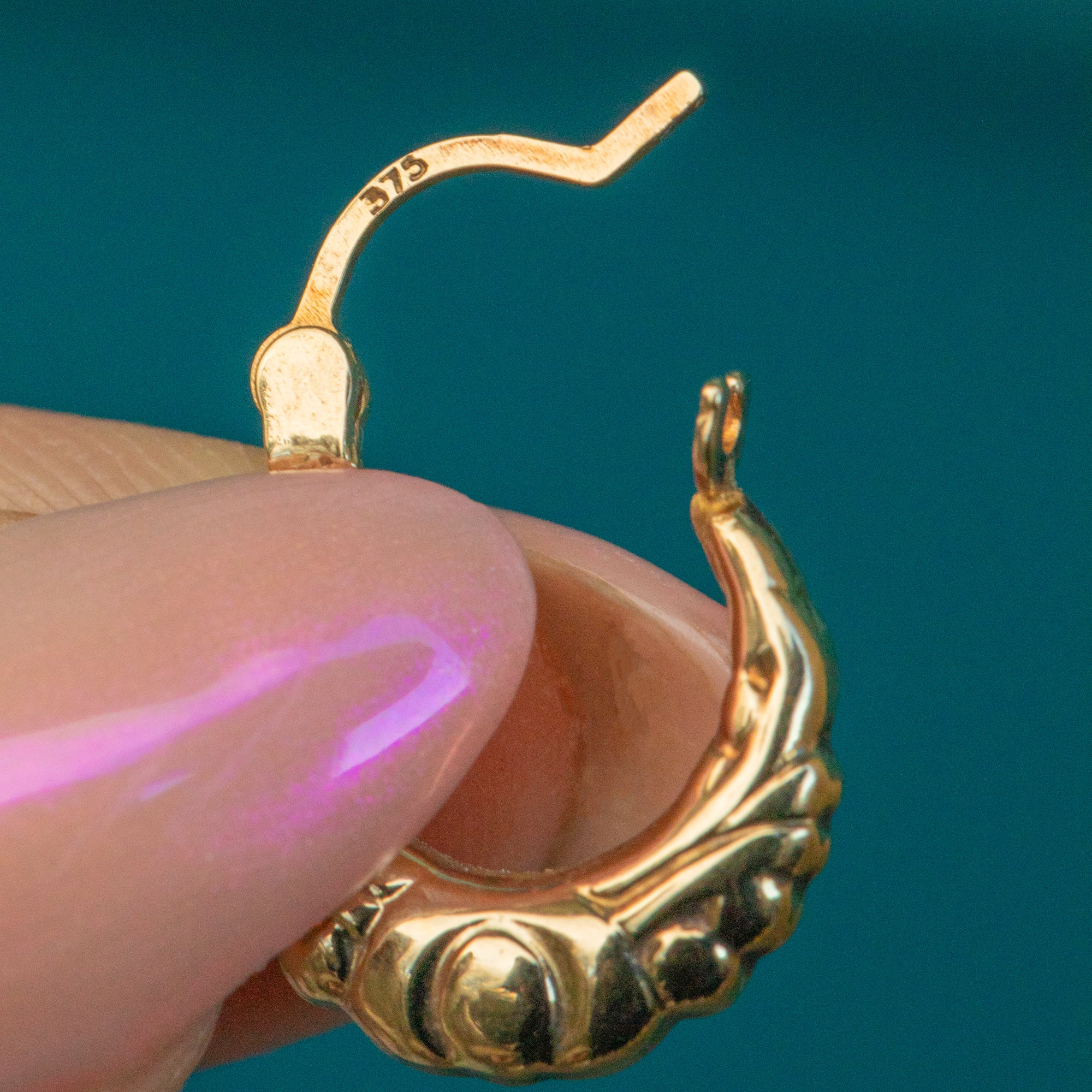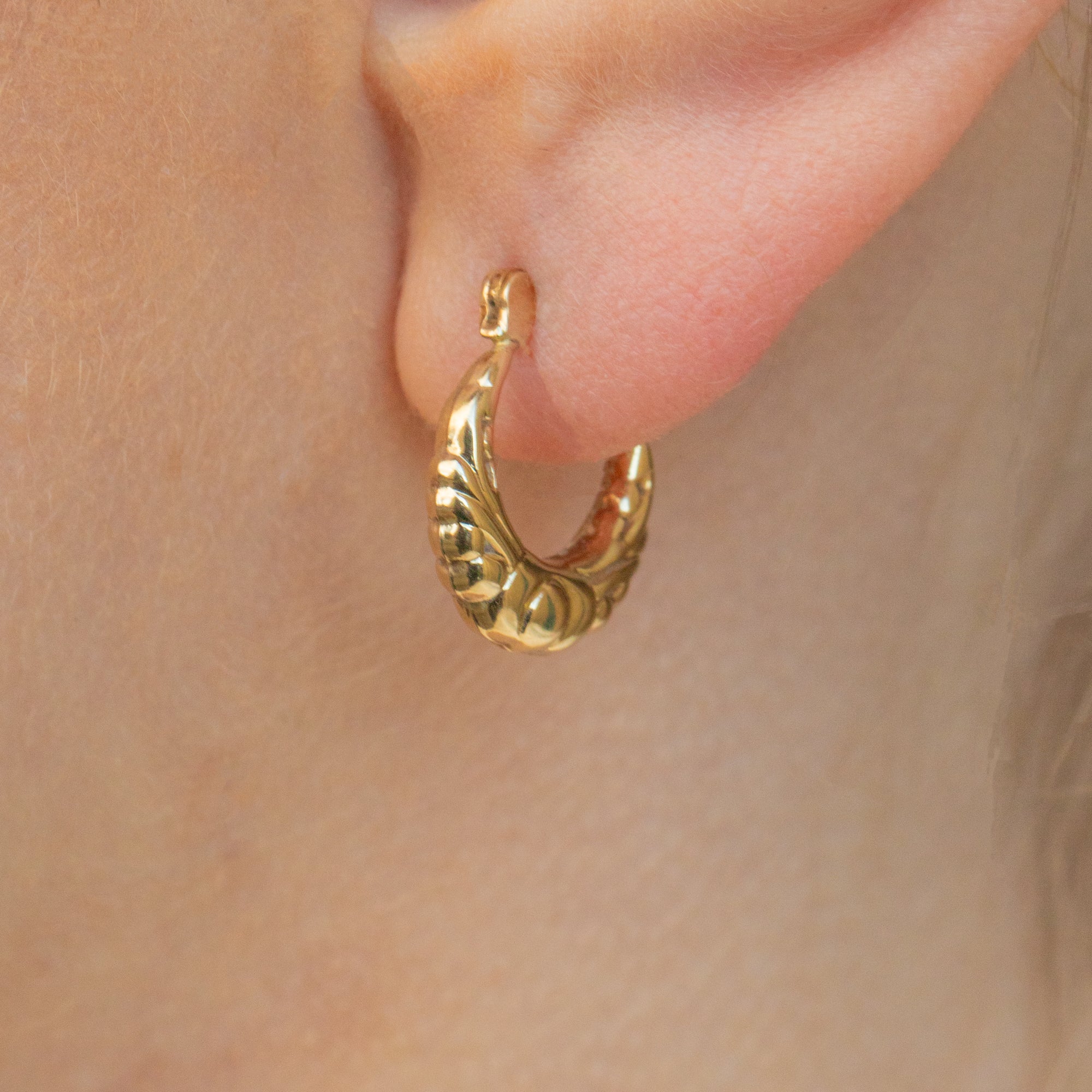 EXCELLENT. This pair of 9ct Gold creole huggie hoop earrings are in excellent condition. The earrings have kept their form well and the engraved details have remained crisp. The have levers slot perfectly into place, allowing you to wear them with confidence.