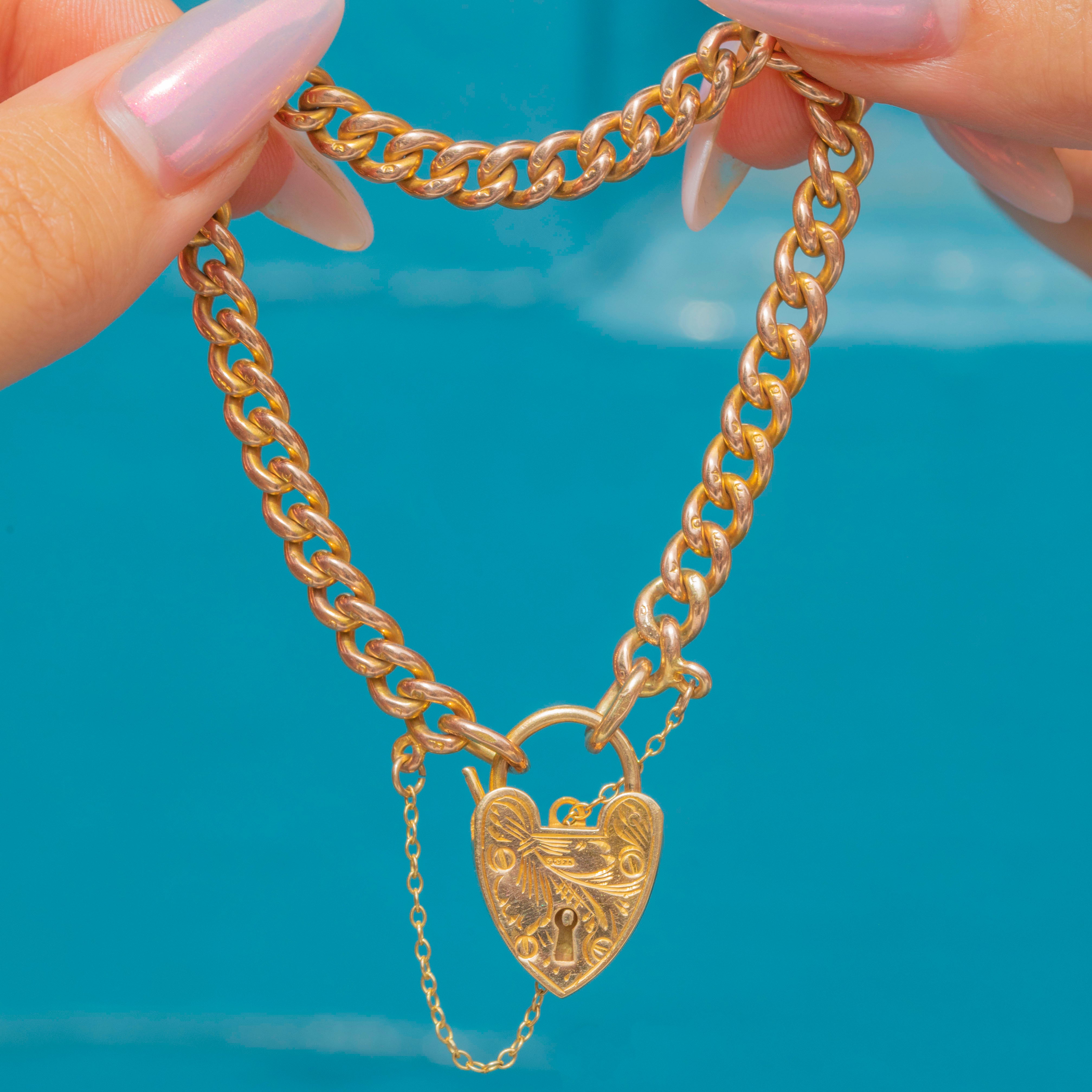The cute heart padlock is a later addition, dating to 1959, and displays whimsical engravings sweeping across its front. Steeped in romantic sentiment and exuding luxury from its every curve, this Victorian Gold bracelet would make a lovely gift choice or special treat for yourself!