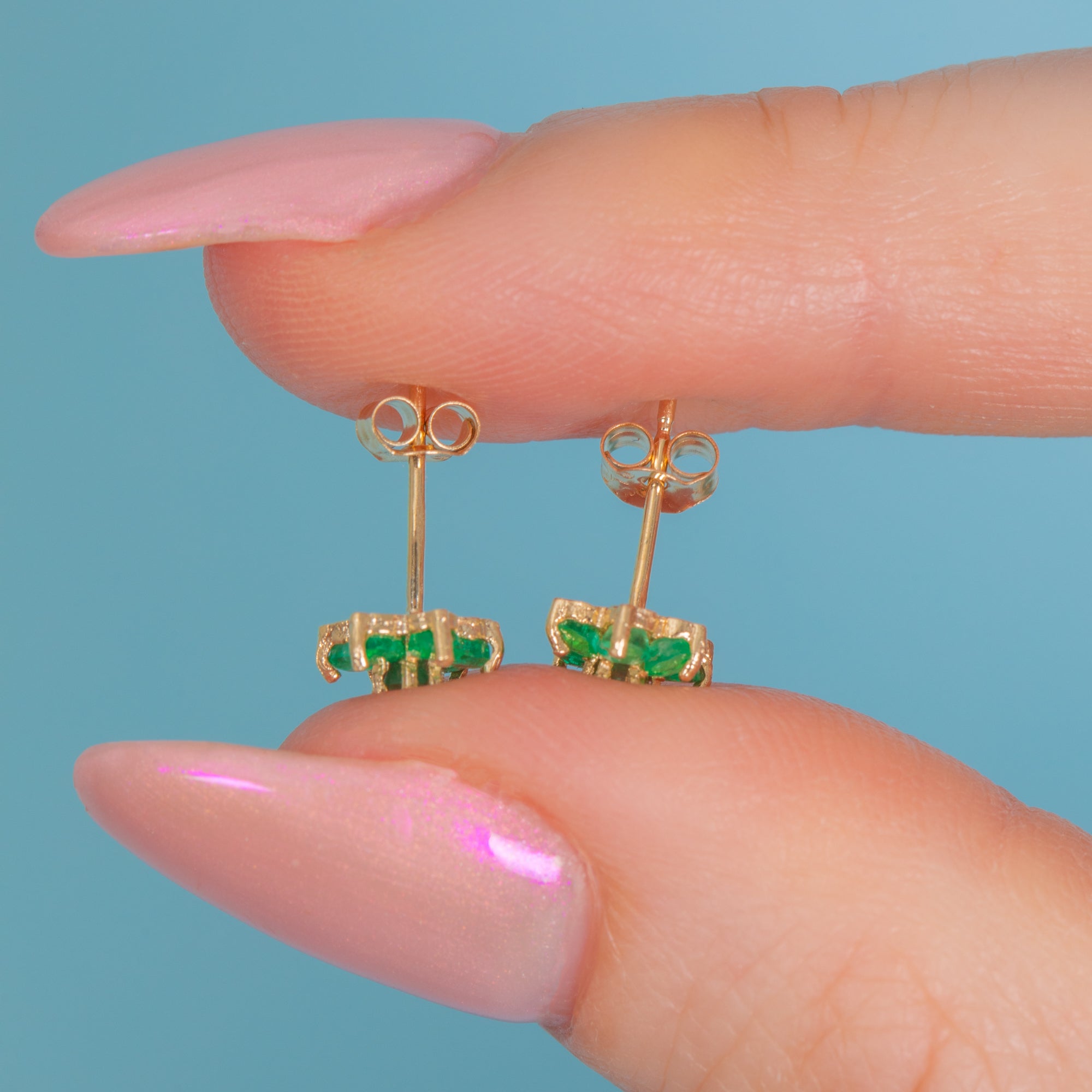 EXCELLENT. This pretty pair of 9ct Gold Emerald cluster stud earrings are in perfect condition and are ready to be added to any jewellery lovers' collection. The Emeralds are free from any chips and are all securely held within their claw settings. The Gold is bright and the butterfly backs ensure secure and comfortable wear. The beautiful greens of these Emerald stud earrings are sure to brighten up your day!