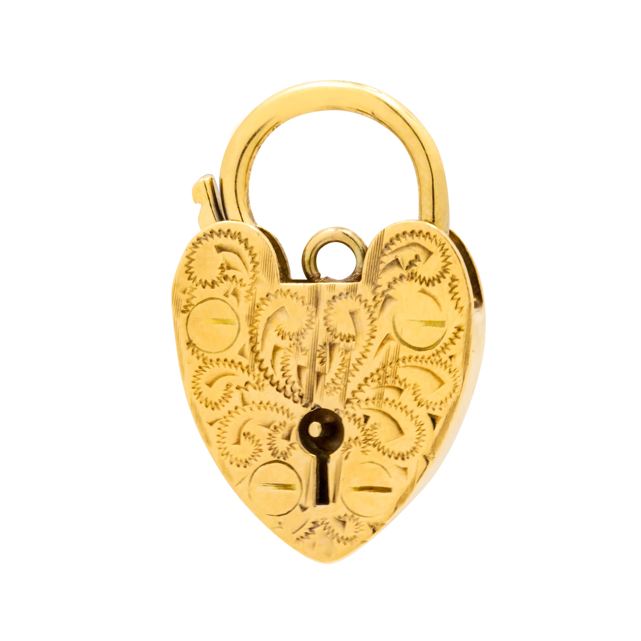 EXCELLENT. We are pleased to offer this 9ct Gold engraved heart padlock pendant in excellent condition! The Gold is buttery throughout and the engraved details have all remained crisp. The back of the pendant is smooth and free from dings or scratches. With a fully functioning clasp, you can wear this solid gold padlock with absolute confidence!