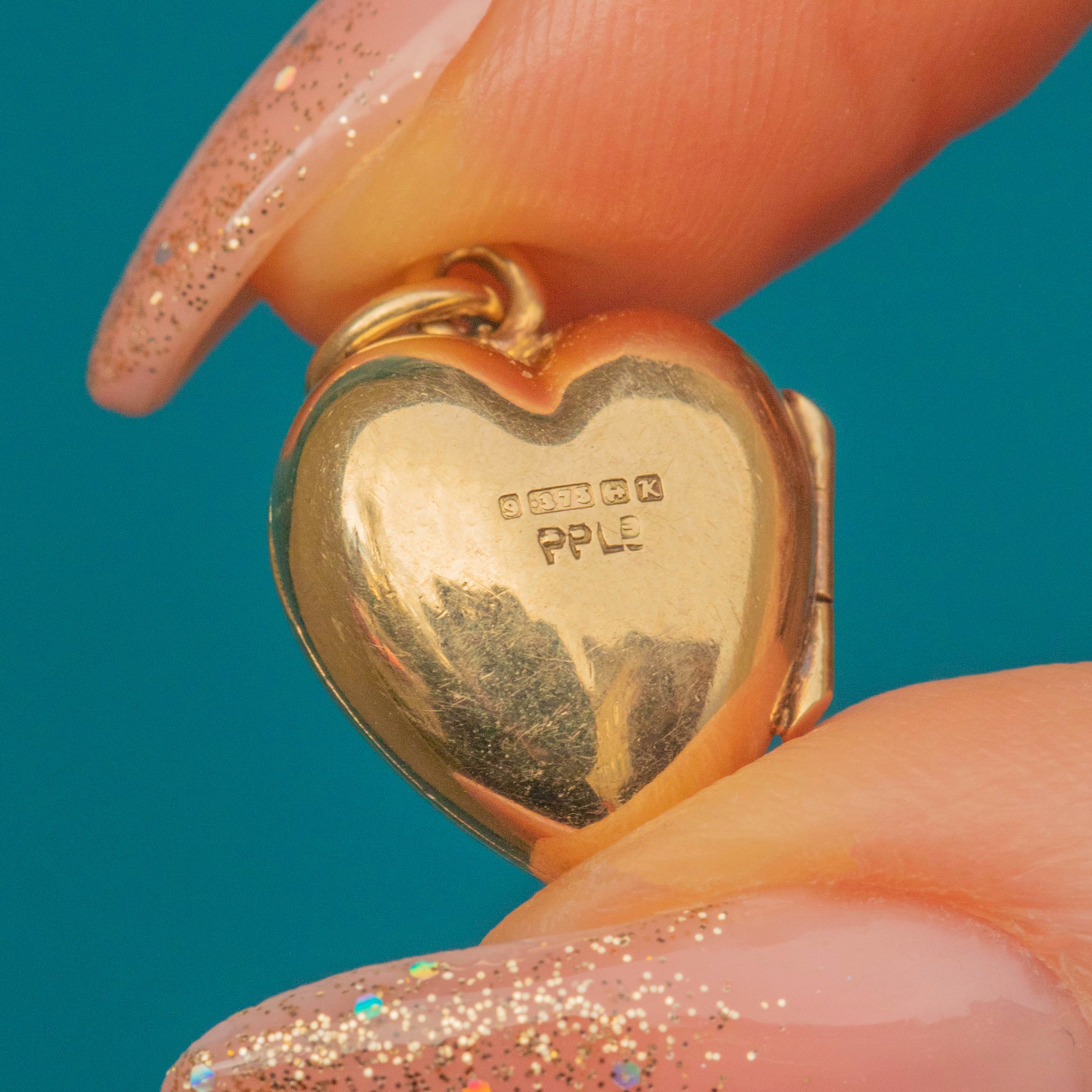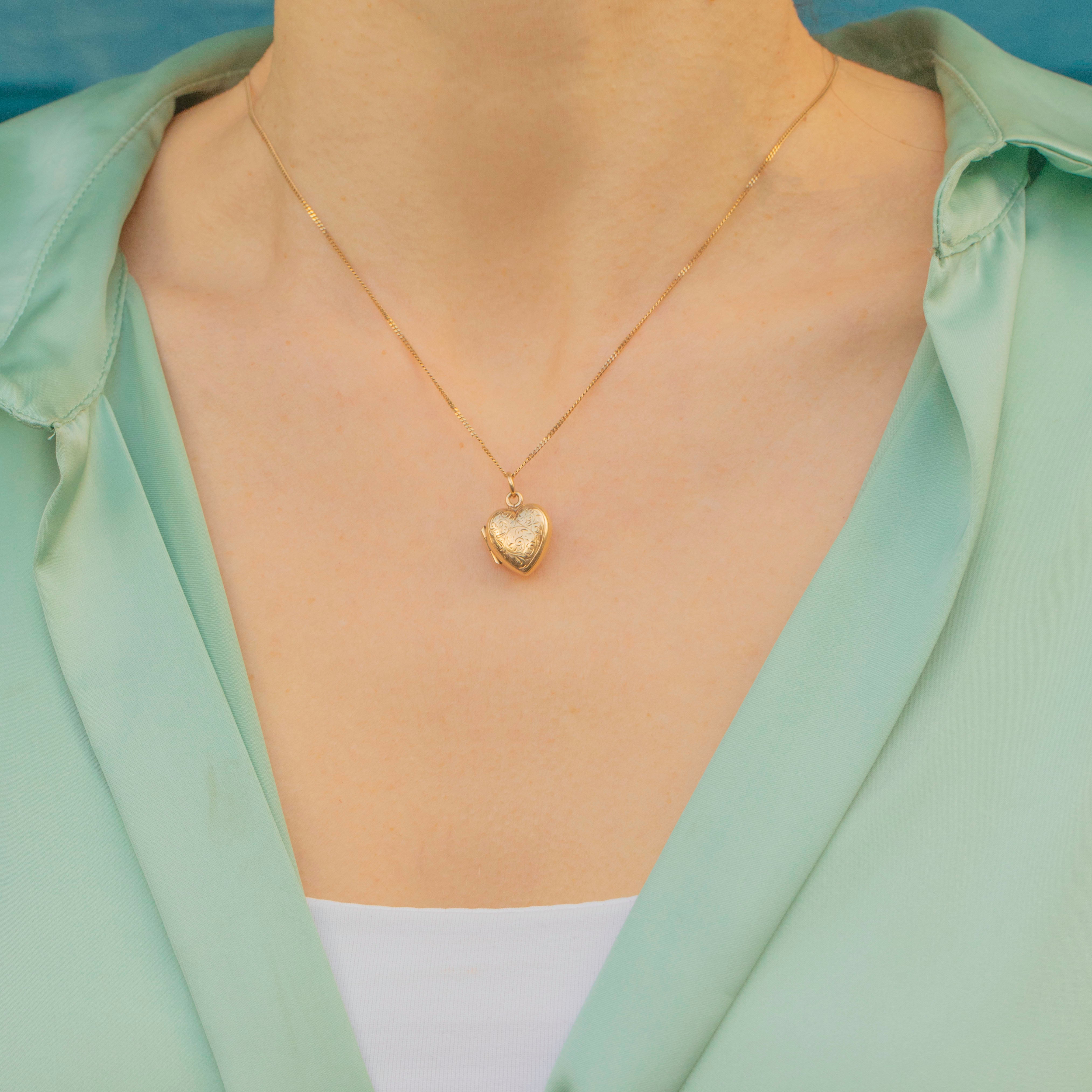 EXCELLENT This 9ct Gold Engraved Mini Heart Locket is in superb condition, with its intricate acanthus leaf engravings perfectly preserved. Tiny age-related dings blend seamlessly into the design, remaining unnoticeable when worn. It opens easily and secures tightly, keeping your treasured keepsakes safe and close to your heart.