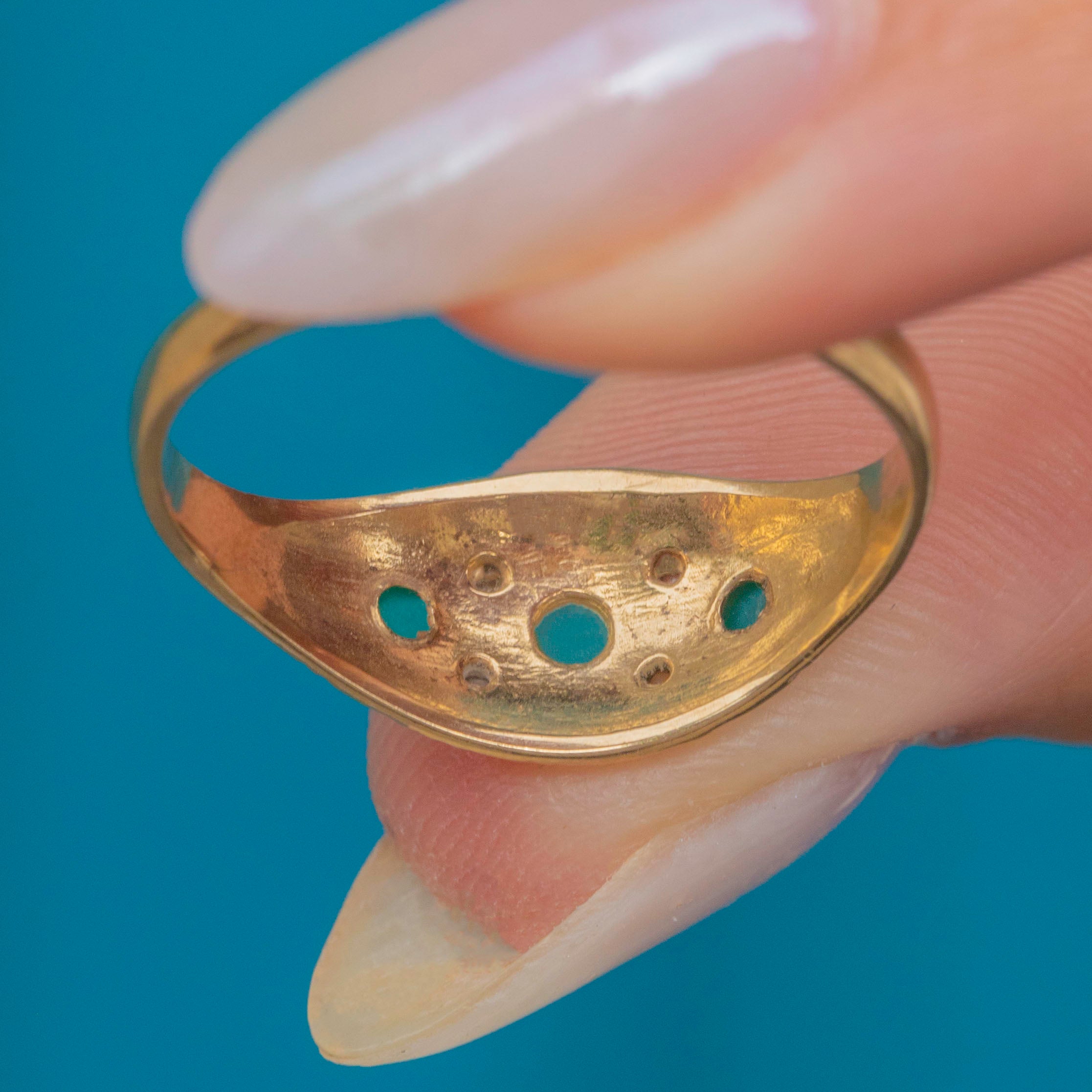 This eye-catching vintage gypsy ring is crafted from glossy 9ct Gold and inlaid with vibrant sky blue Turquoise cabochons and dainty Seed Pearls.
