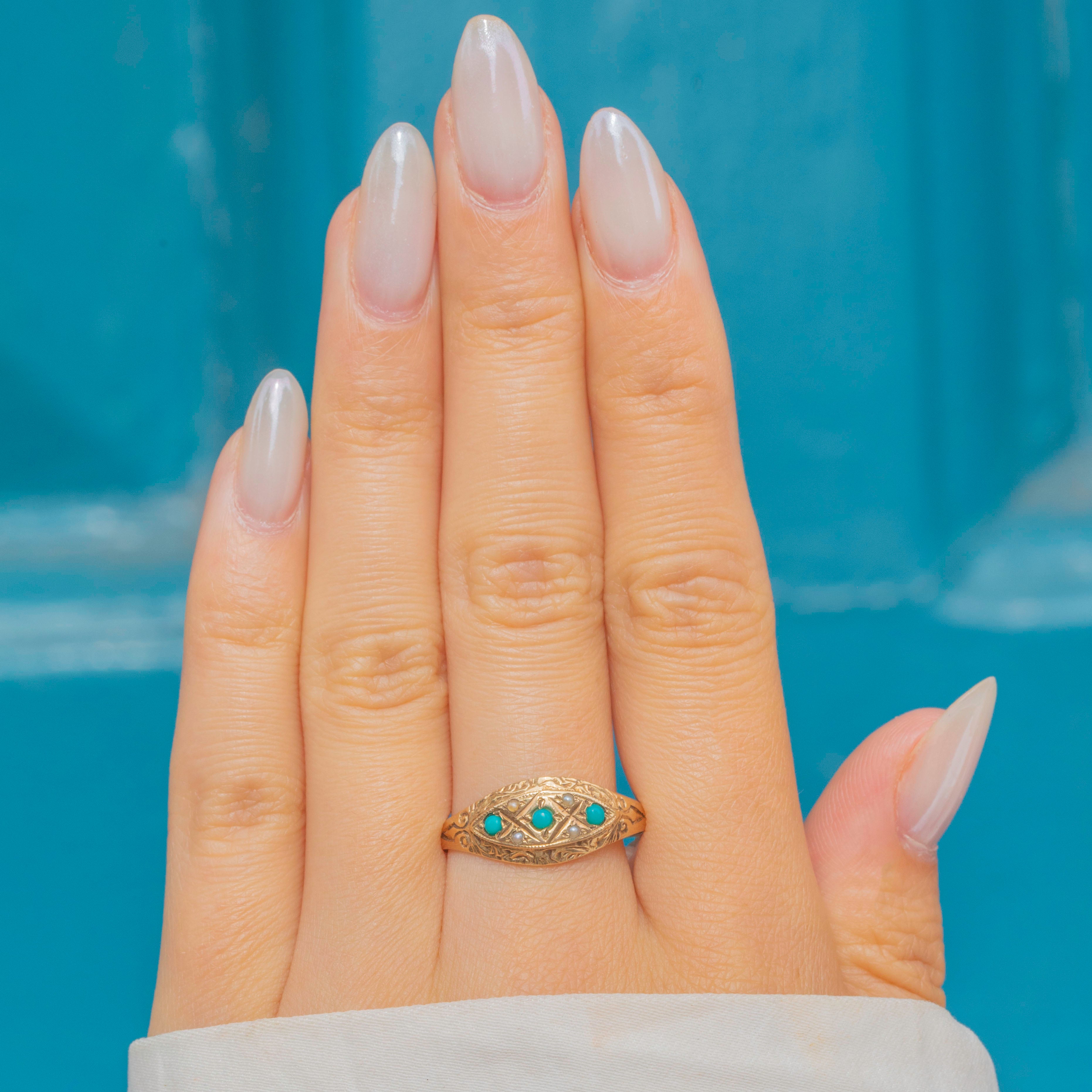9ct Gold Engraved Turquoise Pearl Gypsy Ring