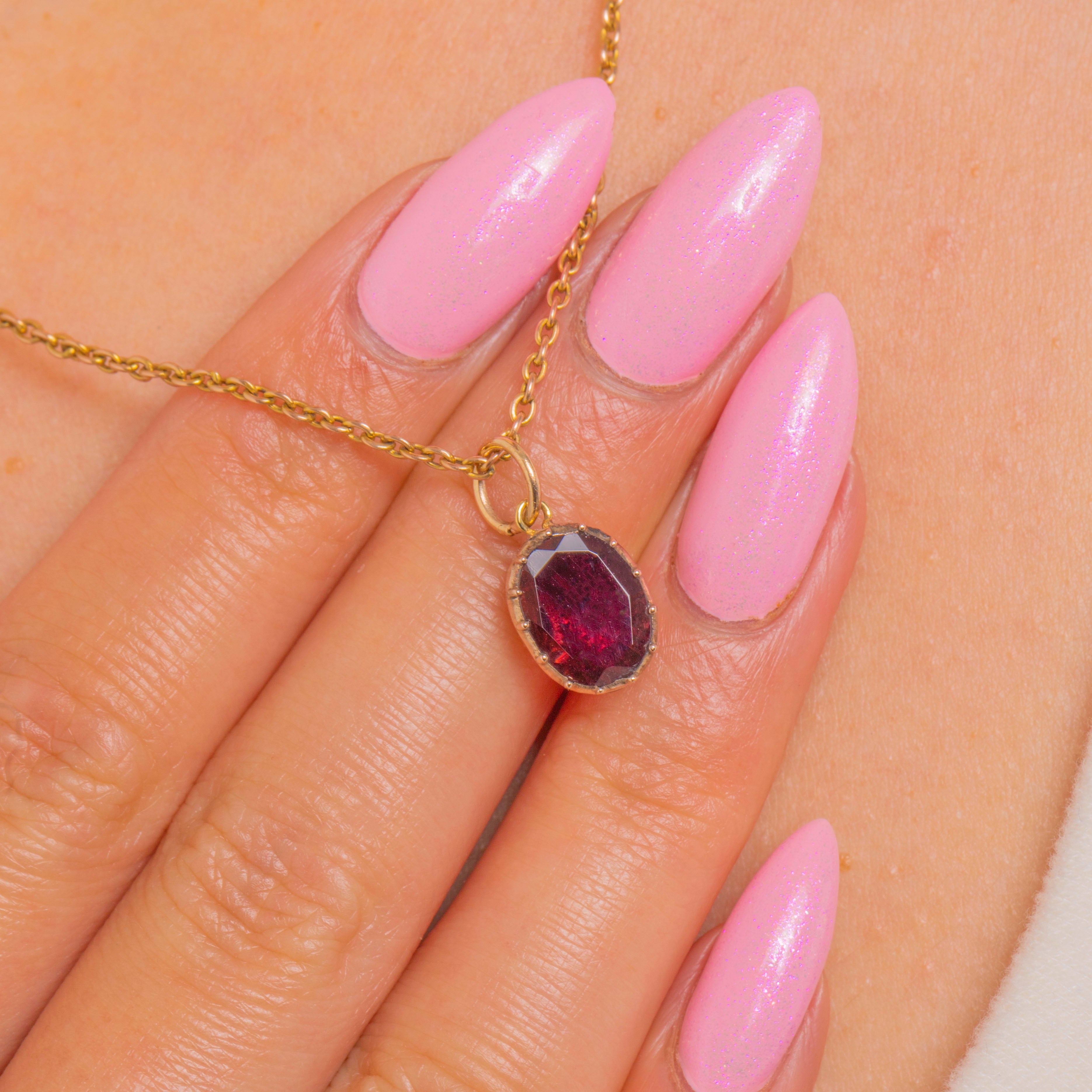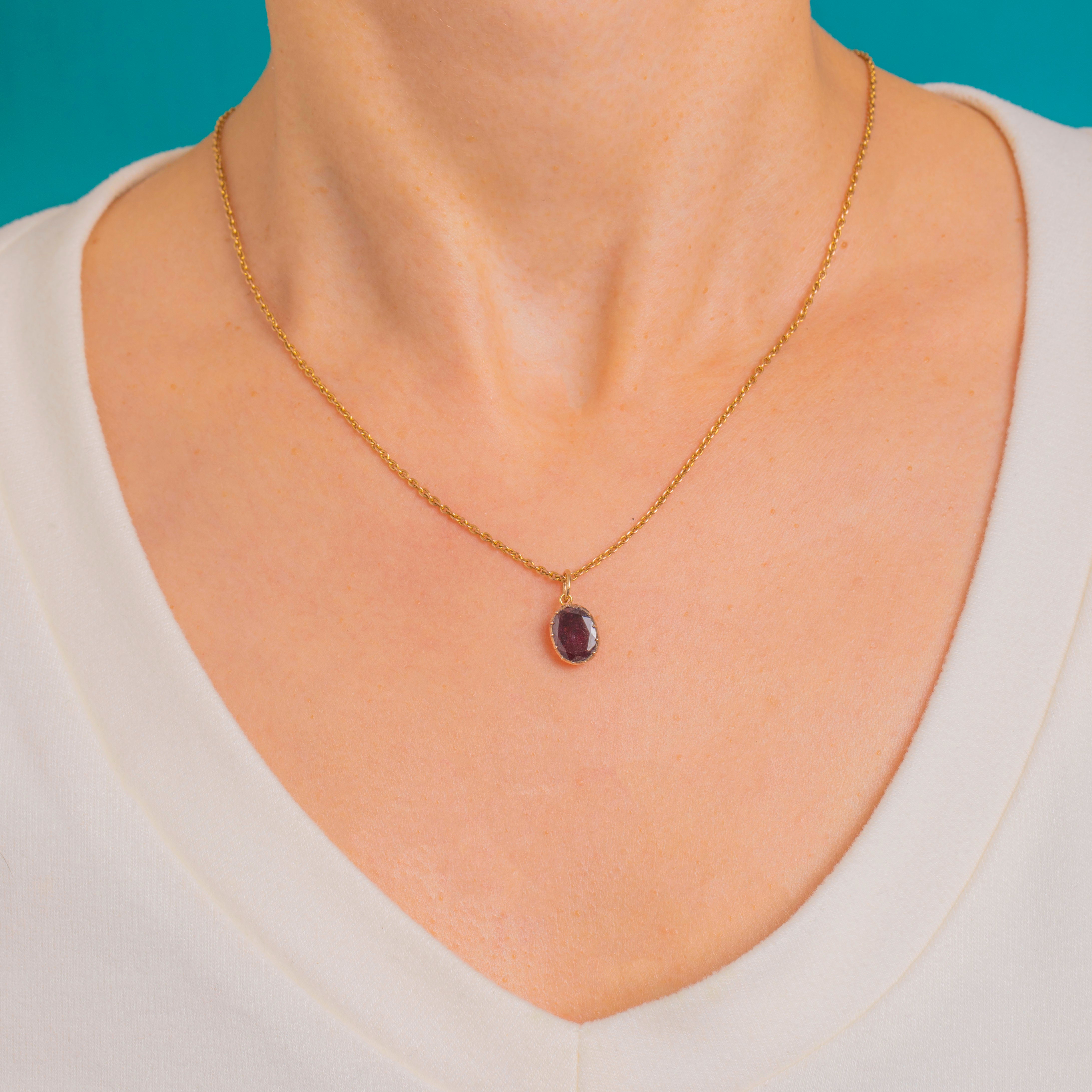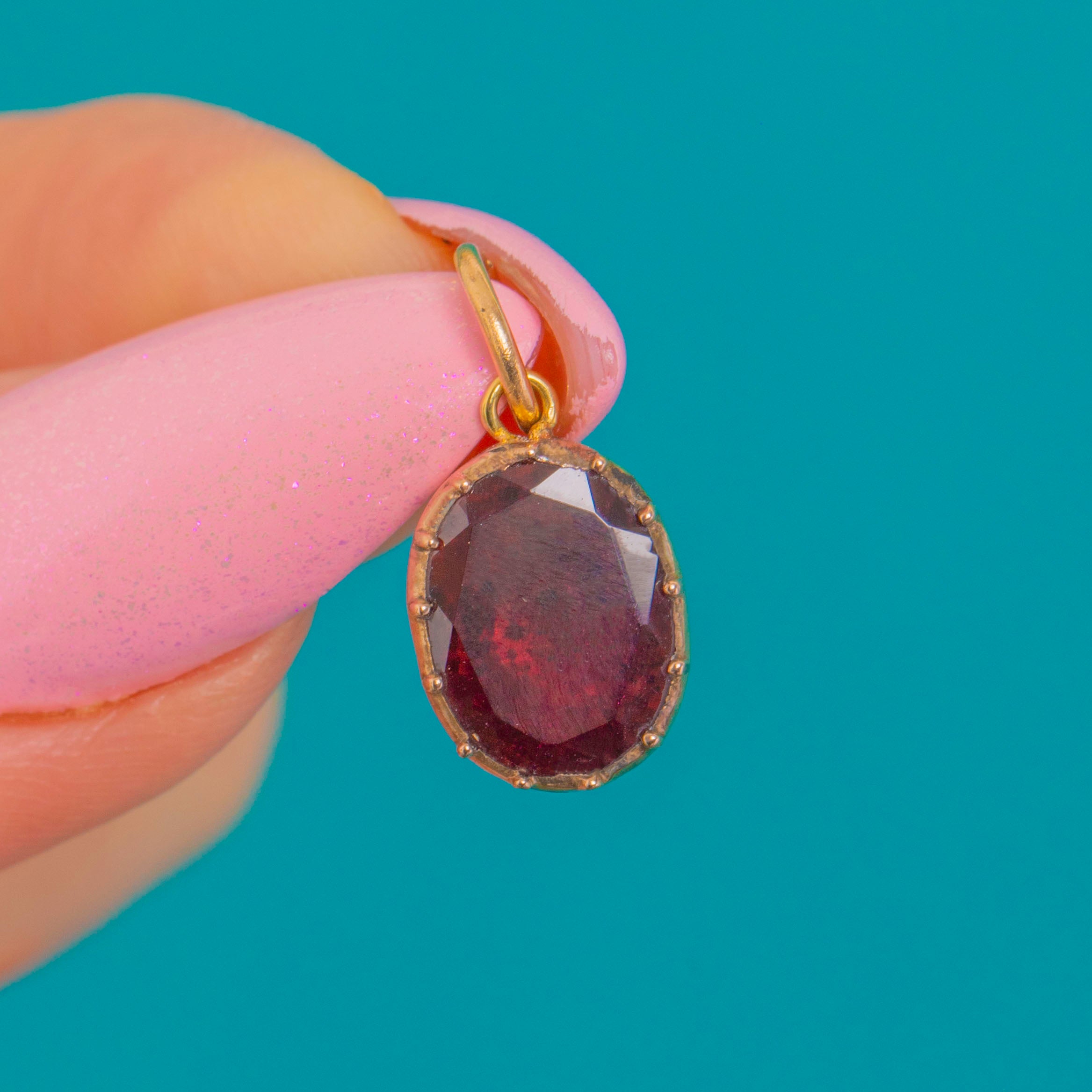 Suspended from a simple jump ring, it’s the perfect touch of antique colour to wear every day, whether solo or layered with other favourites. The Garnet’s rich hue glows against the warm Gold, offering a timeless pop of burgundy that feels both refined and romantic.