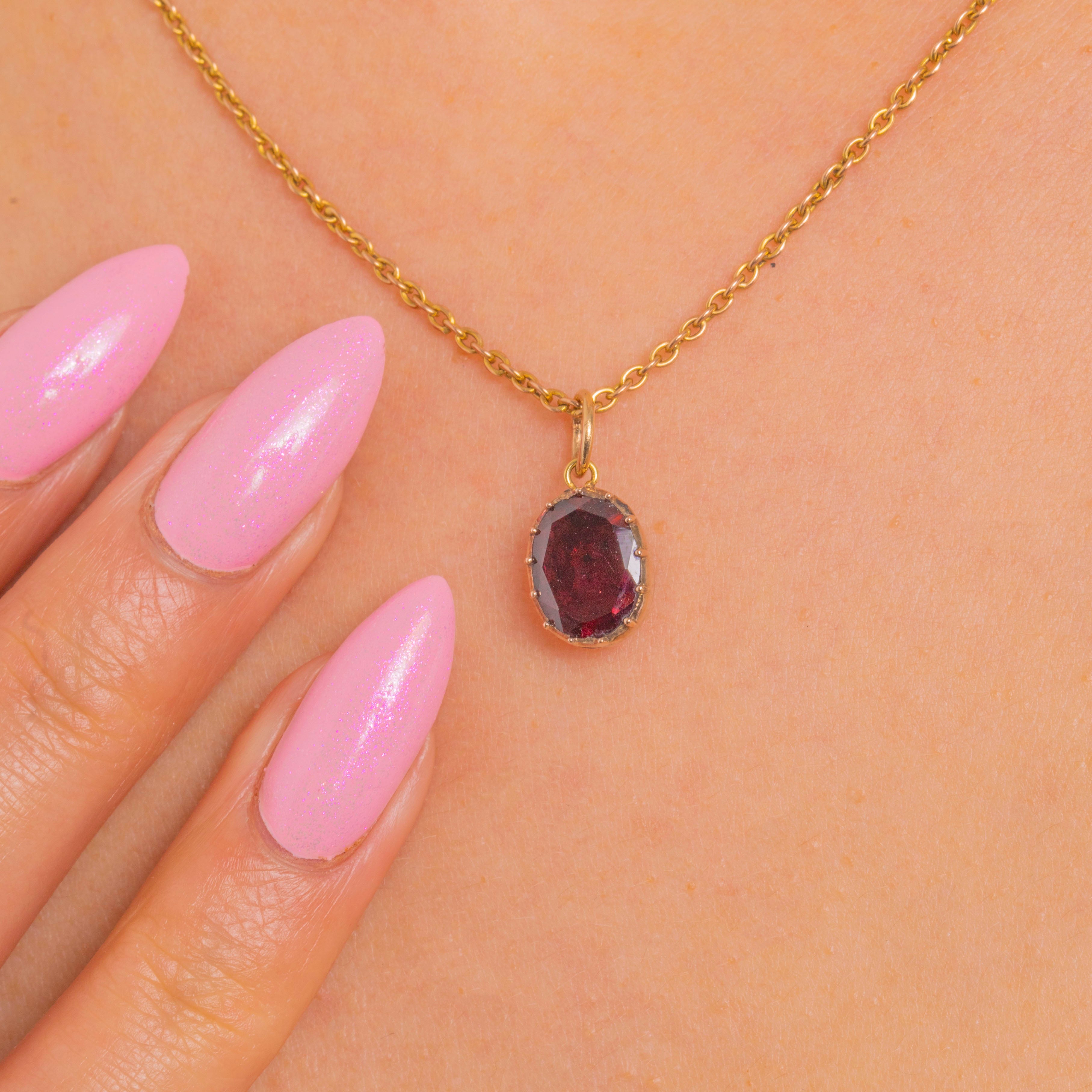 A petite Georgian treasure, this charming 9ct Gold pendant centres a deep wine-red flat-cut Garnet in a low, closed-back collet. The pie crust rim and hand-finished character lend it that irresistible early 19th-century allure—understated, intimate and beautifully stone-forward.