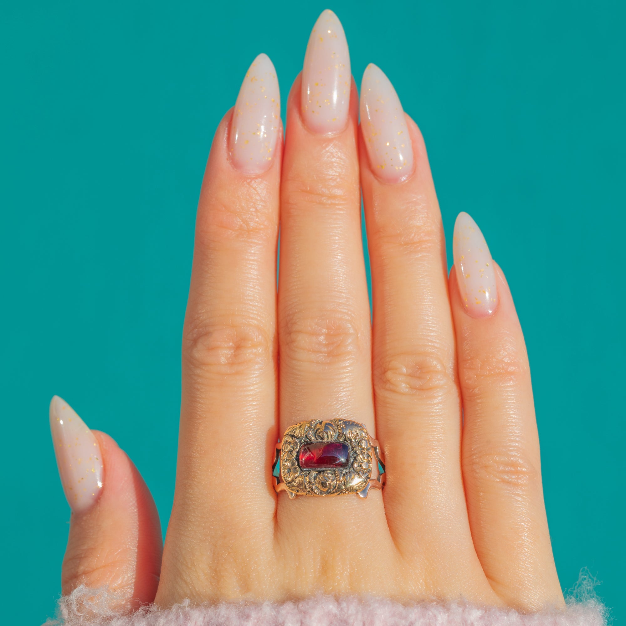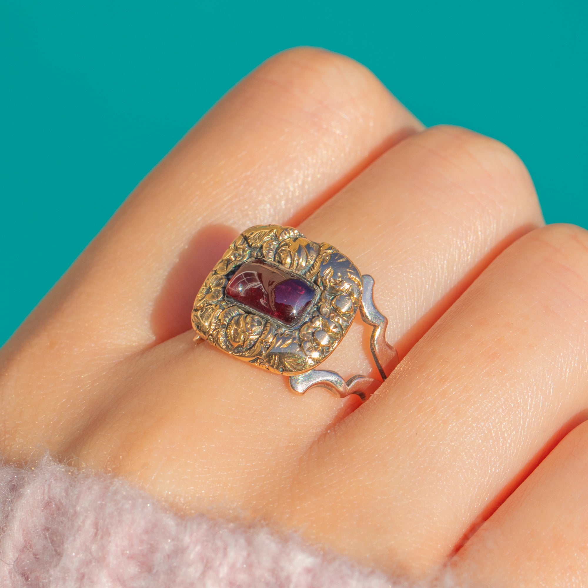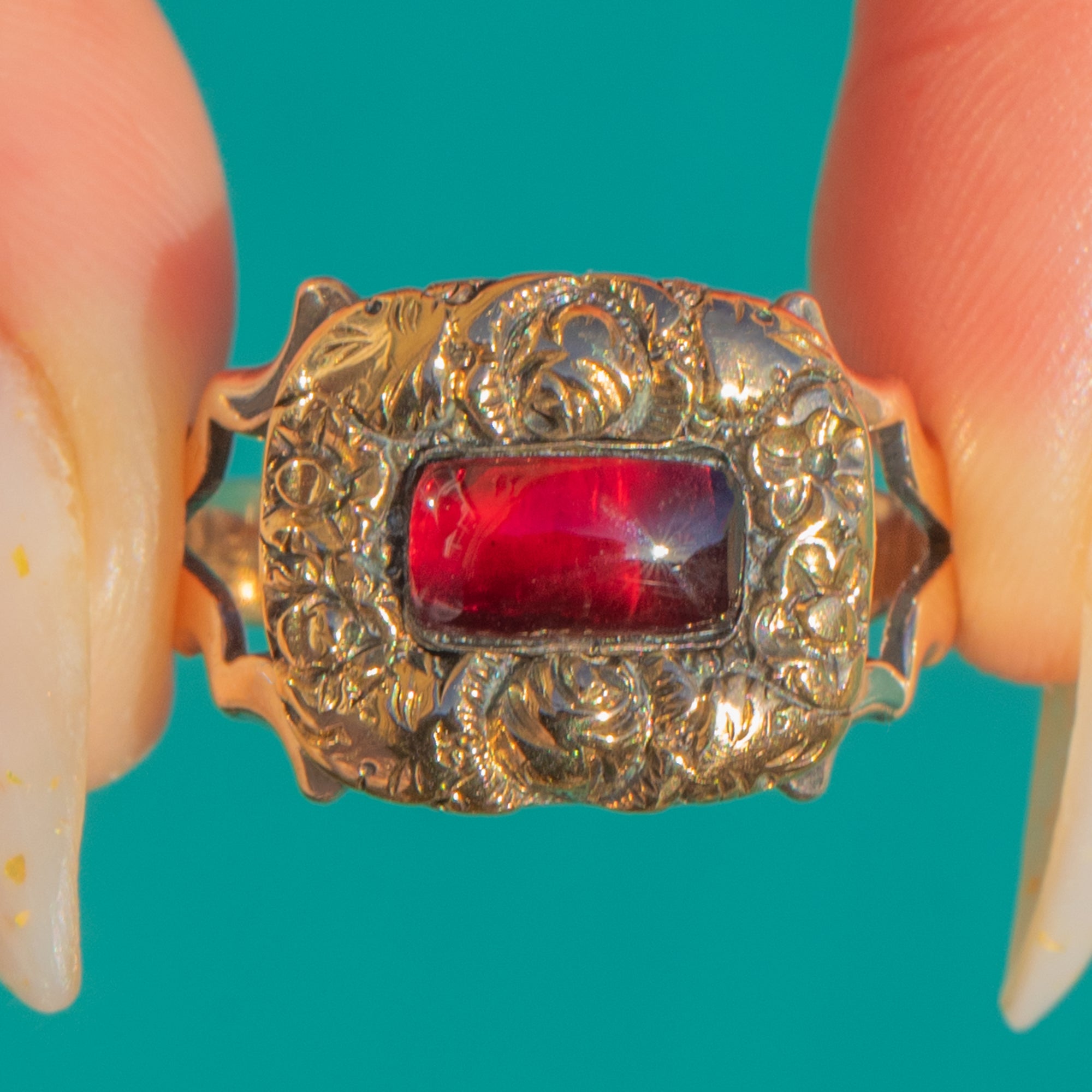 A beautifully ornate Georgian ring in 9ct Gold, crowned with a deep crimson Garnet cabochon in a smooth rub-over bezel. The rectangular plaque is richly chased with foliate scrolls, creating a romantic cartouche that frames the gemstone with exquisite texture and depth.