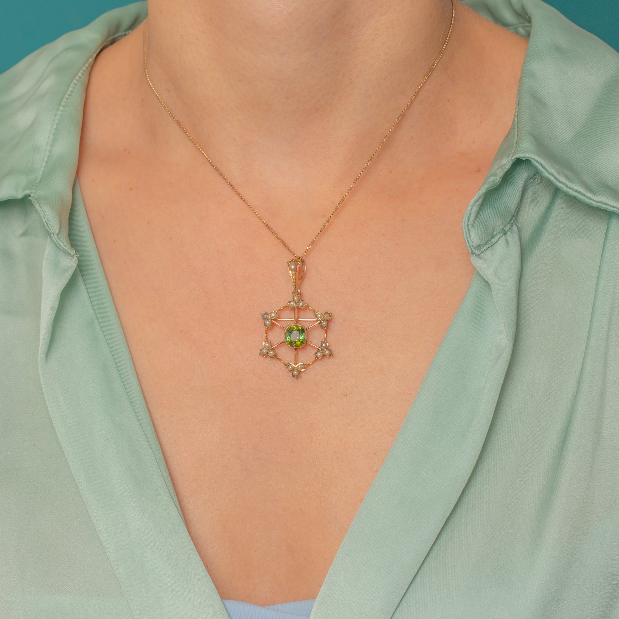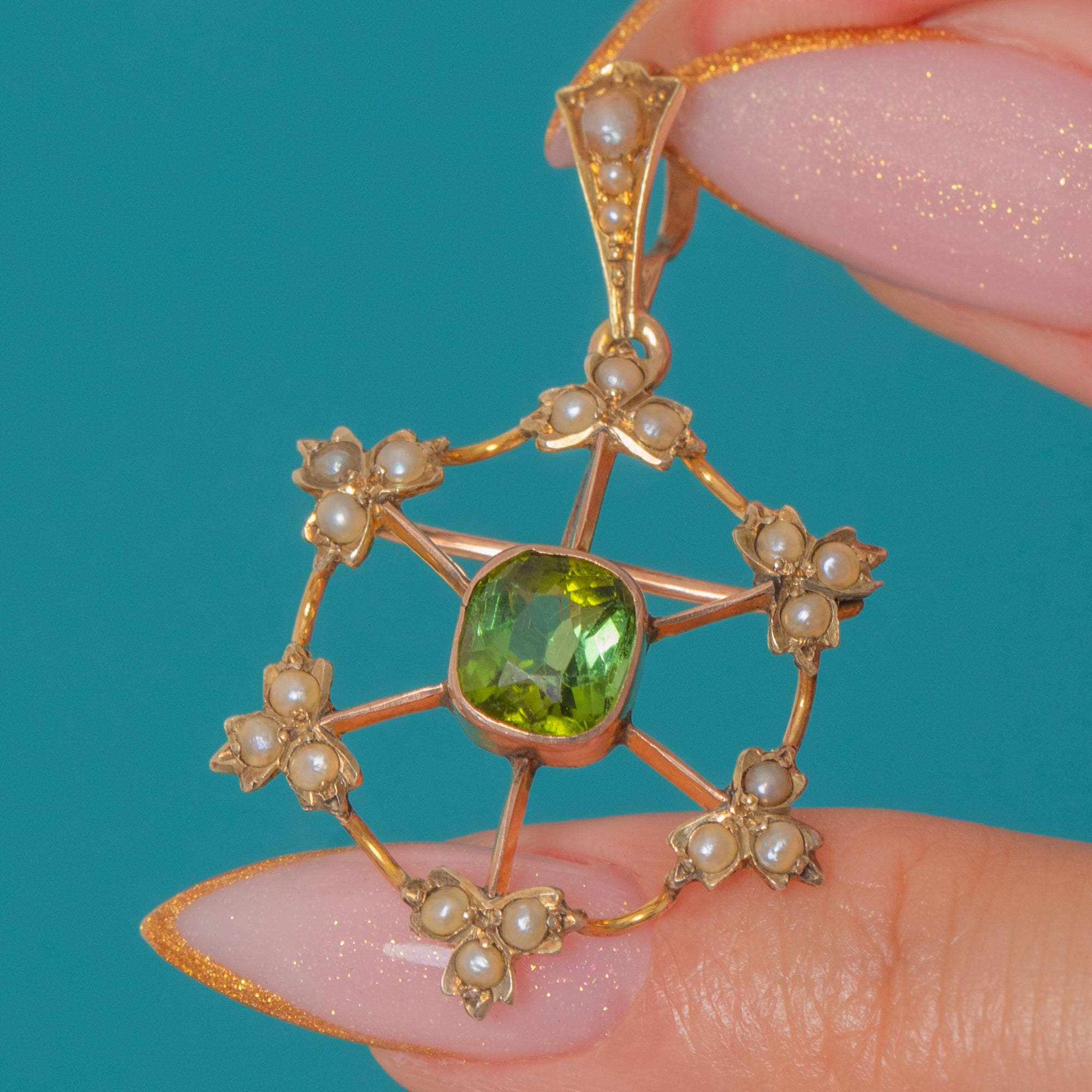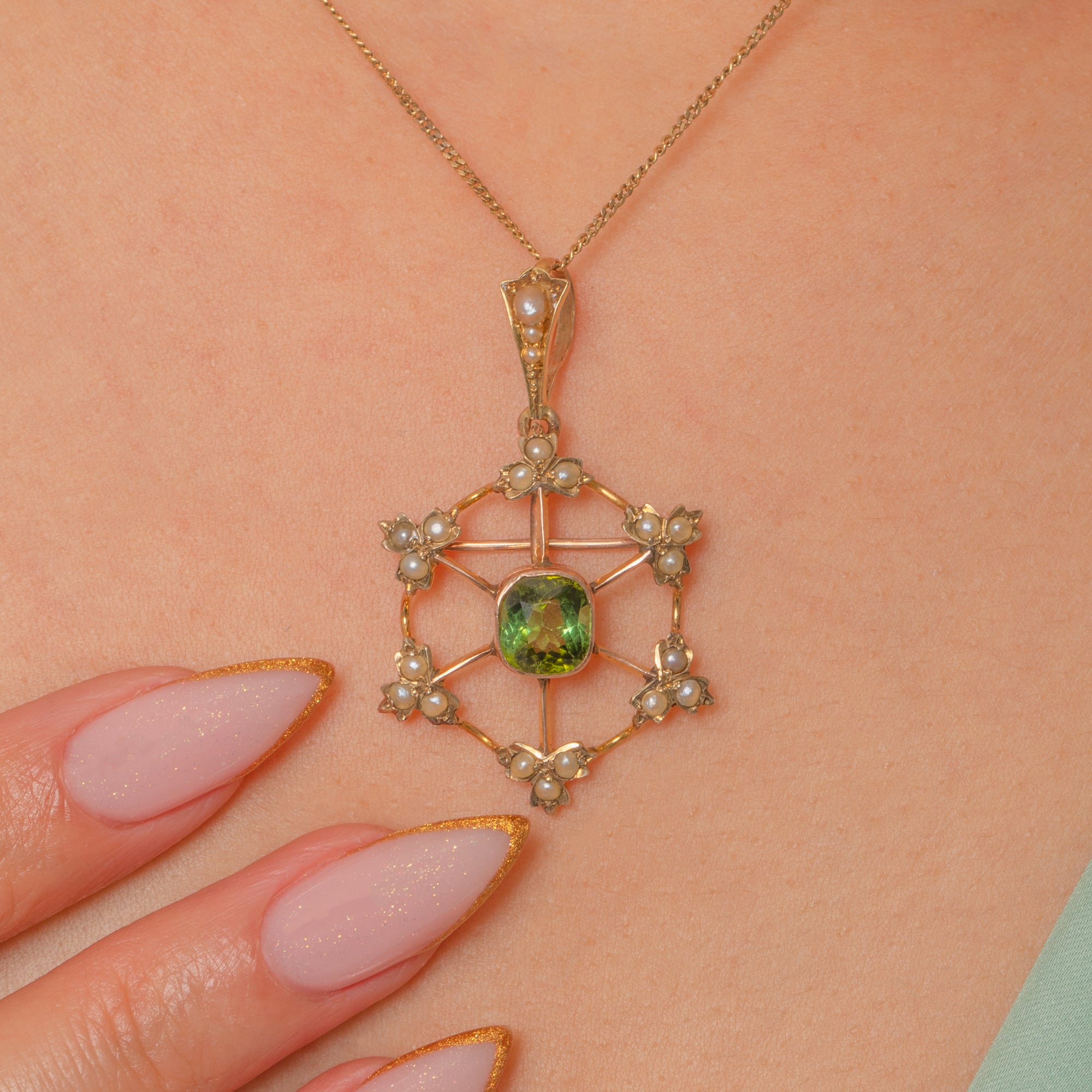 This exquisite piece of Edwardian jewellery showcases a rich green Tourmaline framed by natural Pearls, creating a piece full of luminous contrast and early 20th-century elegance.