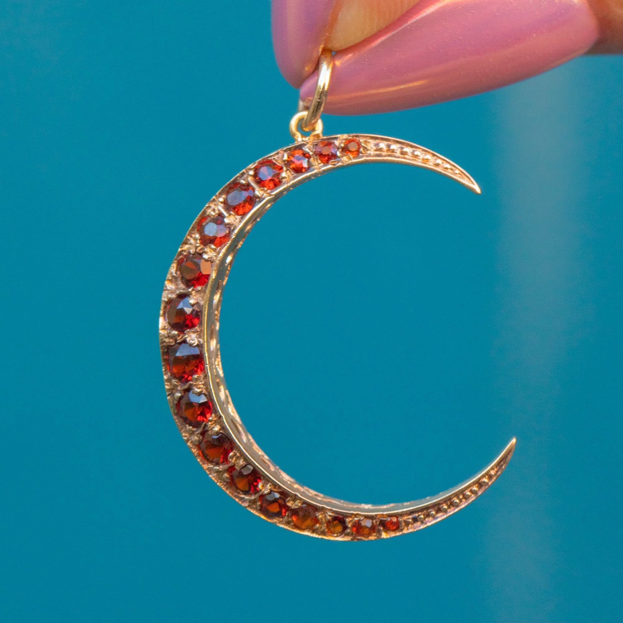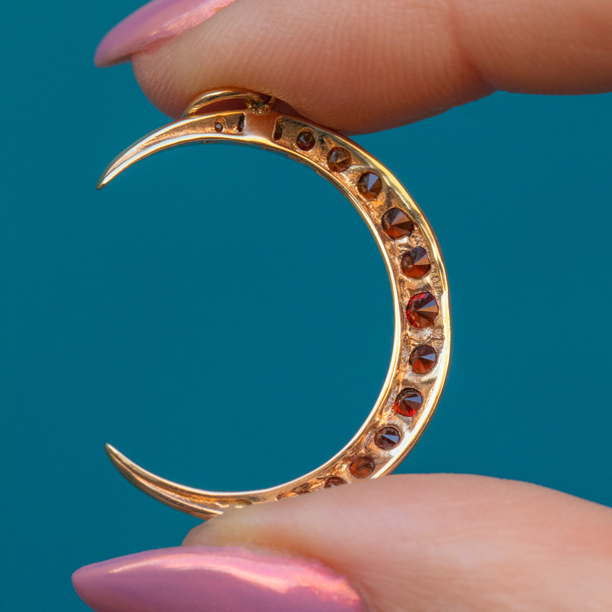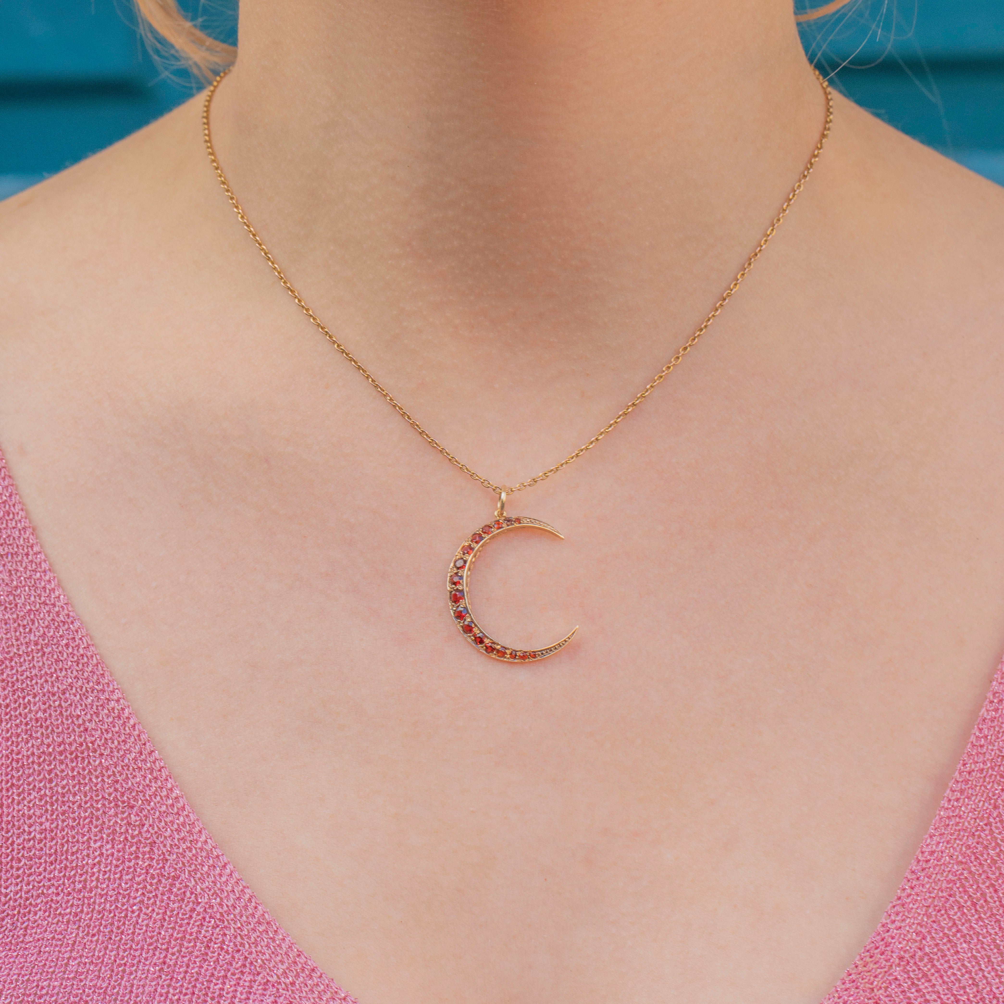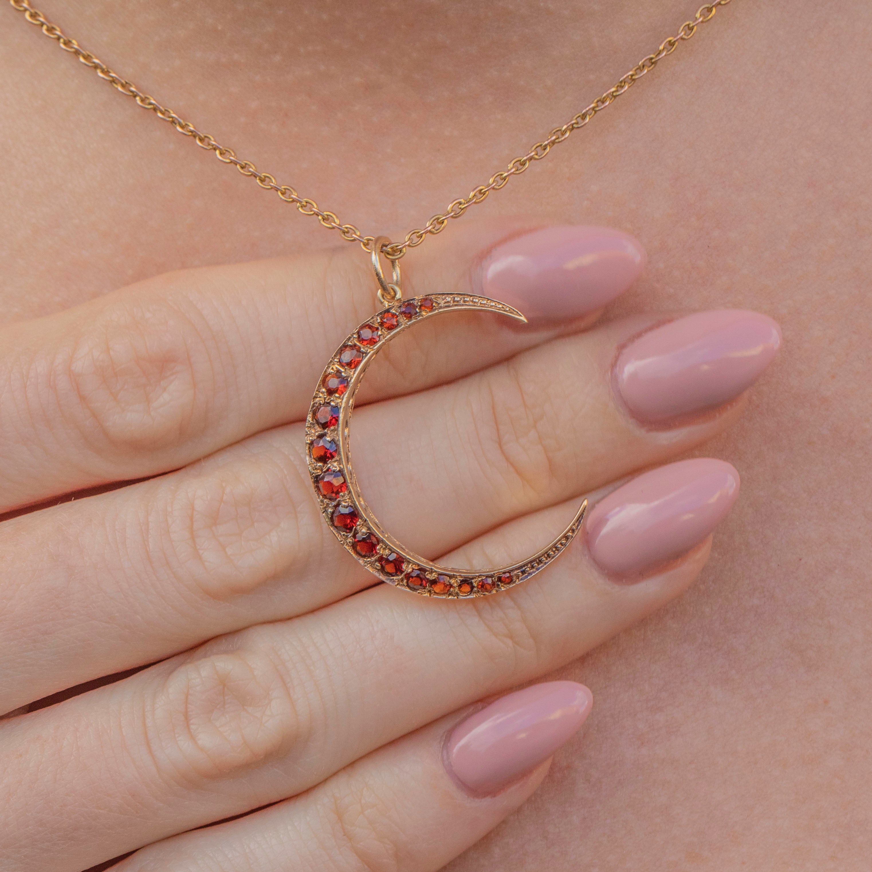 This 9ct Gold Hessonite Garnet crescent moon pendant is the perfect transitional piece for your autumn collection. Taking inspiration from the Victorian era, this vintage crescent moon pendant is set with Hessonite Garnets with the most beautiful terracotta tint.