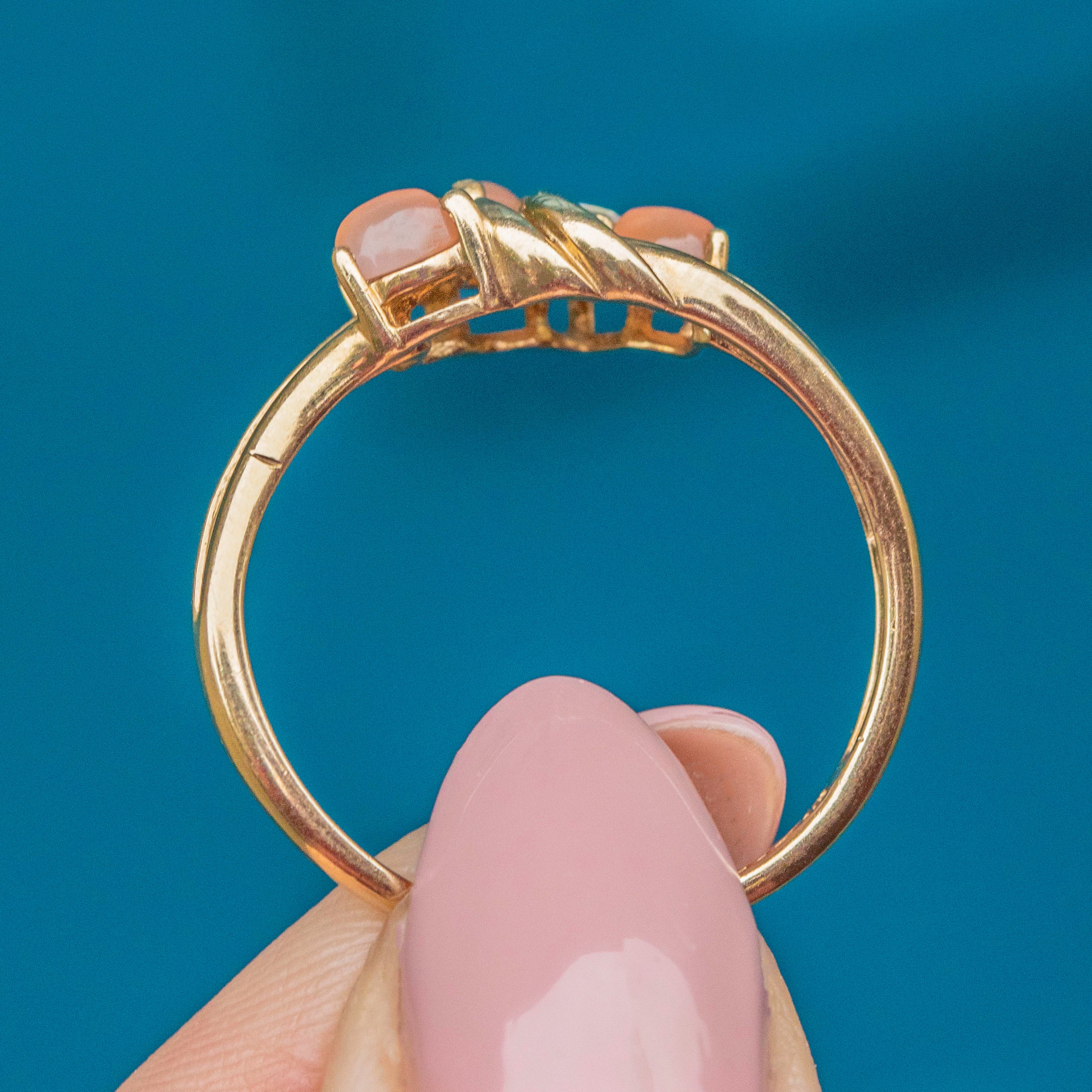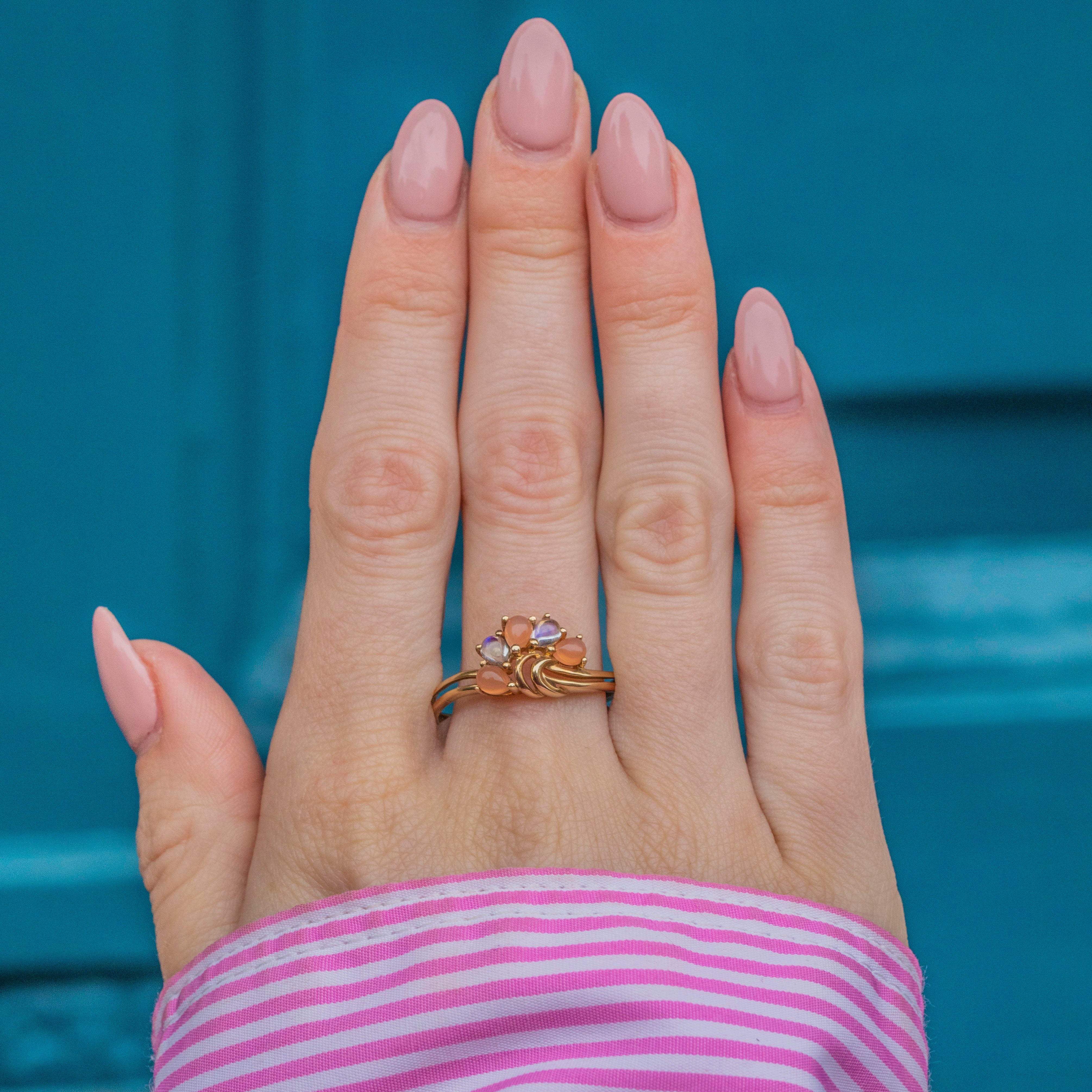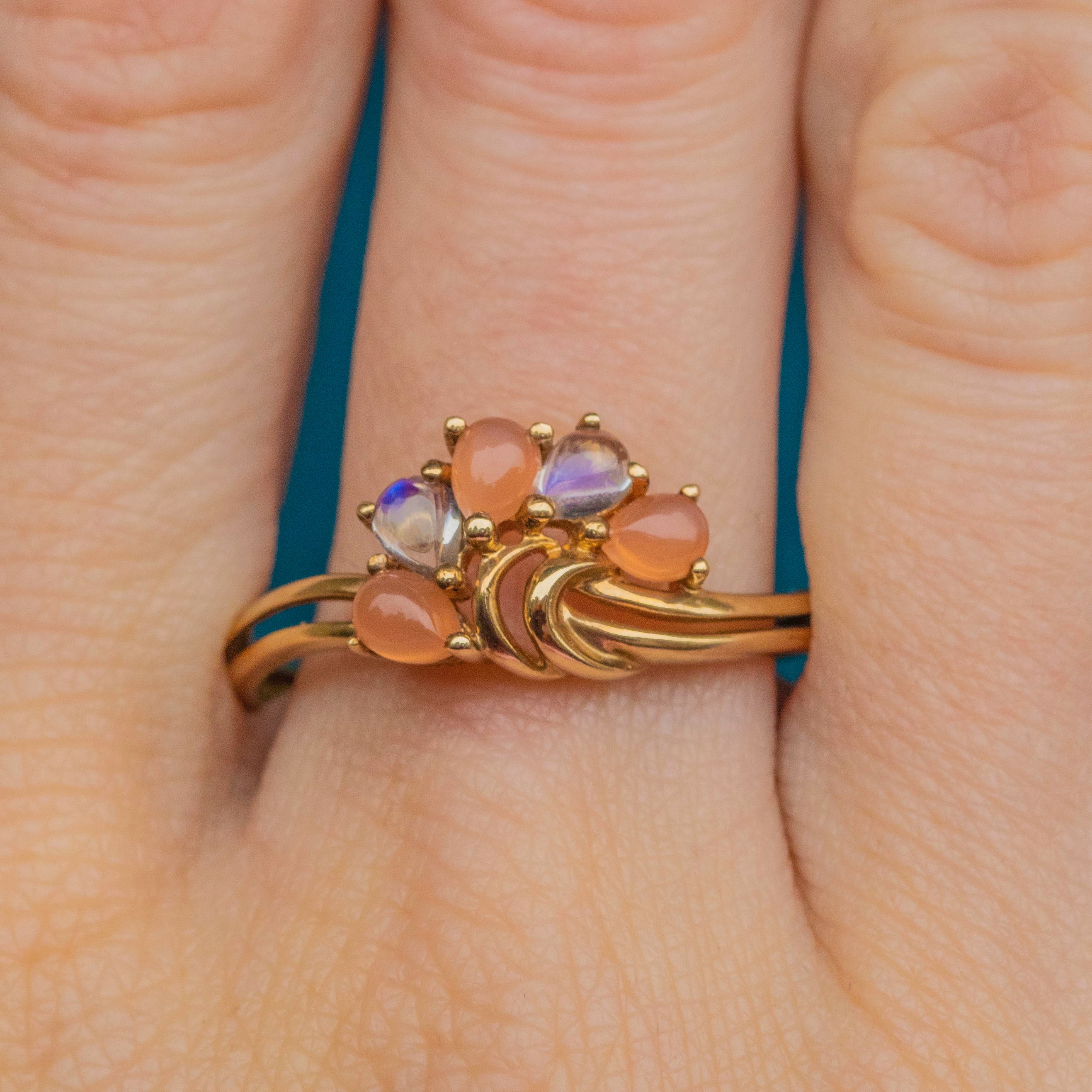 This exquisite 9ct Gold Moonstone & Chalcedony fan ring is a beautiful fusion of elegance and charm. With a unique fan design, this ring showcases a stunning combination of soft, glowing Moonstones and delicate peachy Chalcedonies.
