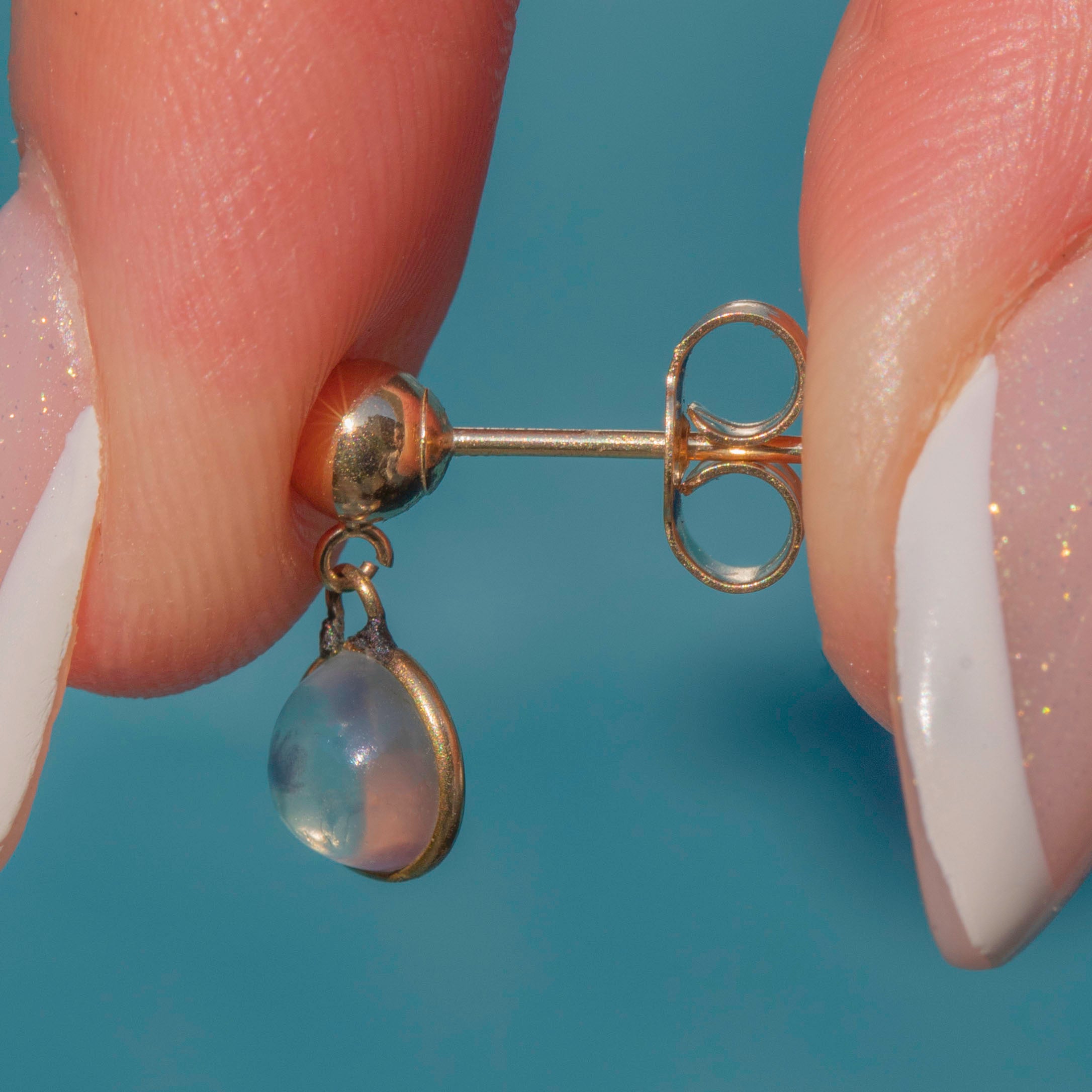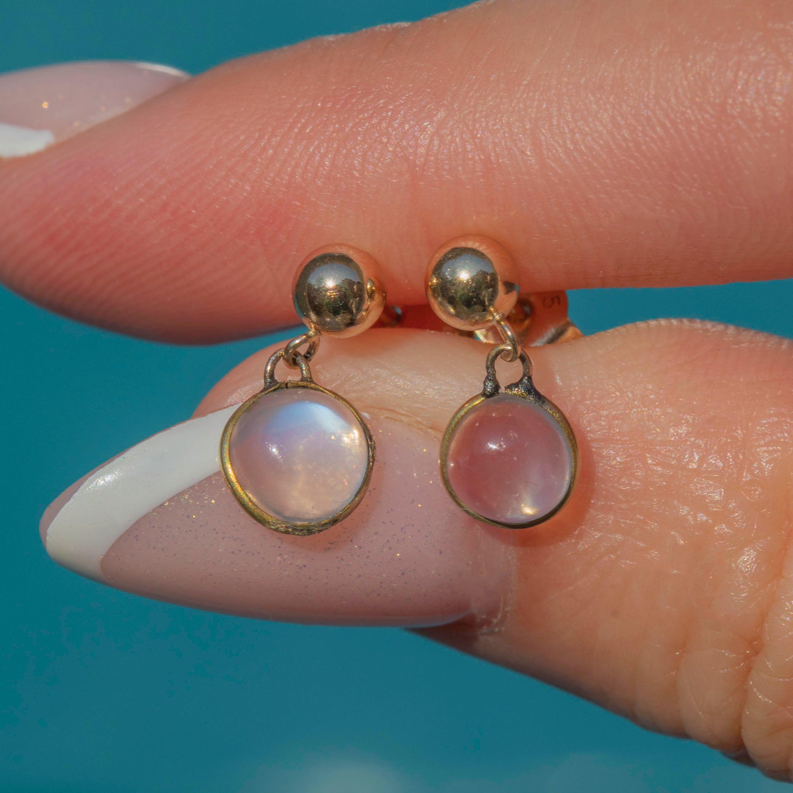 The smoothly cut Moonstone cabochons reveal an enchanting silvery blue adularescence under the light, shimmying with your every movement as they suspend from their posts!