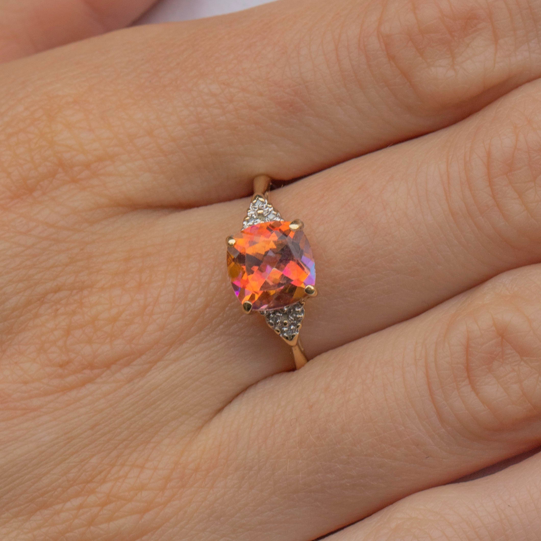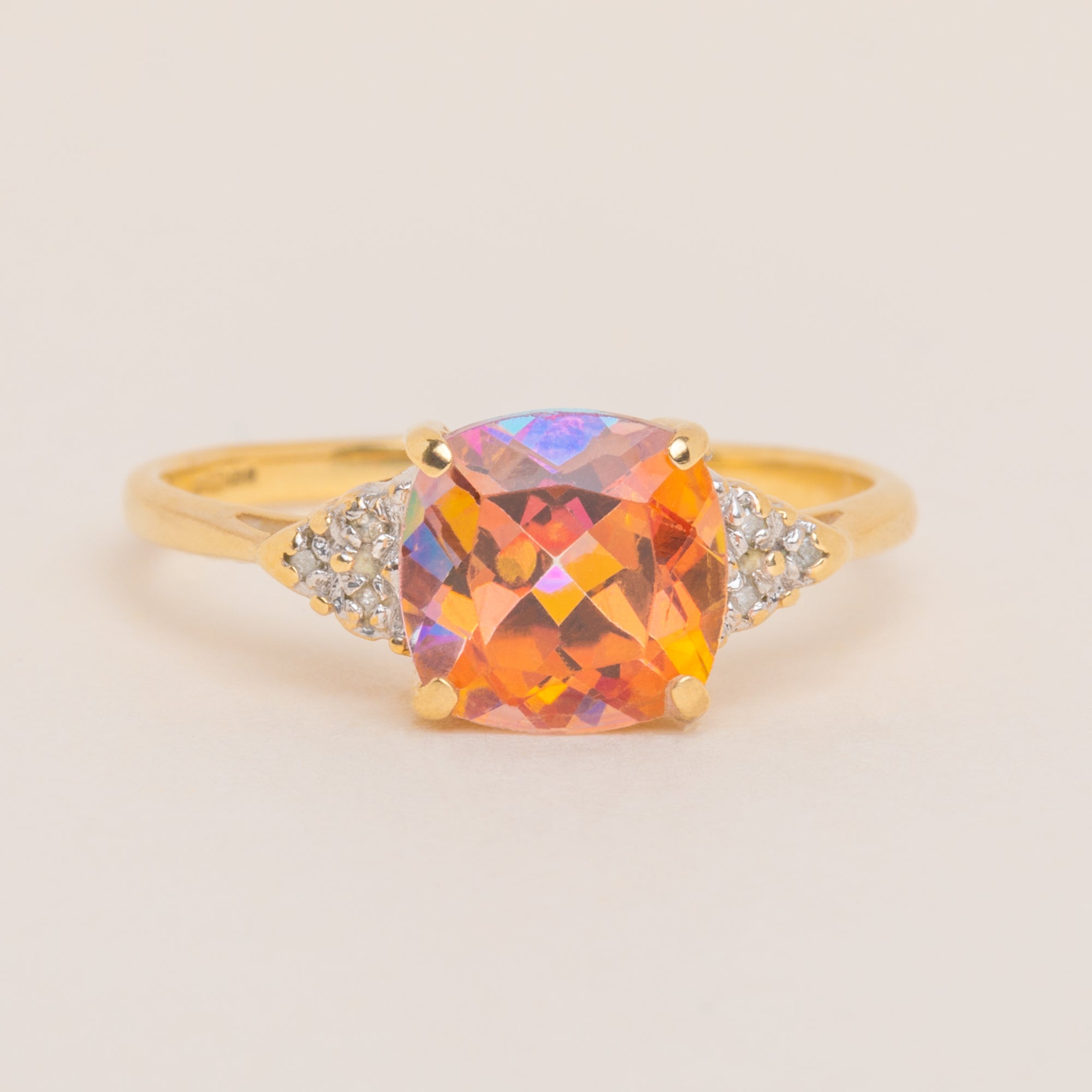 This 9ct Gold mystic Topaz Diamond cluster ring is a sweet treat for your jewellery collection! Centred by a fabulously faceted 2.20ct mystic Topaz, she flaunts a peachy core, graced with a rainbow of colour across her surface.