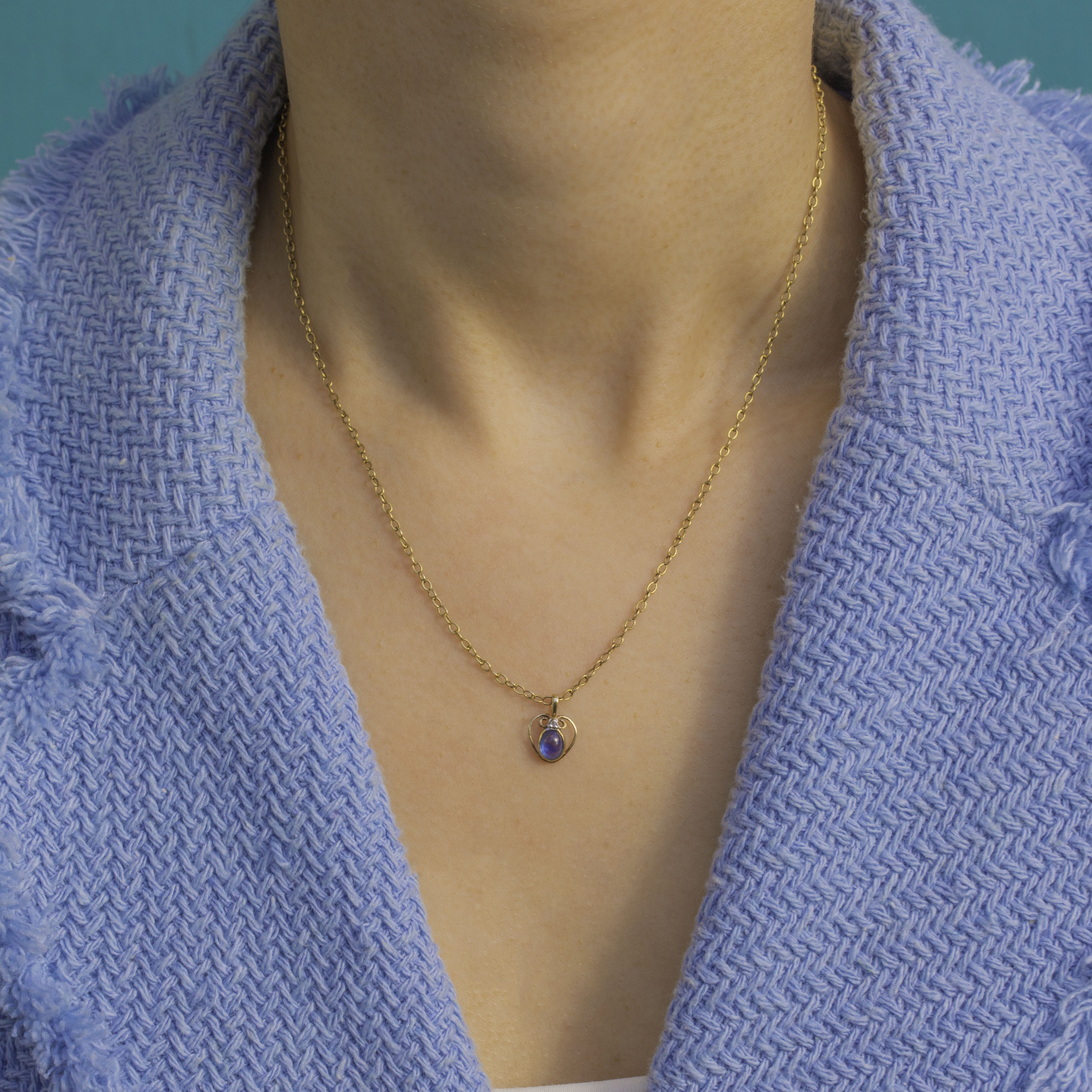 EXCELLENT: The Sapphire cabochon is smooth and lustrous with only the most minimal surface wear observed under magnification; the tiny Diamond accent is bright and secure. The openwork heart-and-scroll setting remains crisp with a lovely antique patina, and the bezel and bail are in excellent order.