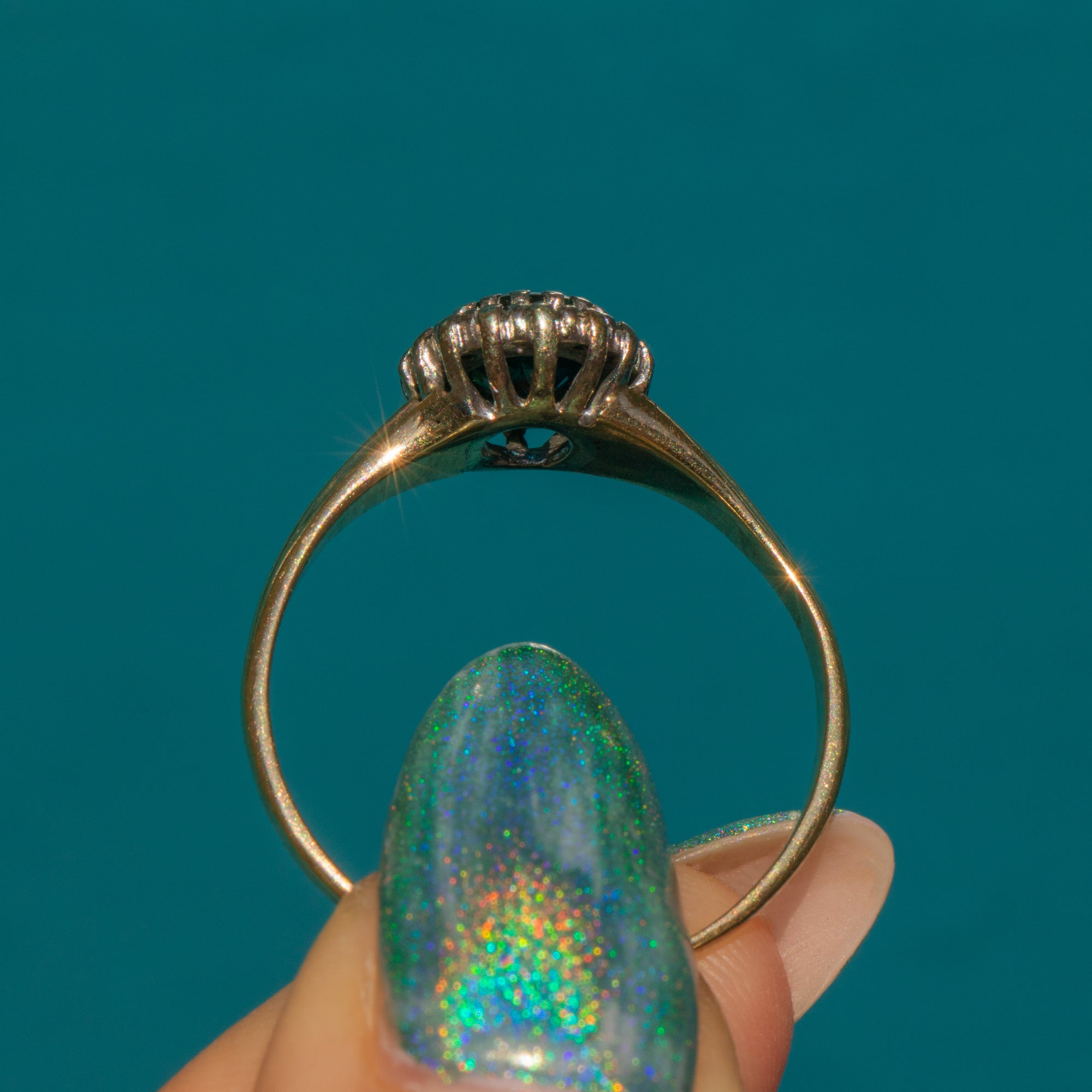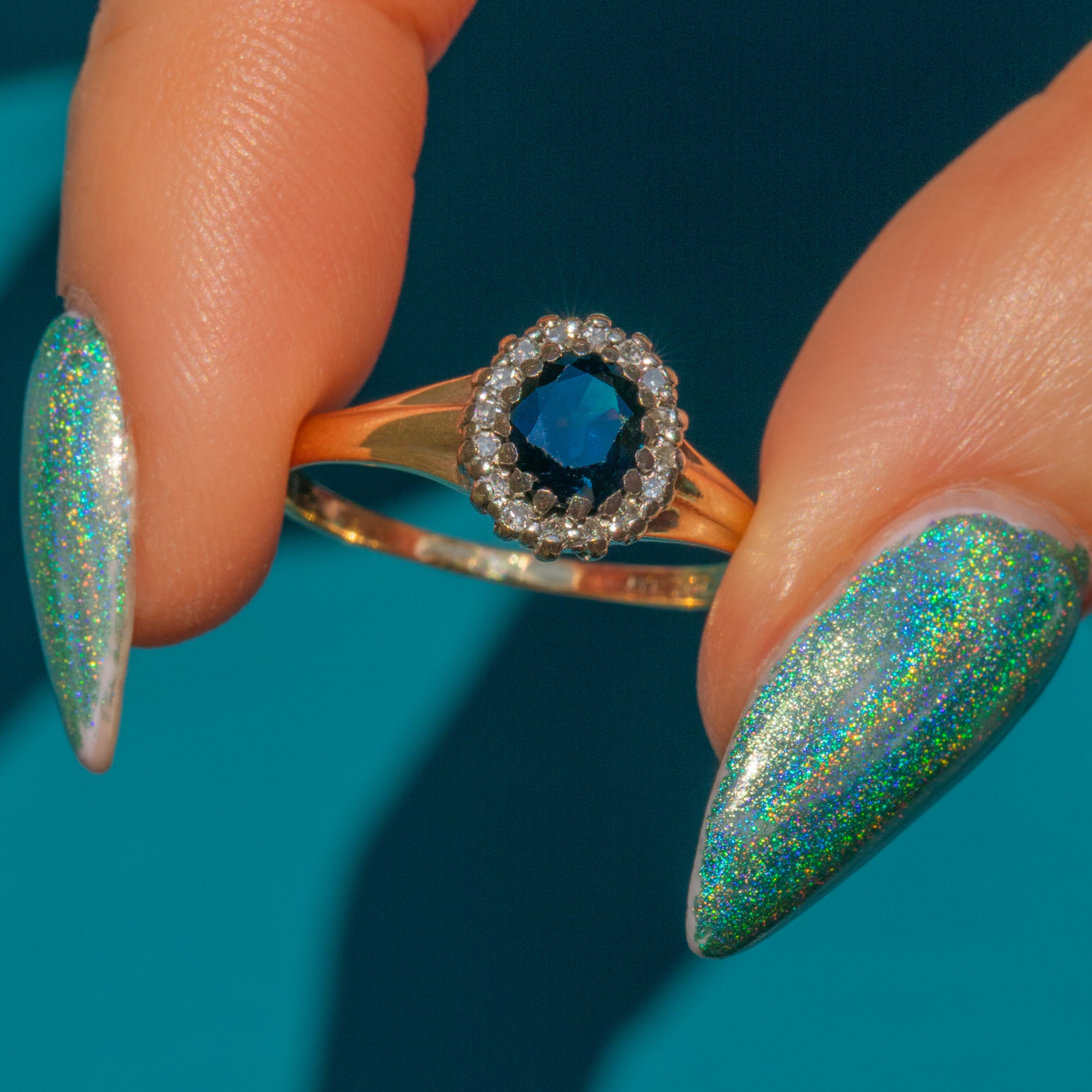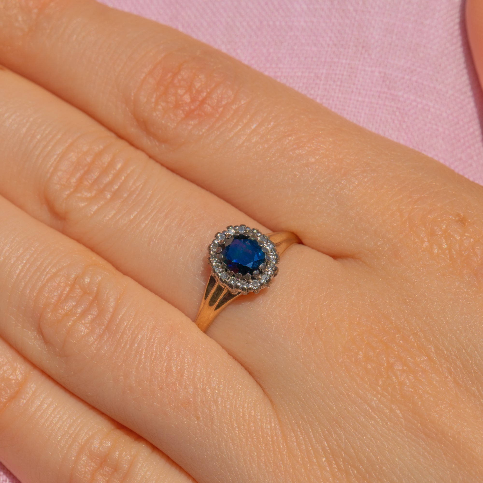 The solid 9ct Gold will elegantly wrap around your finger, with the curved shoulders perfectly framing the exquisite gemstone cluster. With open claw settings allowing the light to stream through the deep blue 0.70ct Sapphire and scintillating Diamonds, this enchanting vintage Sapphire ring is guaranteed to provide you with ample wearing pleasure!