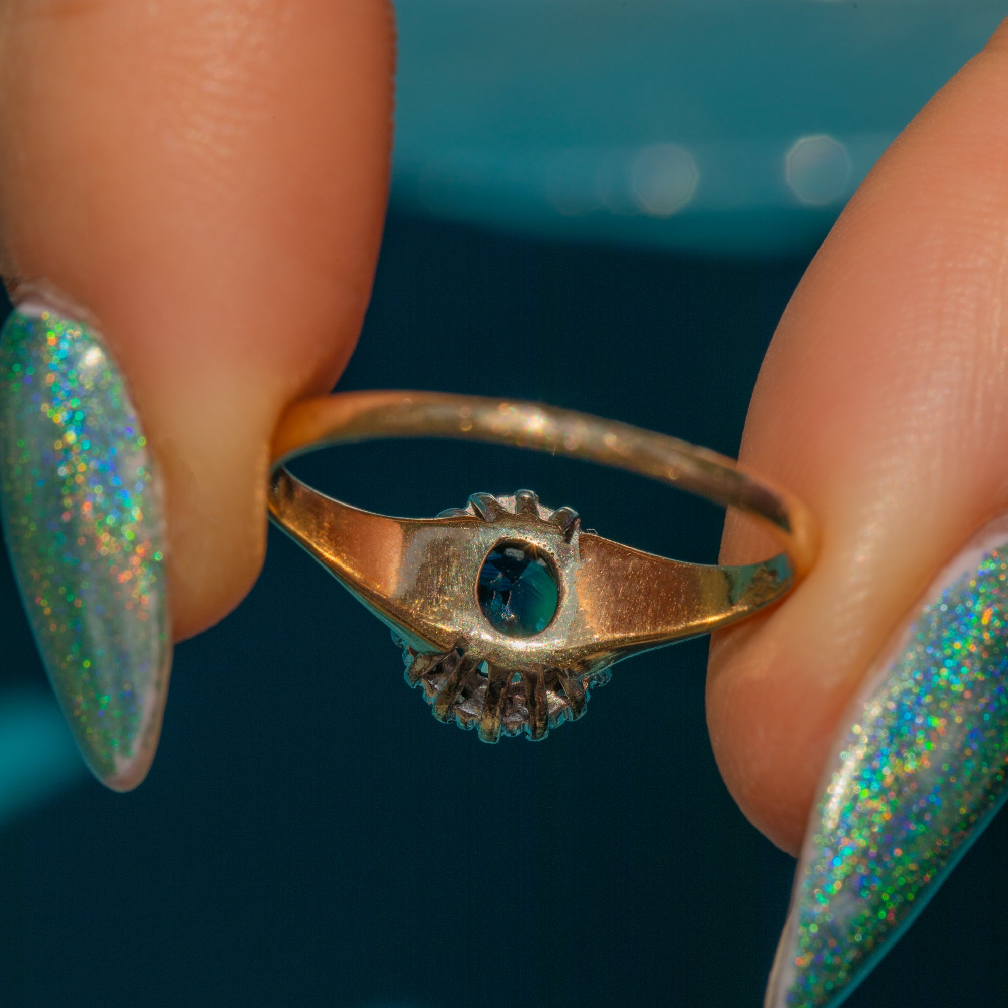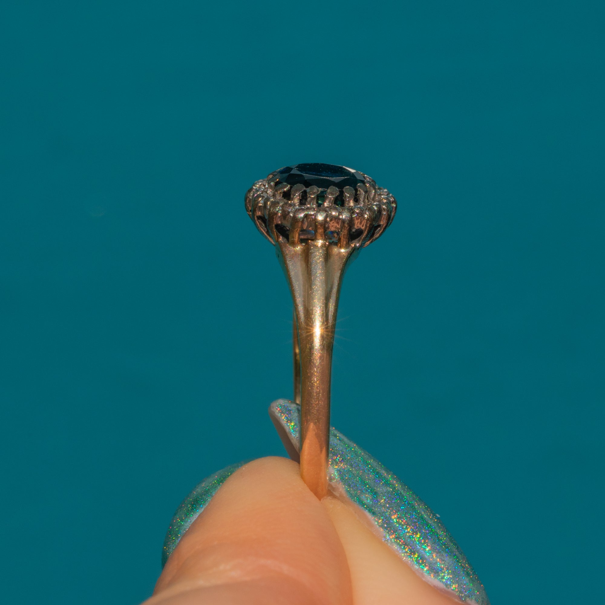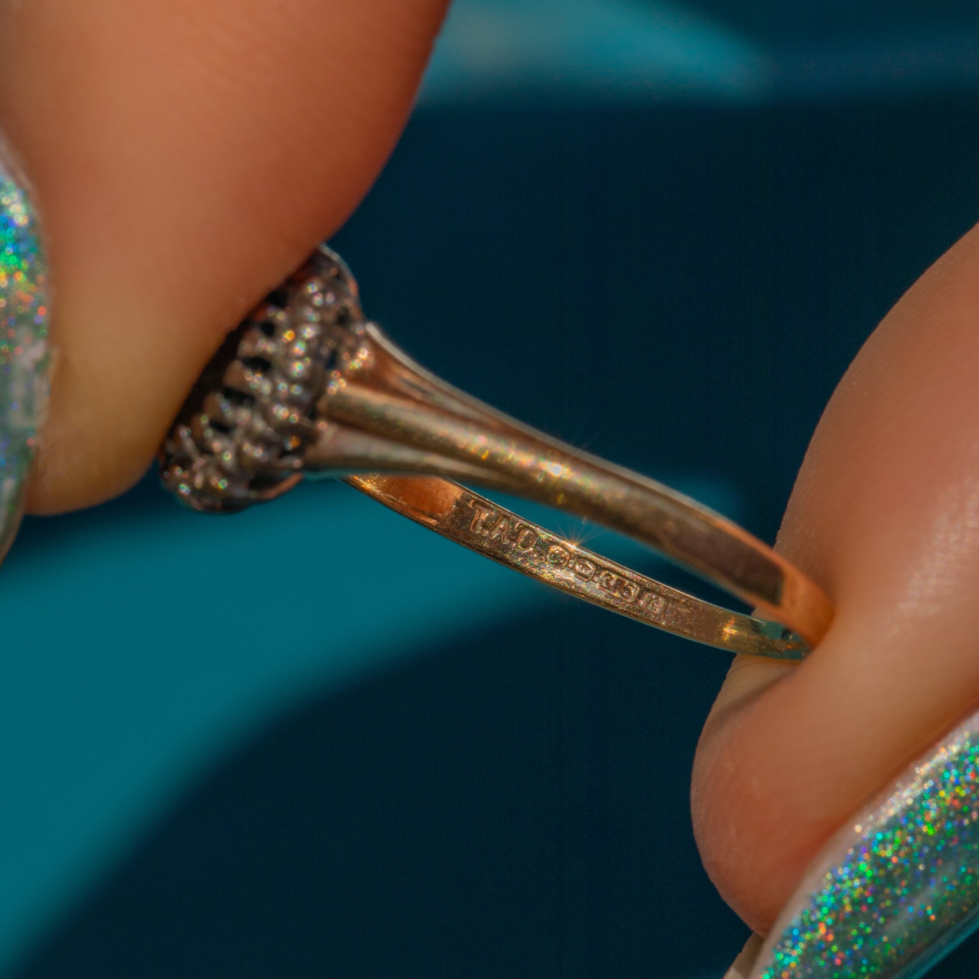 The solid 9ct Gold will elegantly wrap around your finger, with the curved shoulders perfectly framing the exquisite gemstone cluster. With open claw settings allowing the light to stream through the deep blue 0.70ct Sapphire and scintillating Diamonds, this enchanting vintage Sapphire ring is guaranteed to provide you with ample wearing pleasure!