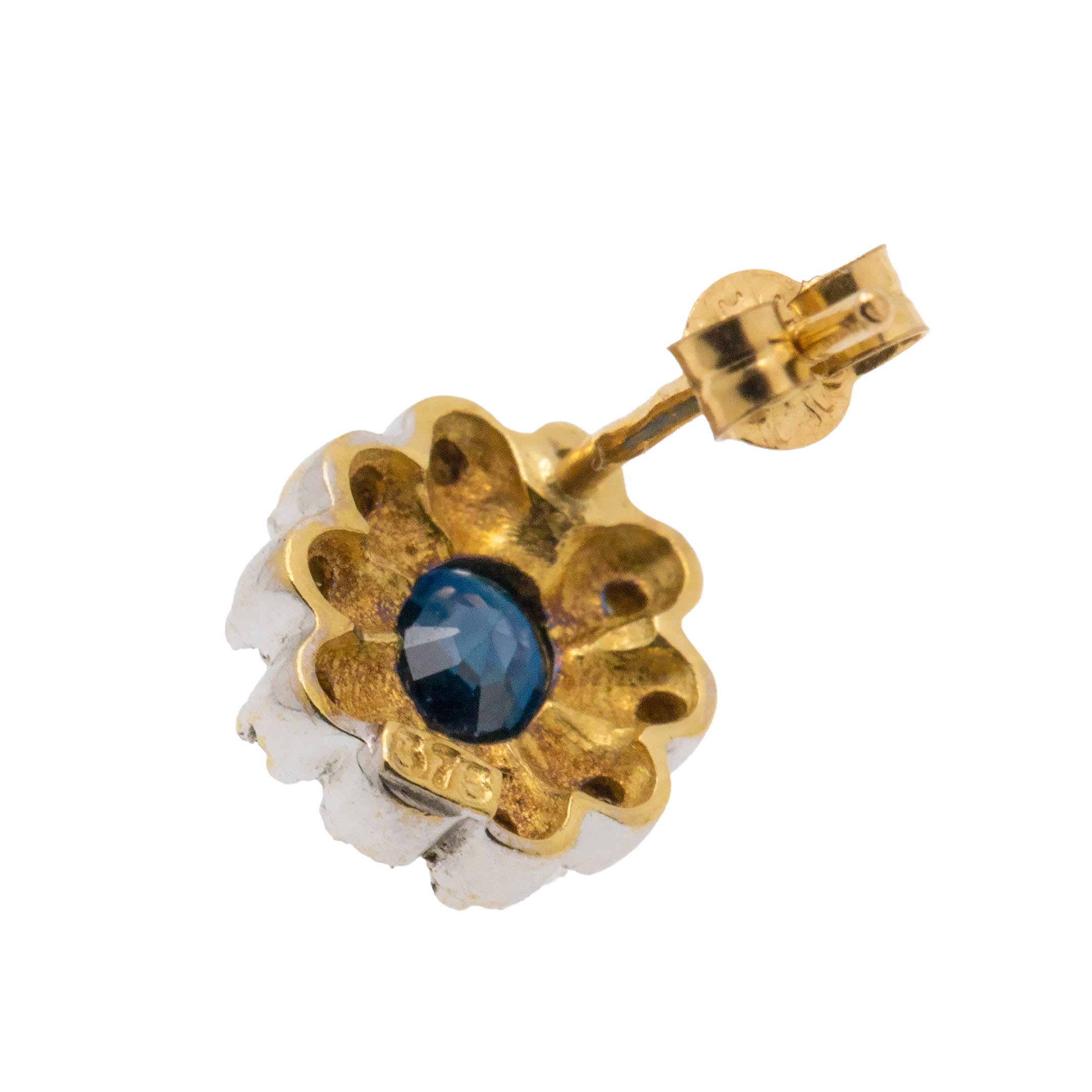 EXCELLENT. These 9ct Gold Natural Sapphire Diamond flower cluster earrings are in wonderful condition. This delightful pair have little wear to note and will provide you with years of enjoyment. The Natural Sapphires are rich in hue and beautifully faceted, and the Diamond petals sparkle brilliantly. The posts are fully hallmarked, and the butterfly backs allow you to wear this pair with confidence. Sapphire and Diamond are a timeless pairing - you won't ever fall out of love with these!