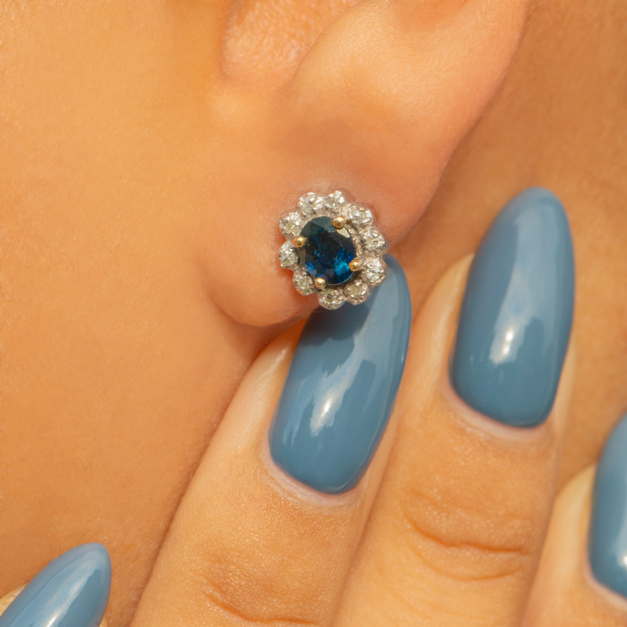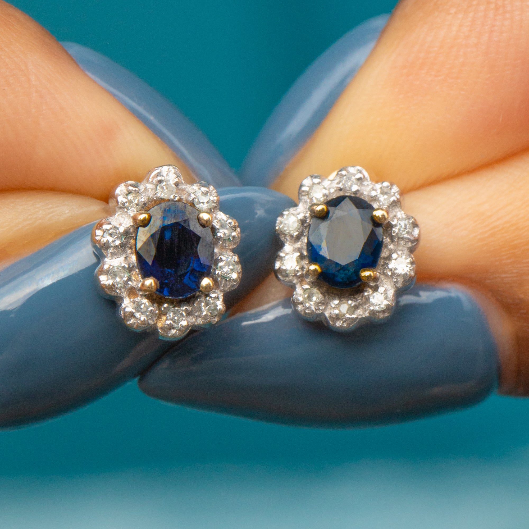 Fall in love with this opulent pair of 9ct Gold Natural Sapphire Diamond flower cluster stud earrings! Each flower is composed of a deep blue 0.25ct Natural Sapphire centre, haloed by eight twinkling Diamond embellished petals.