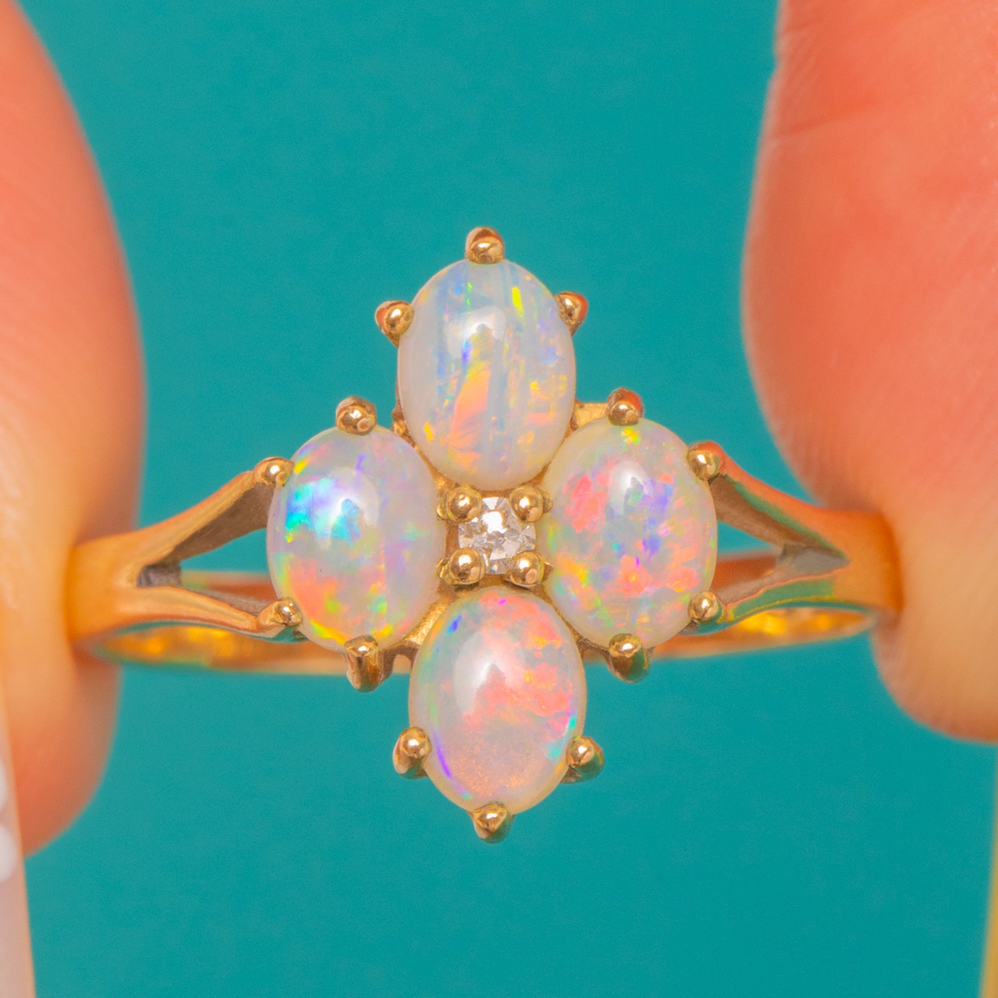 A sweet bloom of colour and light, this Vintage 9ct Gold cluster ring is fashioned as a delicate quatrefoil “flower” of Opal cabochons kissed by a single Diamond at the centre. The Opals glow with luminous play-of-colour—flickers of green, blue, pink and gold—beautifully set off by the warm hue of 9ct Gold.