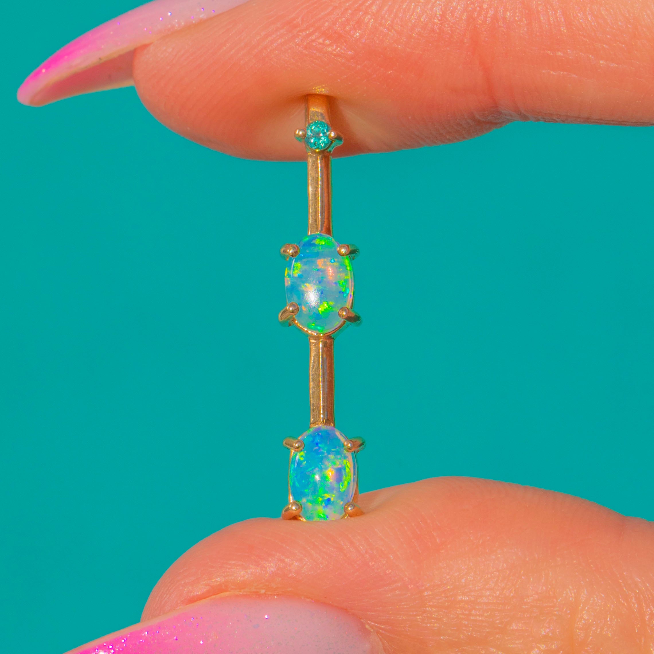 A refined Victorian bar pendant that lets its gemstones take centre stage. Two luminous Opal cabochons glow with playful flashes of blue, green and orange, crowned by a petite Emerald for a fresh pop of colour. The linear silhouette is sleek and minimal, crafted in warm 9ct Gold for an effortlessly elegant finish.