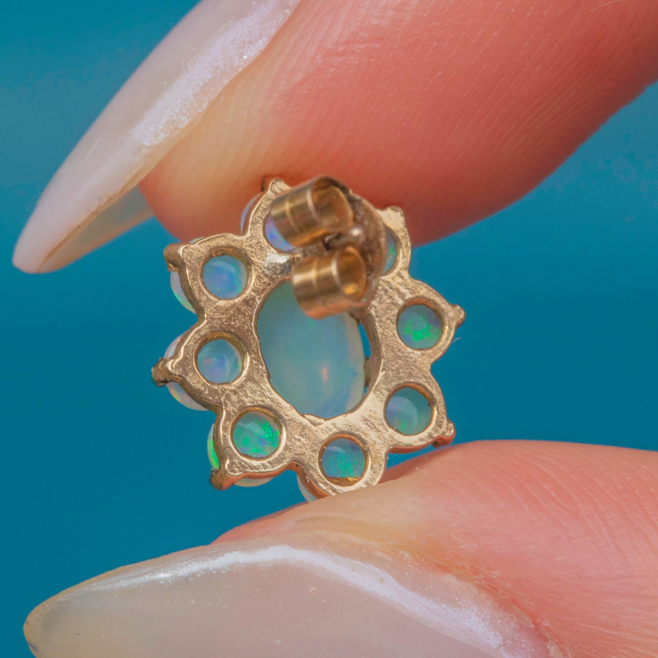 These vintage stud earrings each display nine iridescent Opals, each with a distinctive lilac and soft powder blue hue, revealing striking green shimmers as they catch the light.