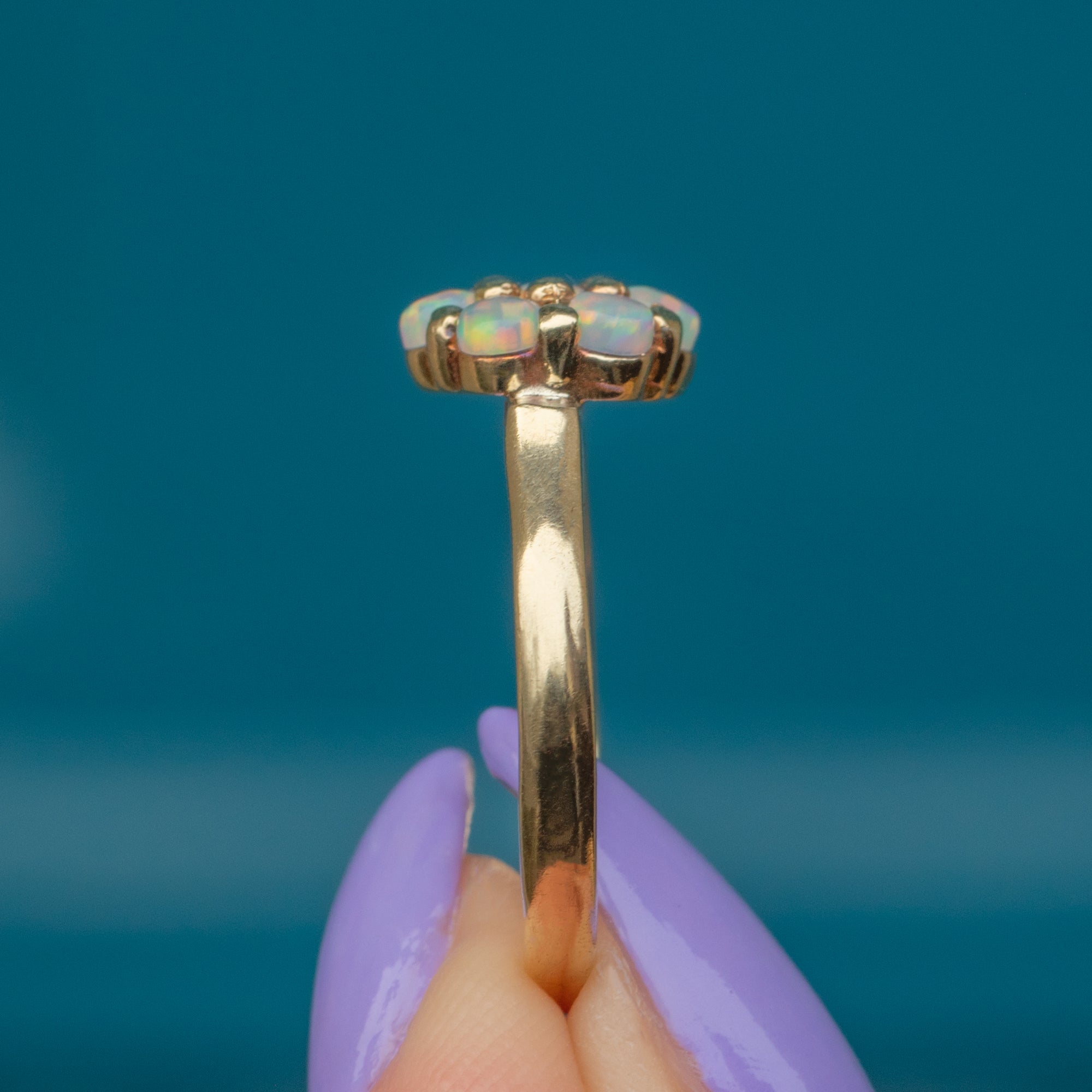 Each iridescent Opal radiates soft blues and green with striking flashes of peach, bringing character and charm to your ring stack. Crafted into a dainty flower motif, this Opal cluster ring is sure to become a top pick within your jewellery collection!