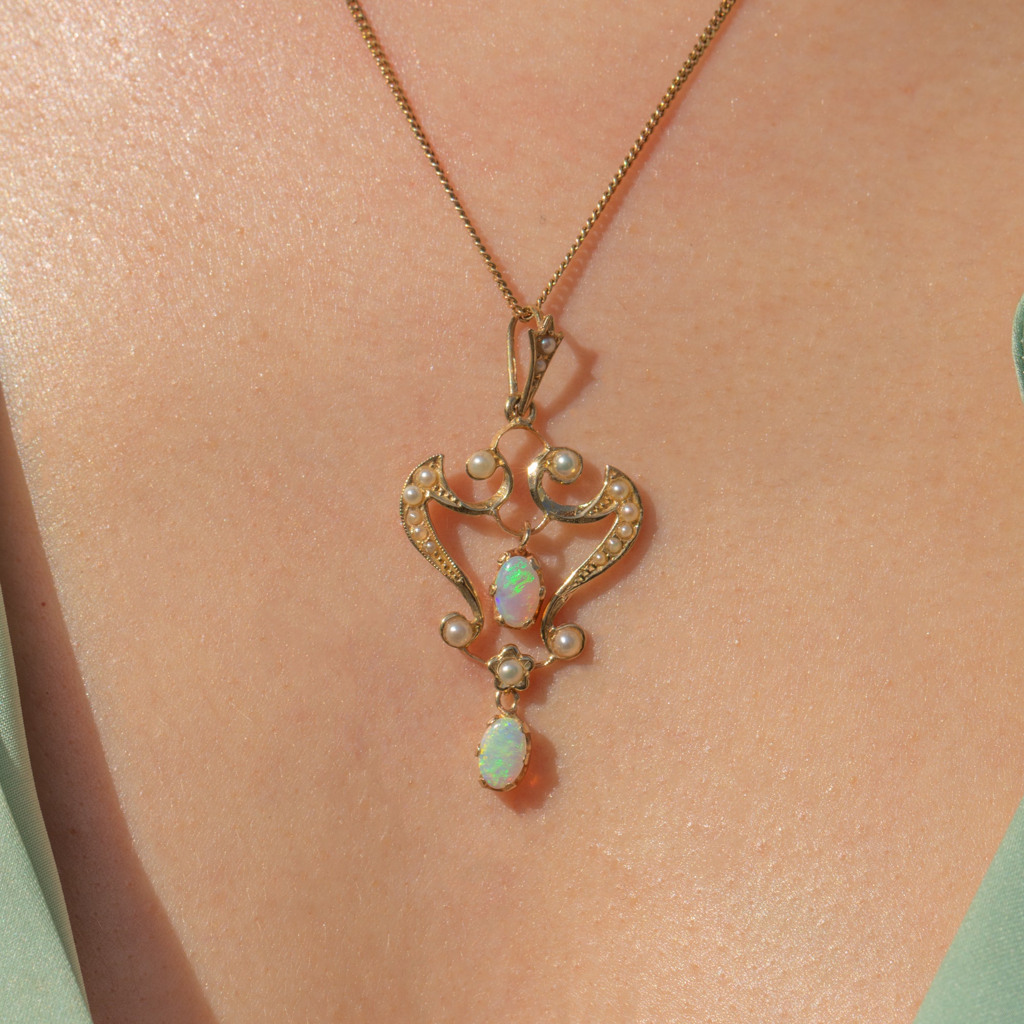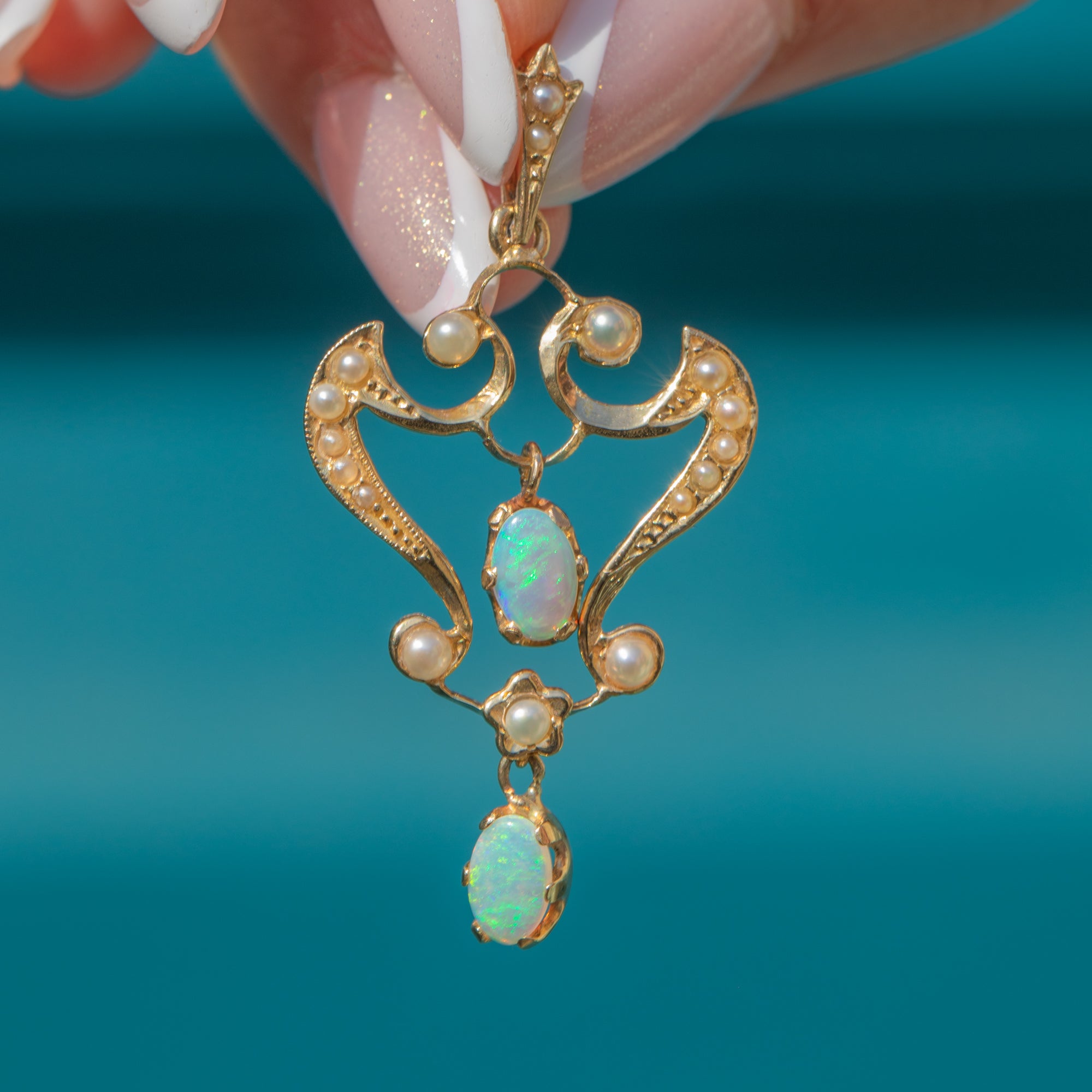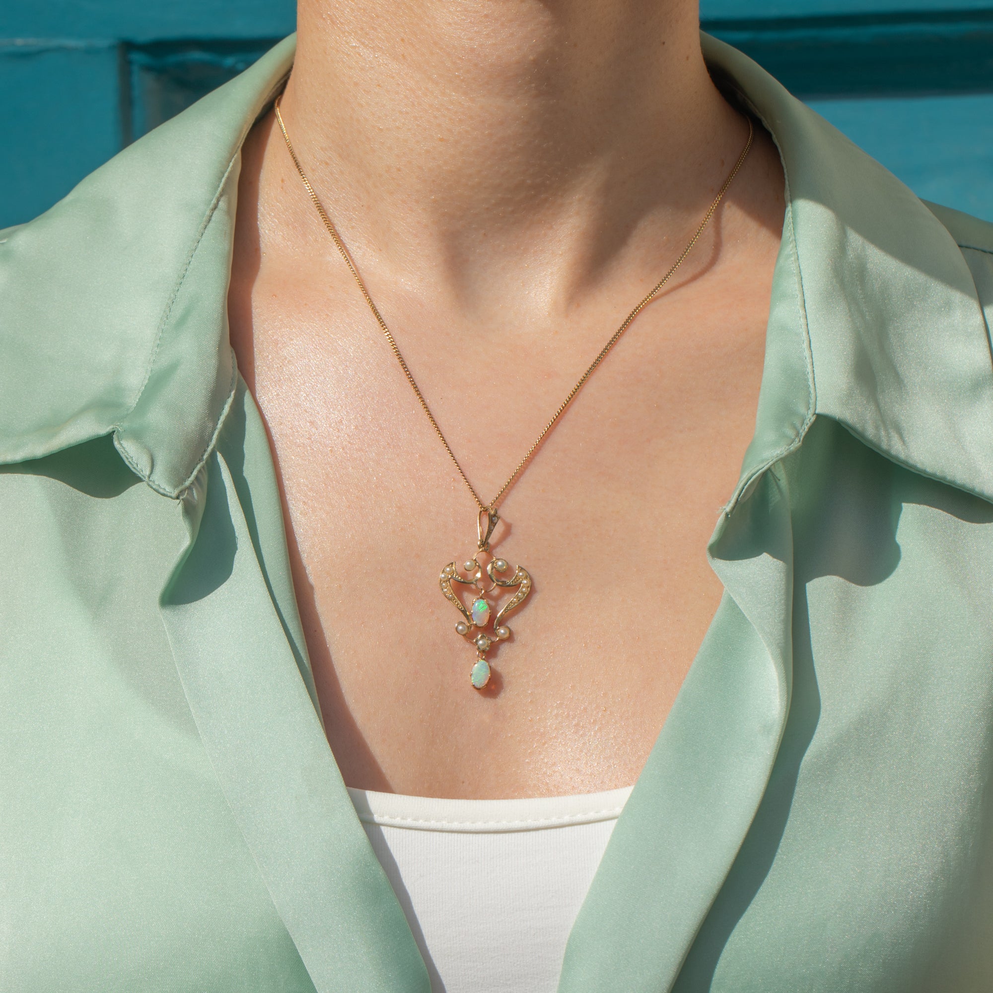 EXCELLENT: We are delighted to present this 9ct Gold Opal & Pearl lavalier pendant in excellent condition! The Gold is bright and buttery and the Seed Pearls are all present with a uniform iridescent shimmer. The Opals are smooth with no surface wear and are secure within their settings. Each component is securely connected promising many more years of wear and enjoyment!
