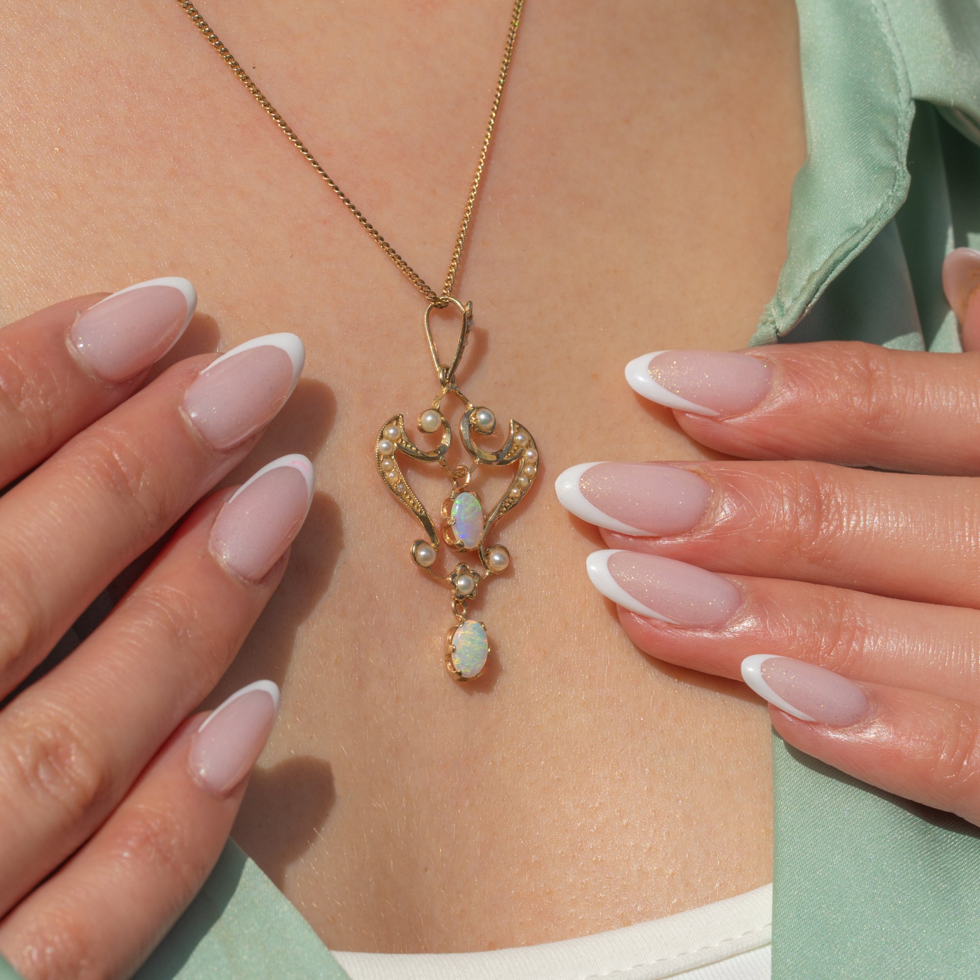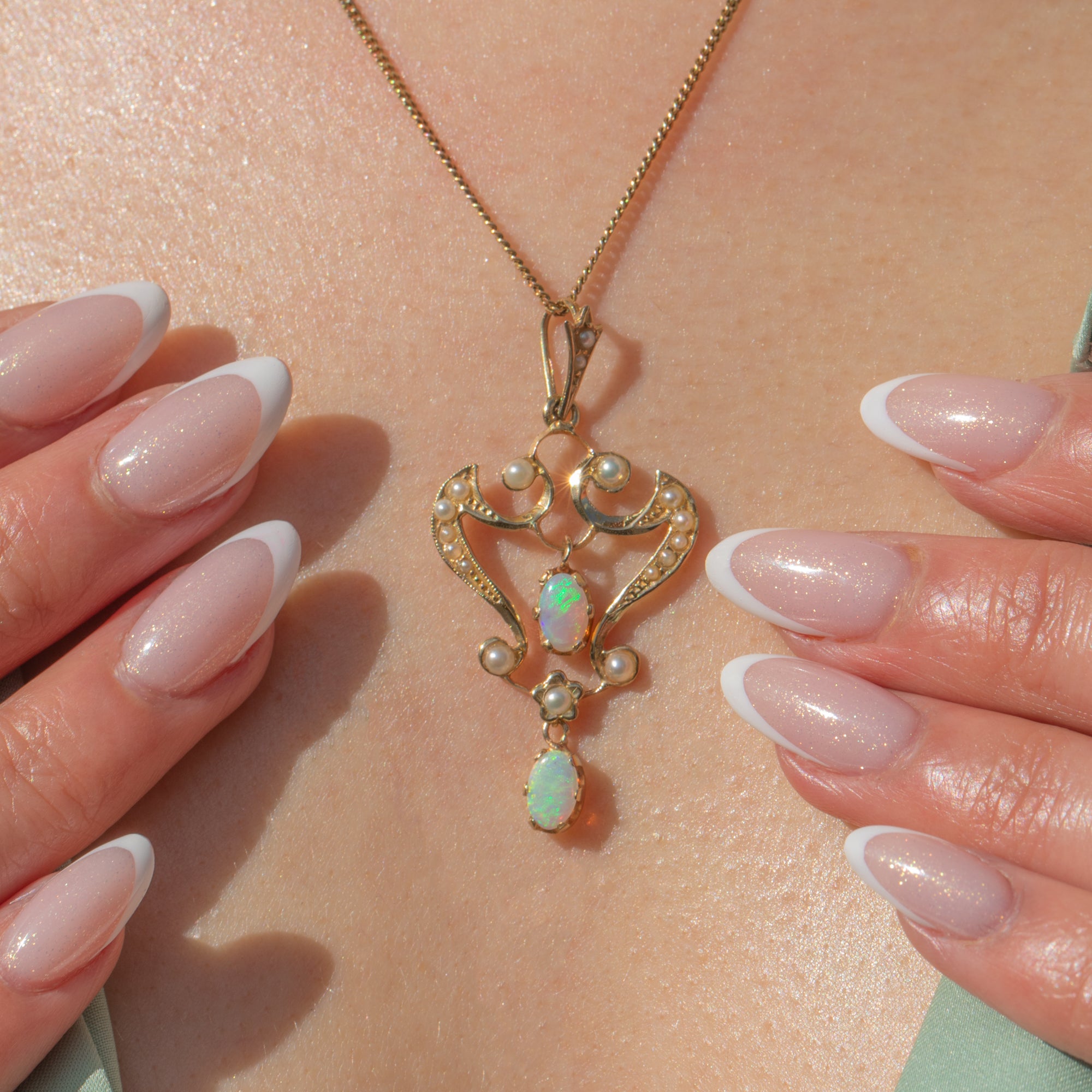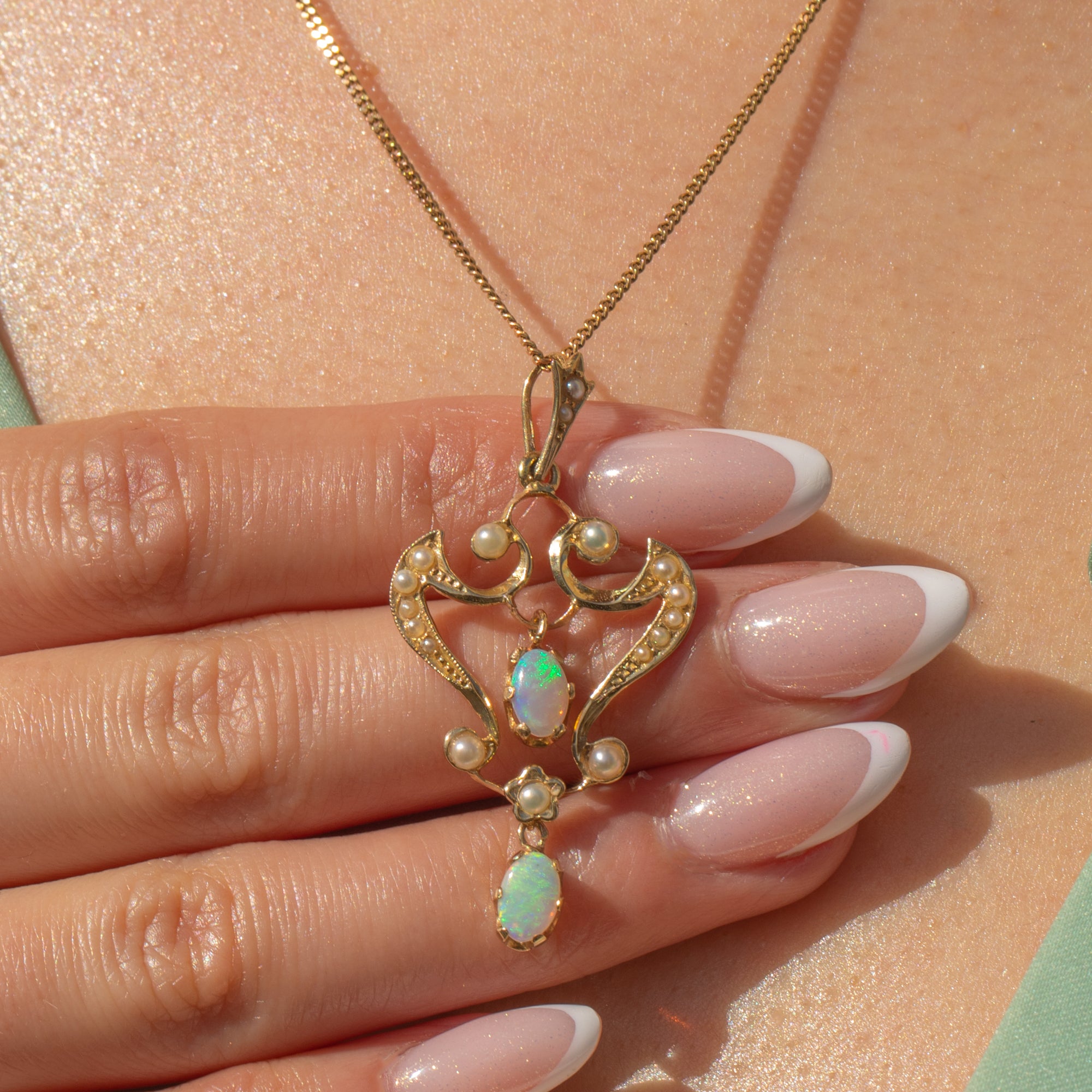EXCELLENT: We are delighted to present this 9ct Gold Opal & Pearl lavalier pendant in excellent condition! The Gold is bright and buttery and the Seed Pearls are all present with a uniform iridescent shimmer. The Opals are smooth with no surface wear and are secure within their settings. Each component is securely connected promising many more years of wear and enjoyment!