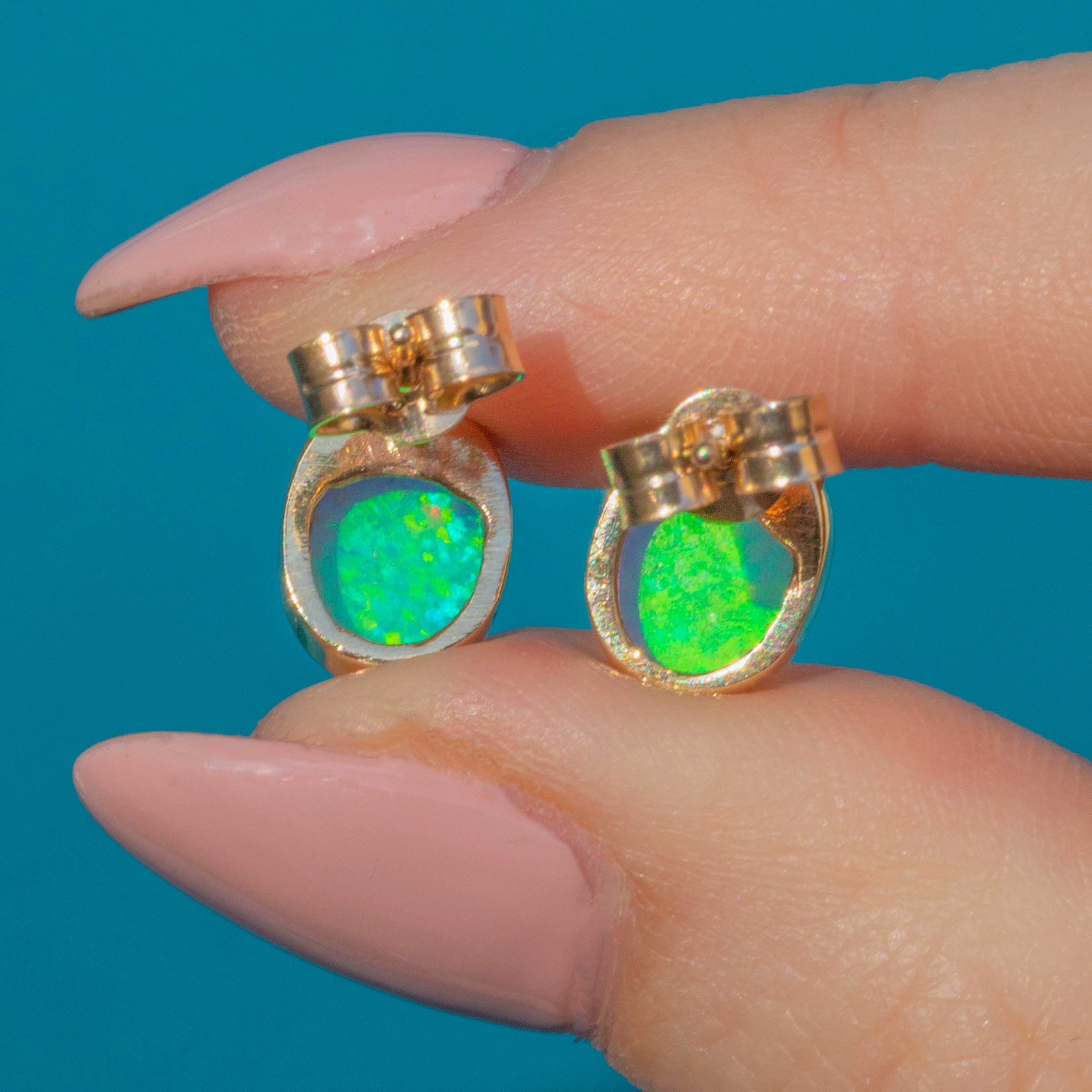 EXCELLENT. We are pleased to present these 9ct Gold Opal stud earrings in excellent condition. The vibrant Opals catch the light beautifully and are free from any scuffs or chips. The Gold is bright and buttery and the bezels are robust, holding the Opals securely in place. With snug-fitting butterfly backs, you can wear these vintage Gold studs with absolute confidence!