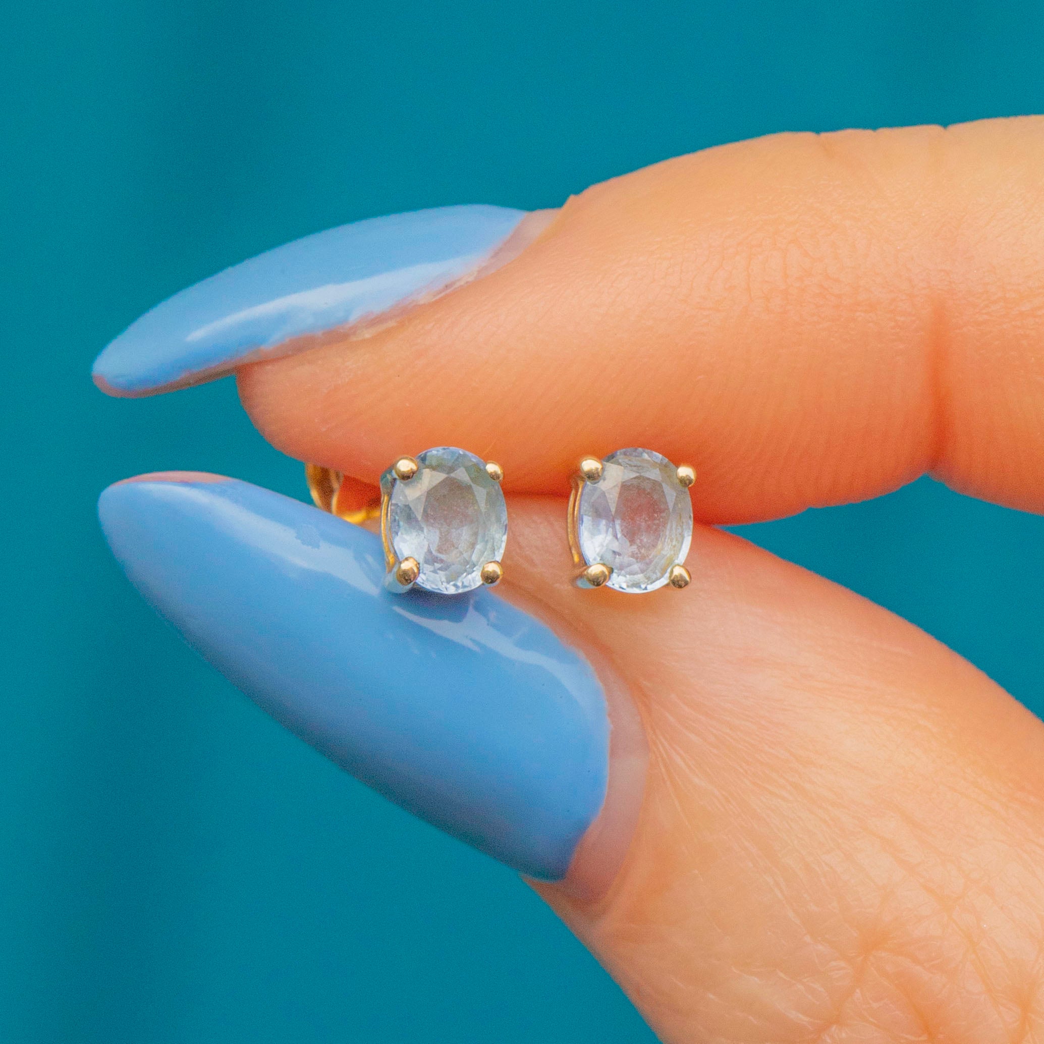 These 9ct Gold Pale Blue Sapphire stud earrings will make a lovely addition to your collection! Displaying oval-cut frosty cornflower blue Sapphires set in high-quality 9ct Gold, these vintage studs offer a delicate and timeless look. The elegant stones are securely held in a simple claw setting, showcasing their soft, serene colour.