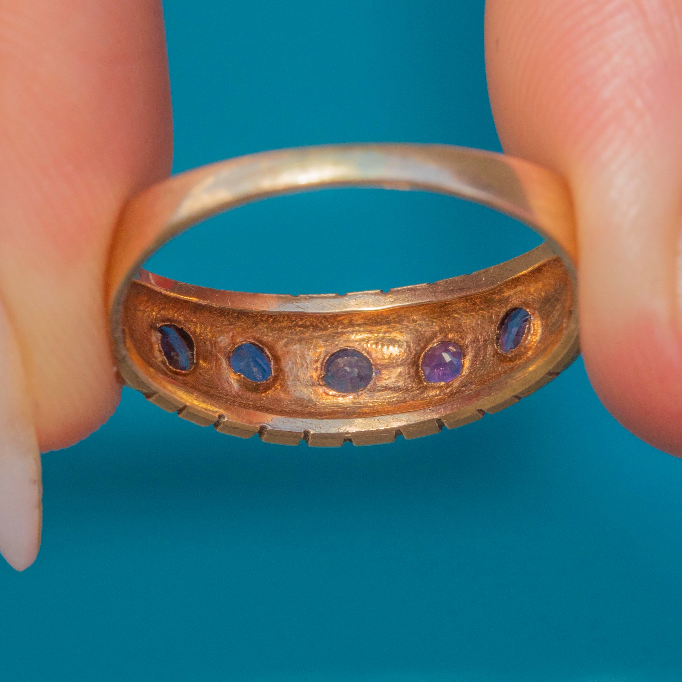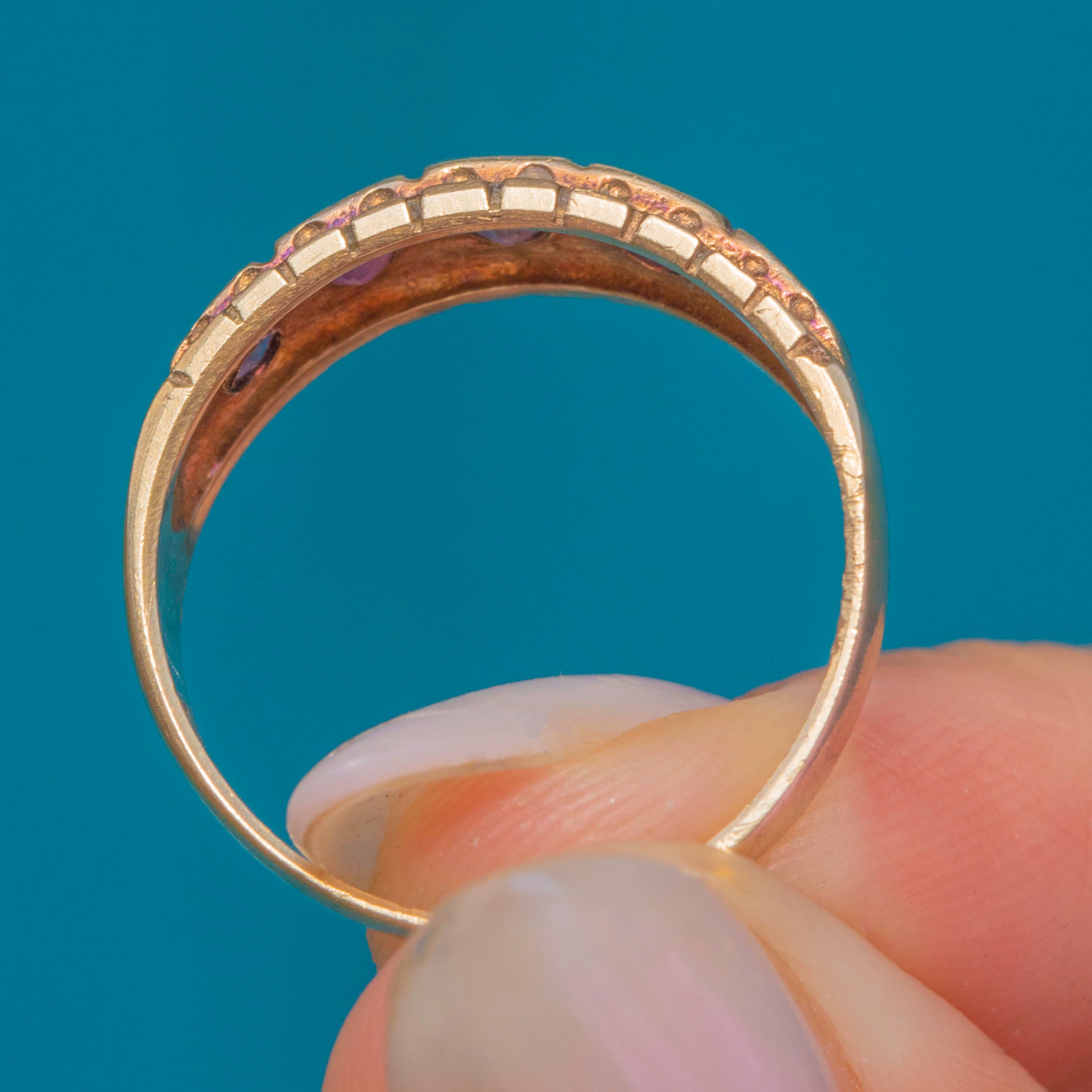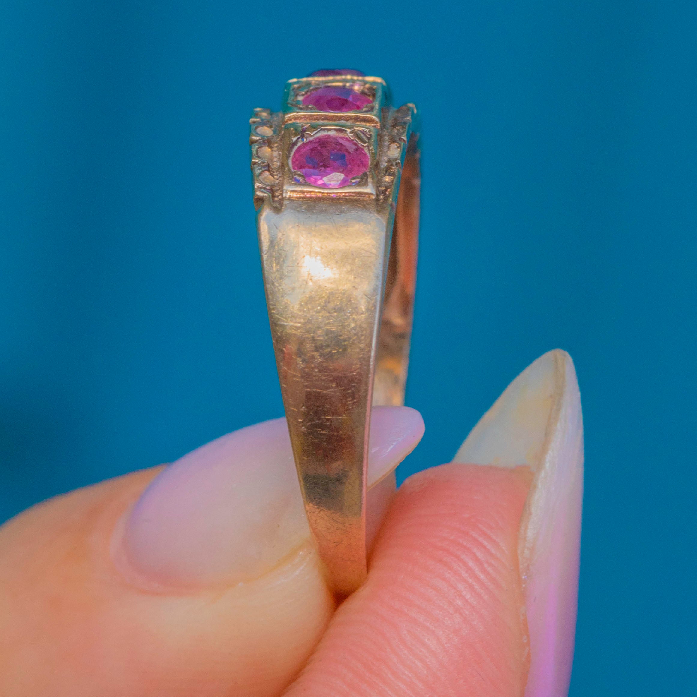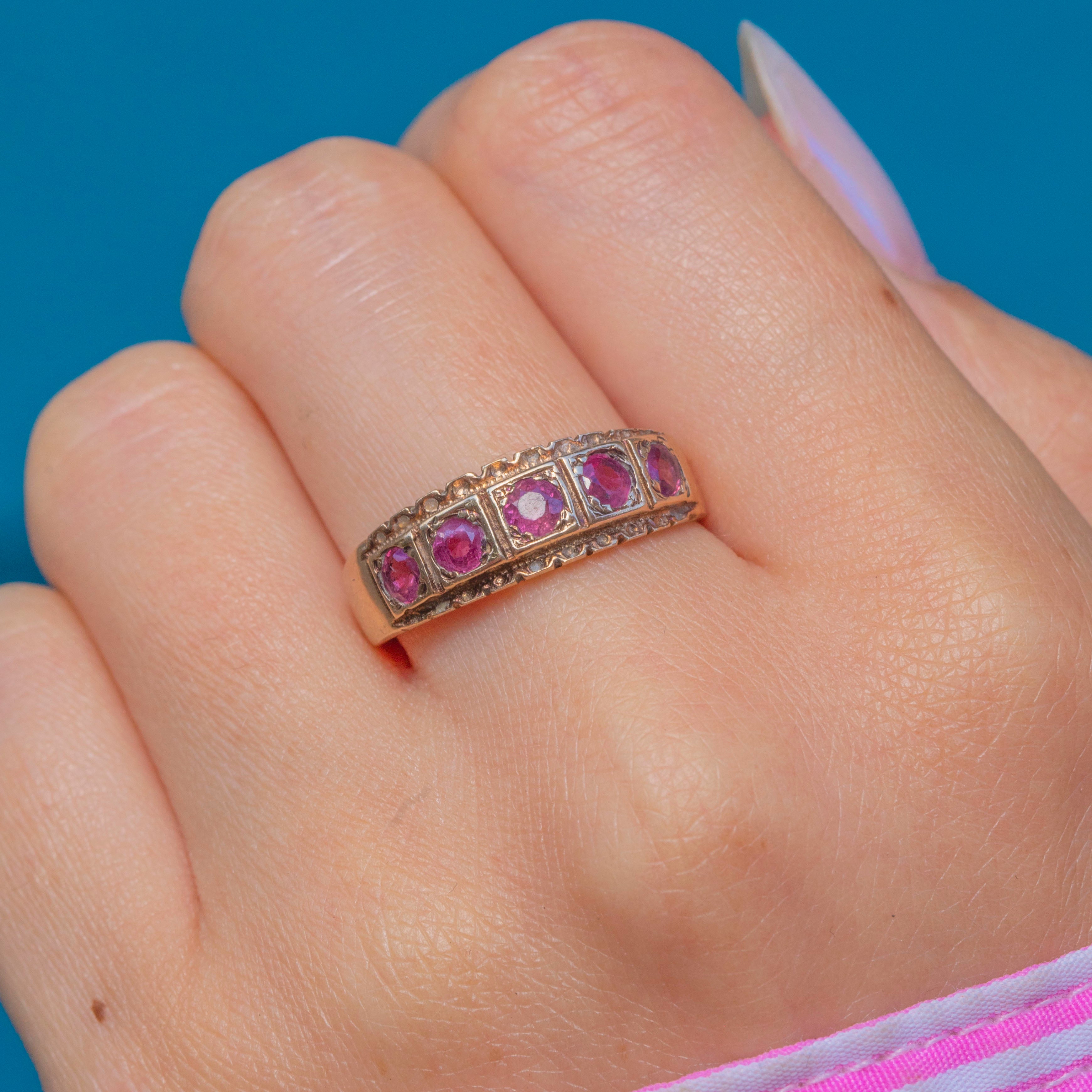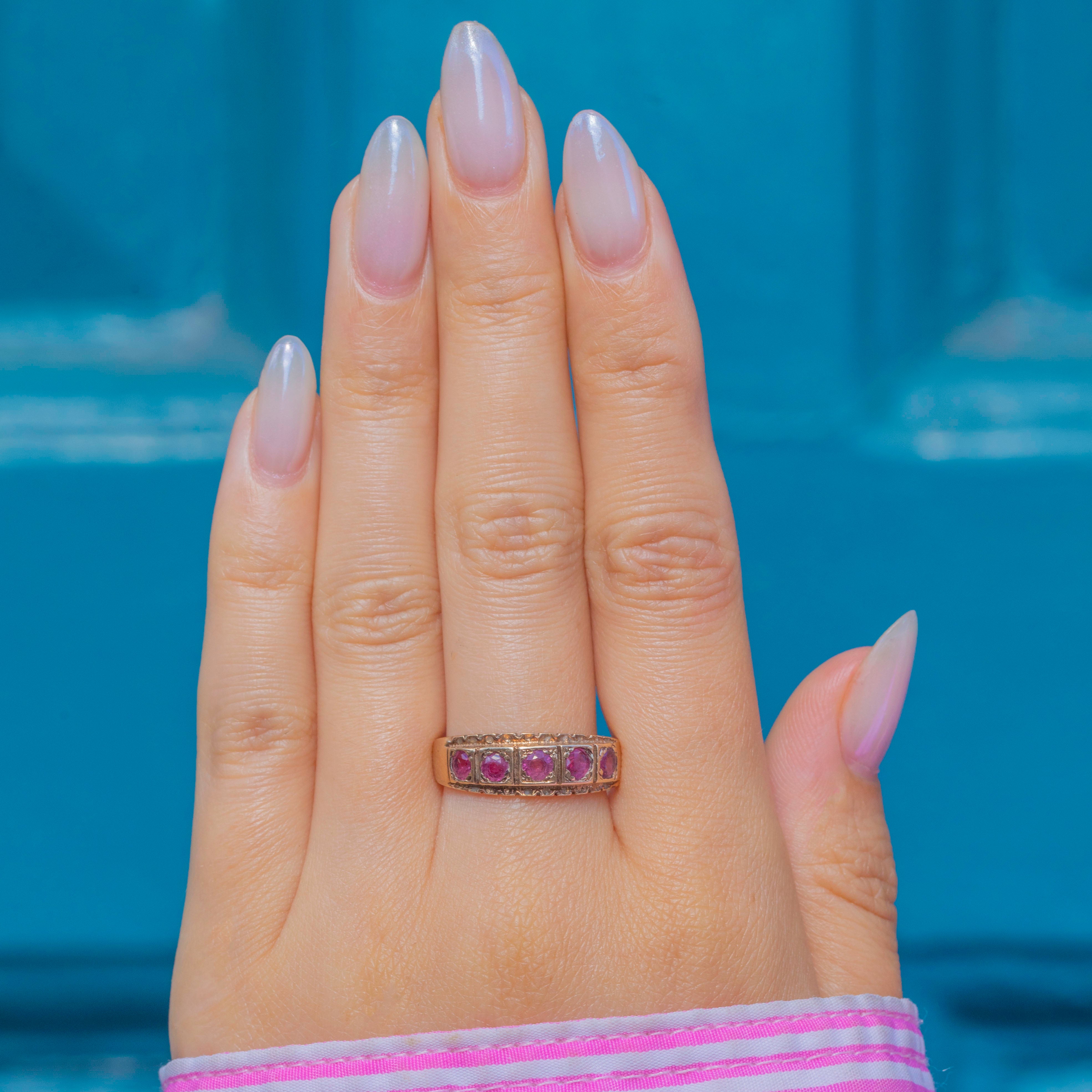 This gorgeous vintage gypsy ring has been ornately formed from solid 9ct Gold and displays five natural pink Rubies, with pretty soft raspberry undertones, that spread the width of the finger, and a flat profile that makes it perfect for everyday wear.