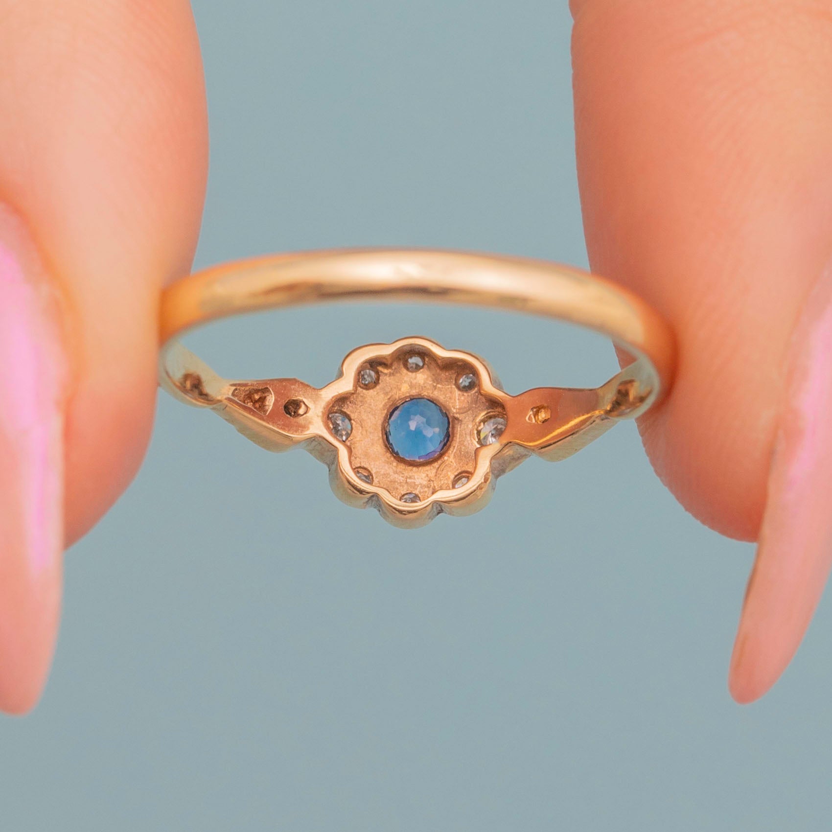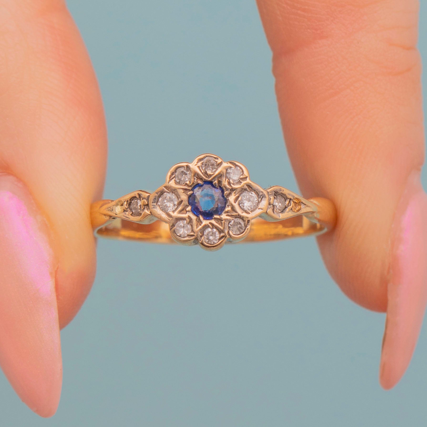 Inlaid with a cornflower blue Sapphire, this daisy has sparkling Diamond petals all set into solid 9ct Gold. Perfect for everyday wear, this vintage Sapphire Diamond ring would make a fabulous choice for a unique engagement ring.