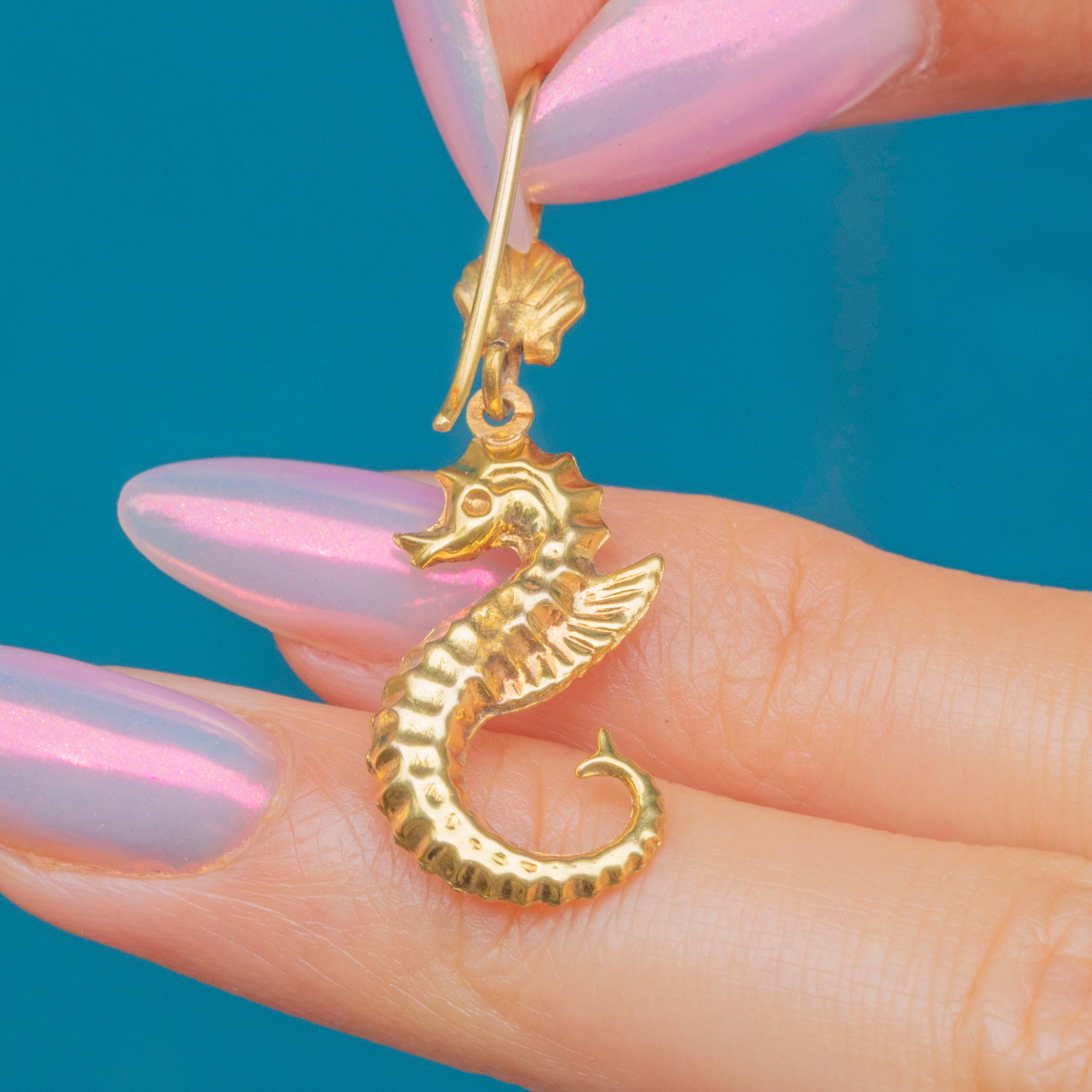 Formed entirely from buttery 9ct Gold, these lightweight earrings have been crafted with meticulous detail, providing a lovely texture that catches the light beautifully. Each seahorse is suspended from 9ct Gold hooks and is adorned with a petite shell detail.