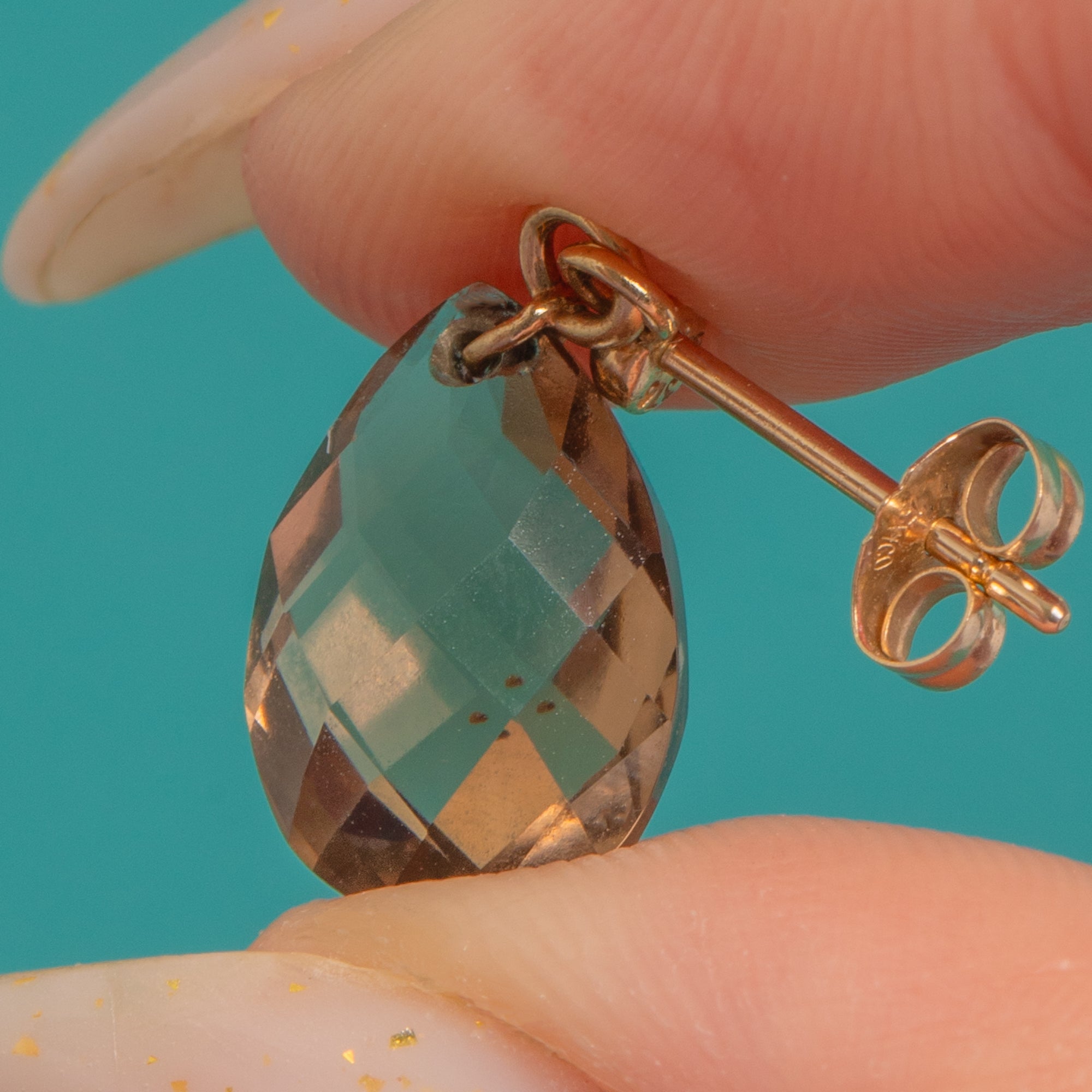 EXCELLENT: The Smokey Quartz briolettes are bright and lively with crisp faceting and only the lightest abrasions visible under magnification. The 9ct Gold studs, posts and fittings are clean with fine surface marks from wear; slight darkening at the drilled loop is commensurate with age. No chips, cracks or repairs observed.