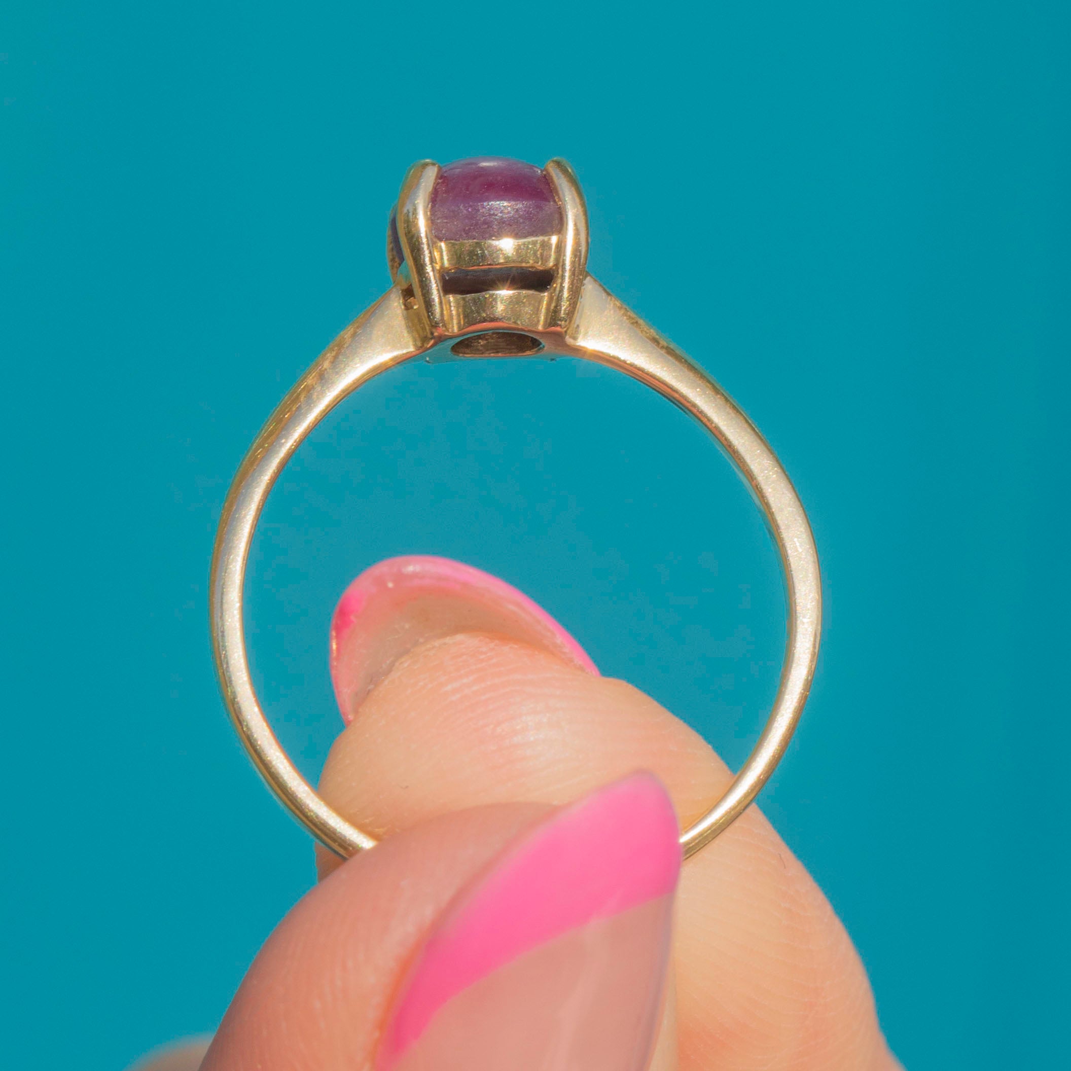 The round Ruby cabochon is displayed within neat claws and held proudly from the finger in a double basket setting. The 9ct Gold band caresses the finger comfortably, with its buttery hue and high-shine polish making this Star Ruby ring a luxurious addition to your collection!