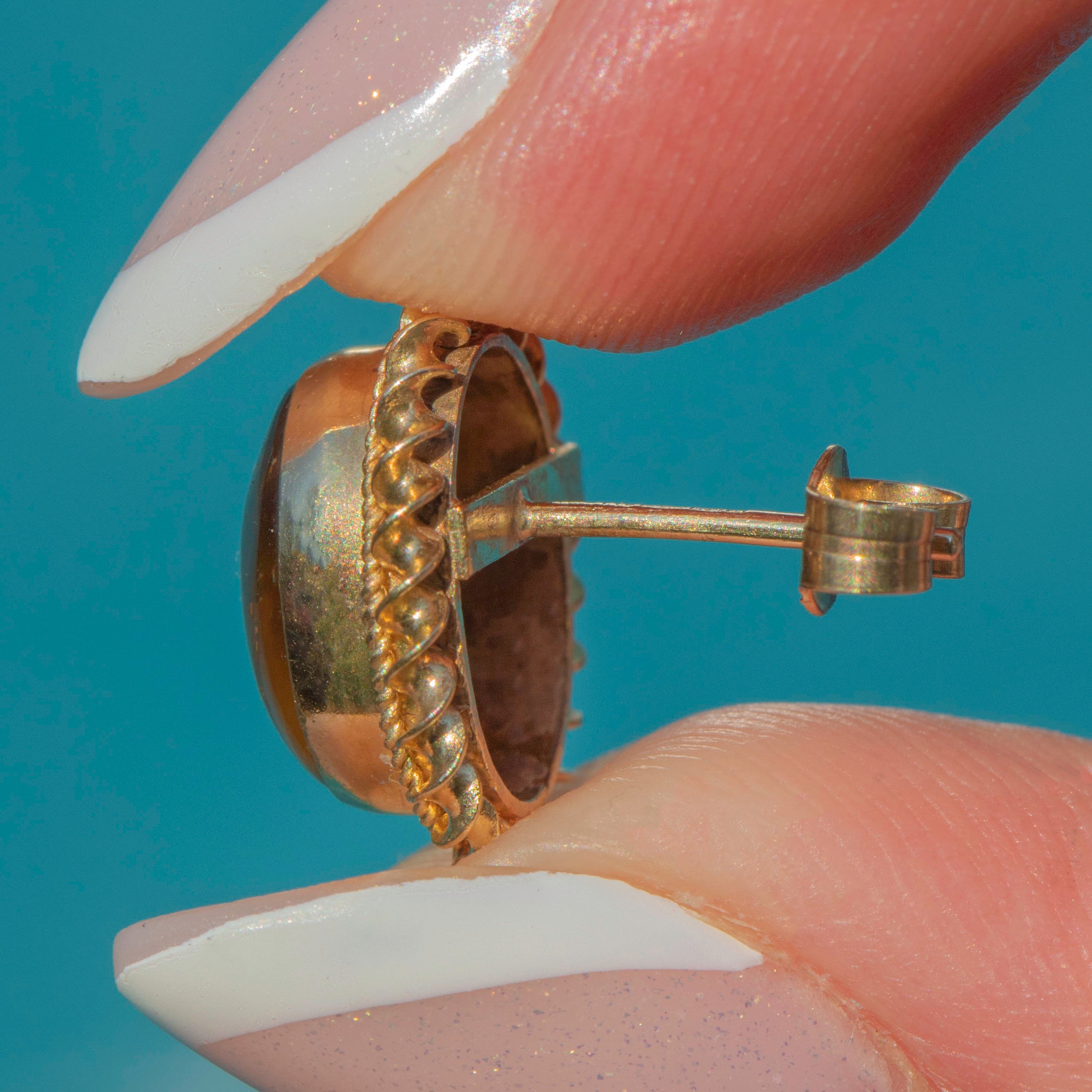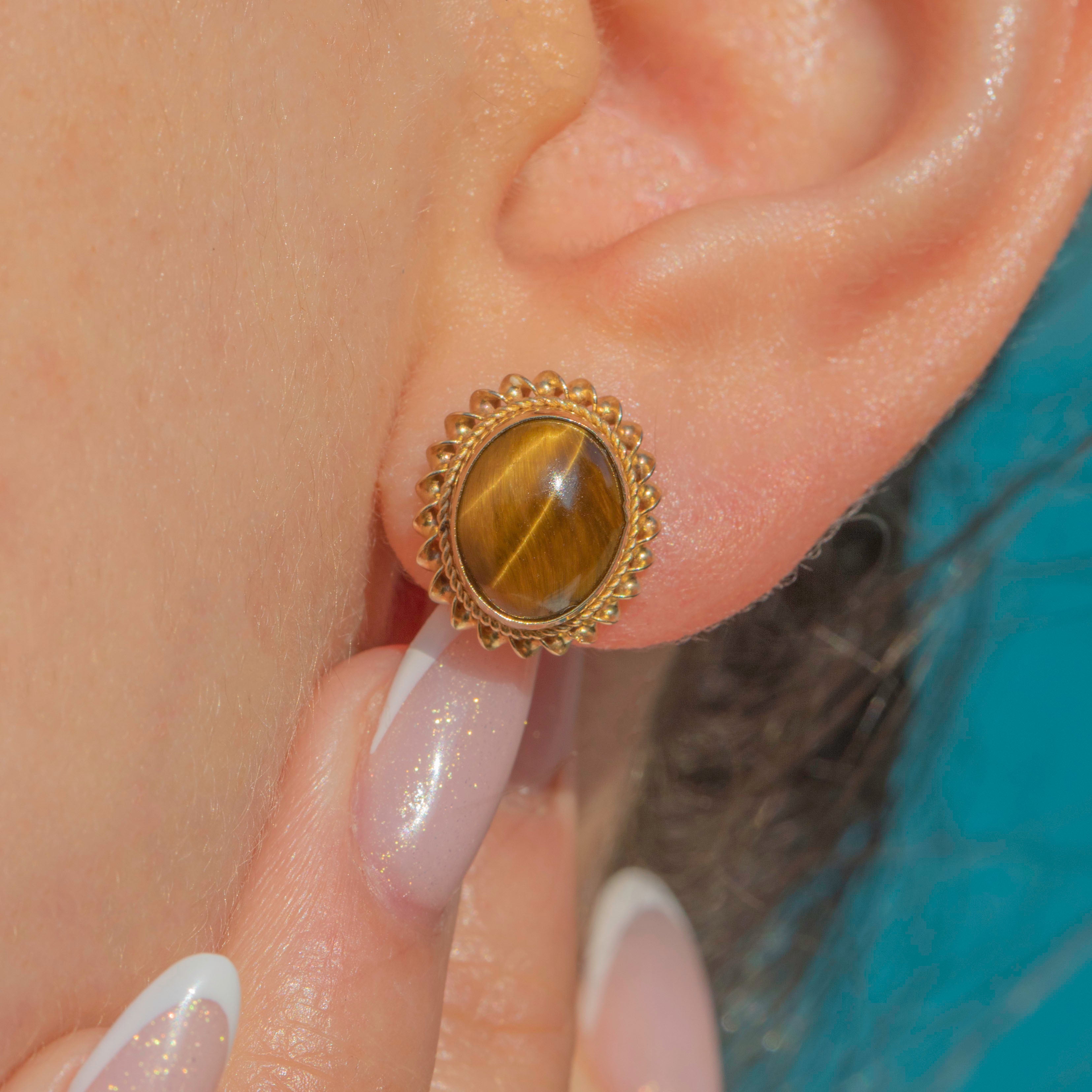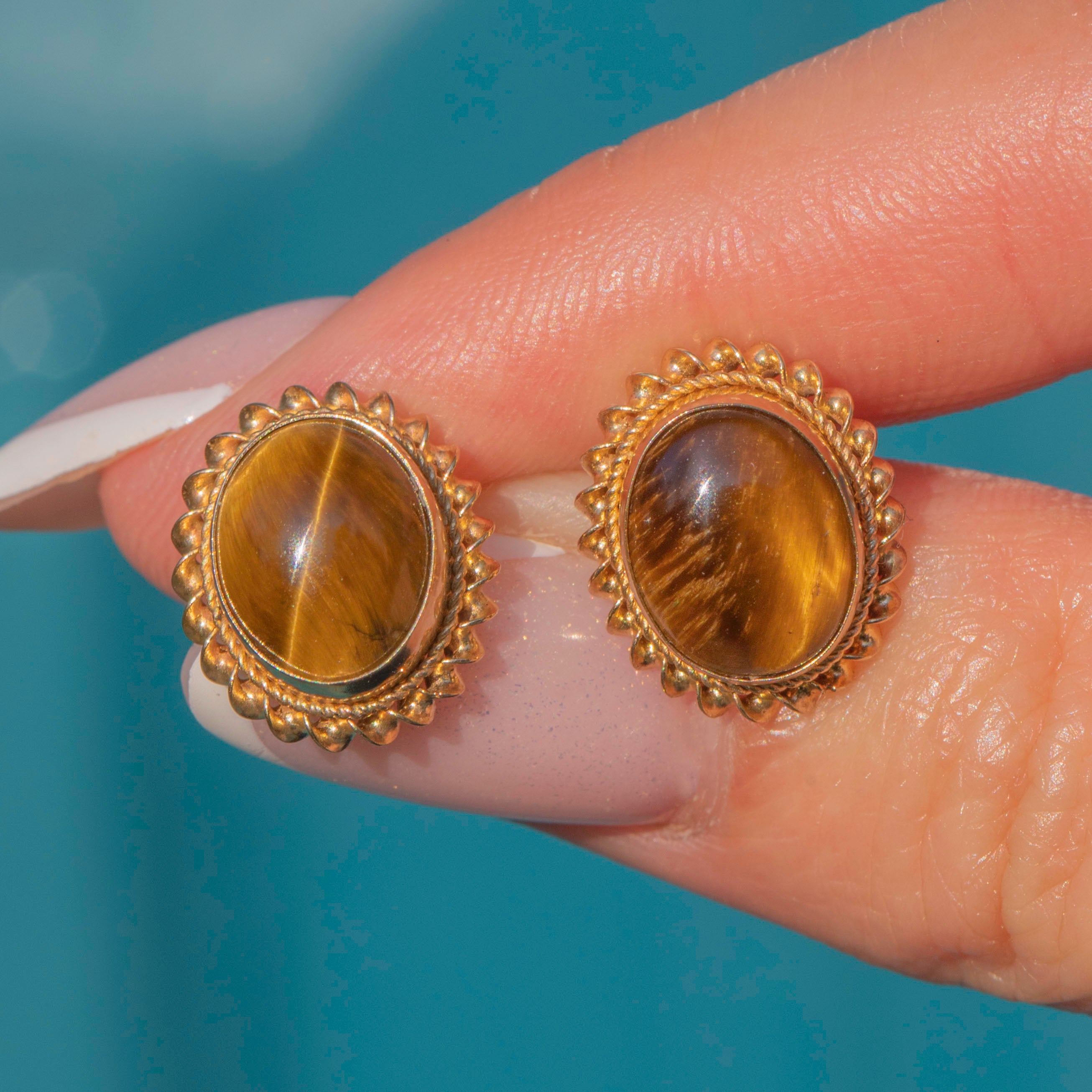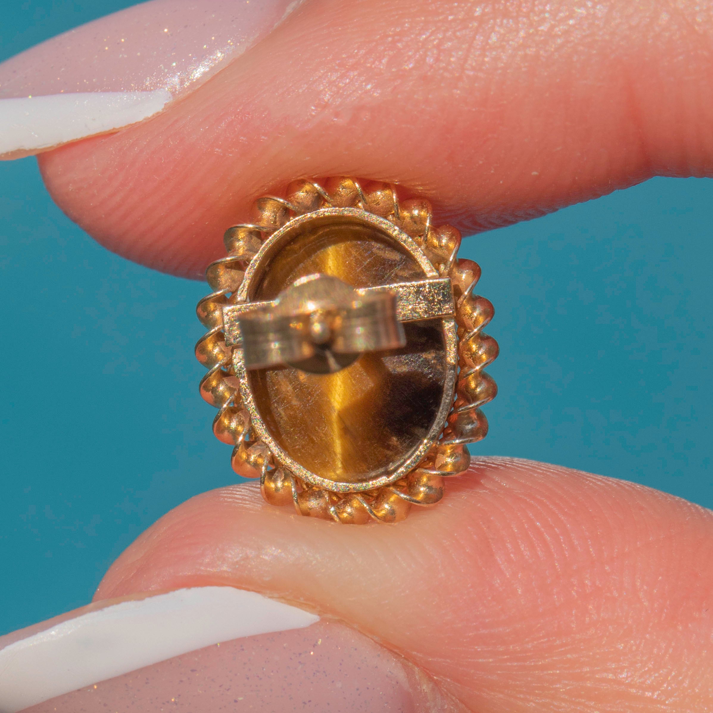 These pretty mid-century vintage earrings catch the light beautifully, with the striations within the Tiger's Eyes changing as the light hits! Perfect for everyday wear, these Tiger's Eye studs will instantly add a touch of intrigue to your lobes!