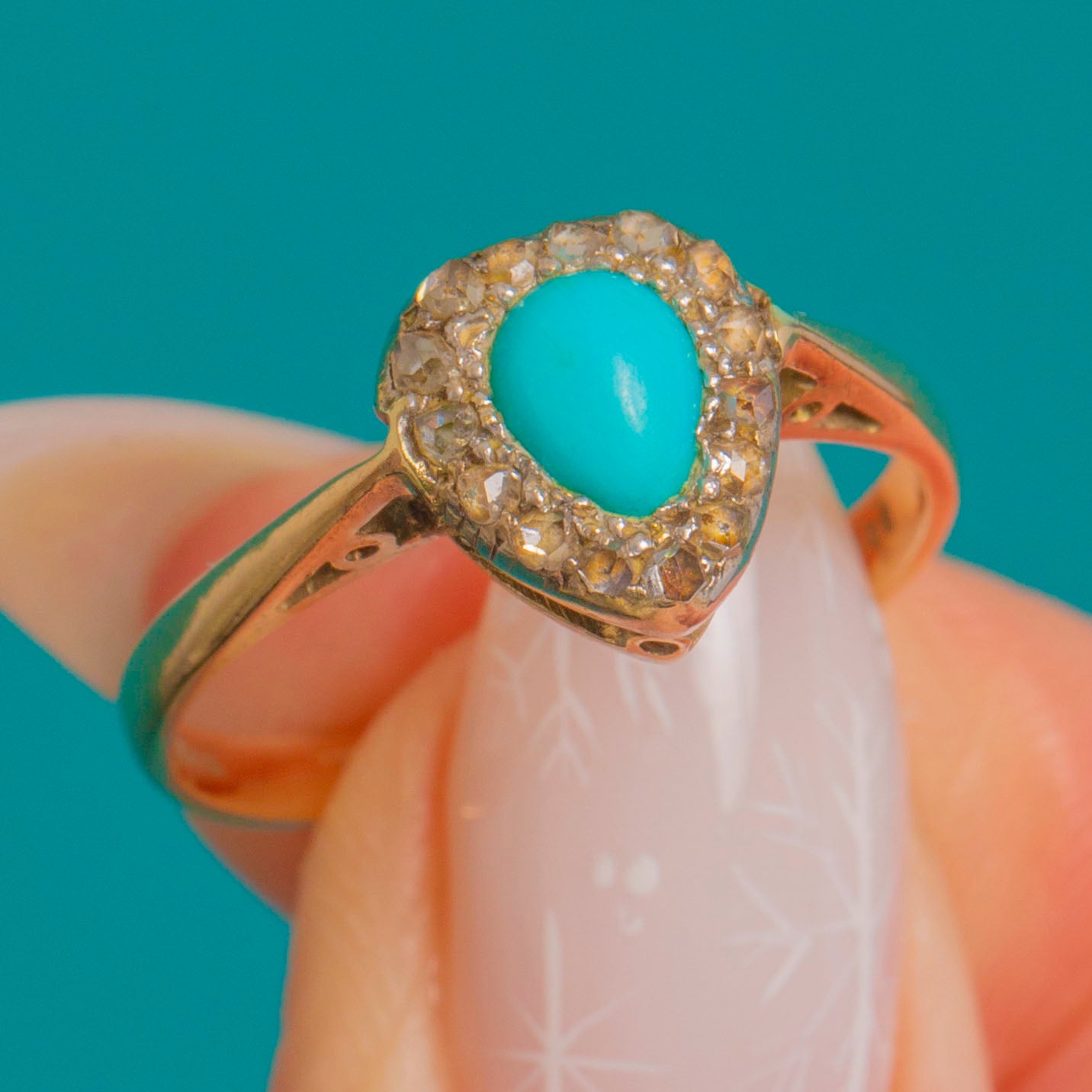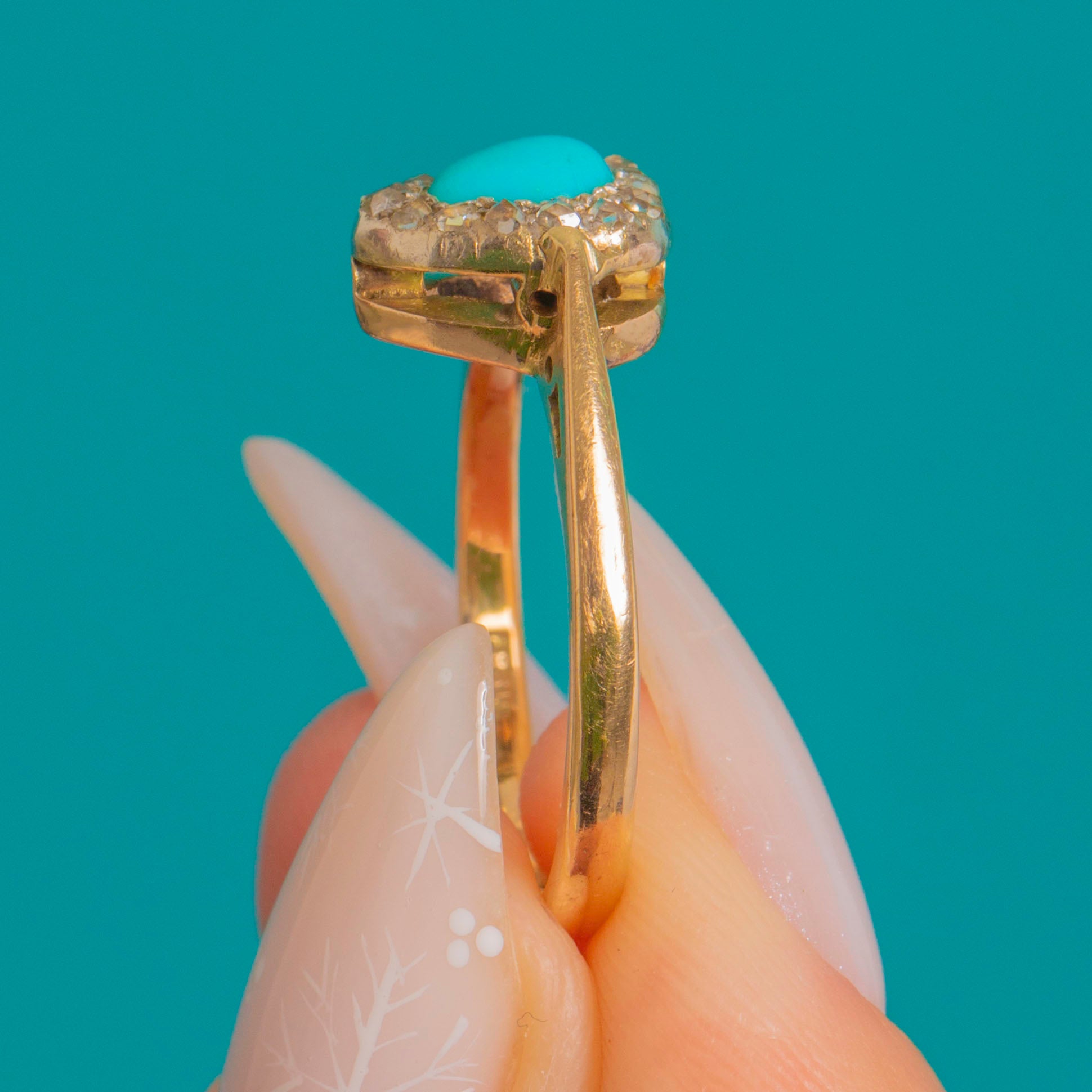 MATERIALS: Tests as 9ct Gold, Platinum settings, Turquoise, Rose Cut Diamonds.