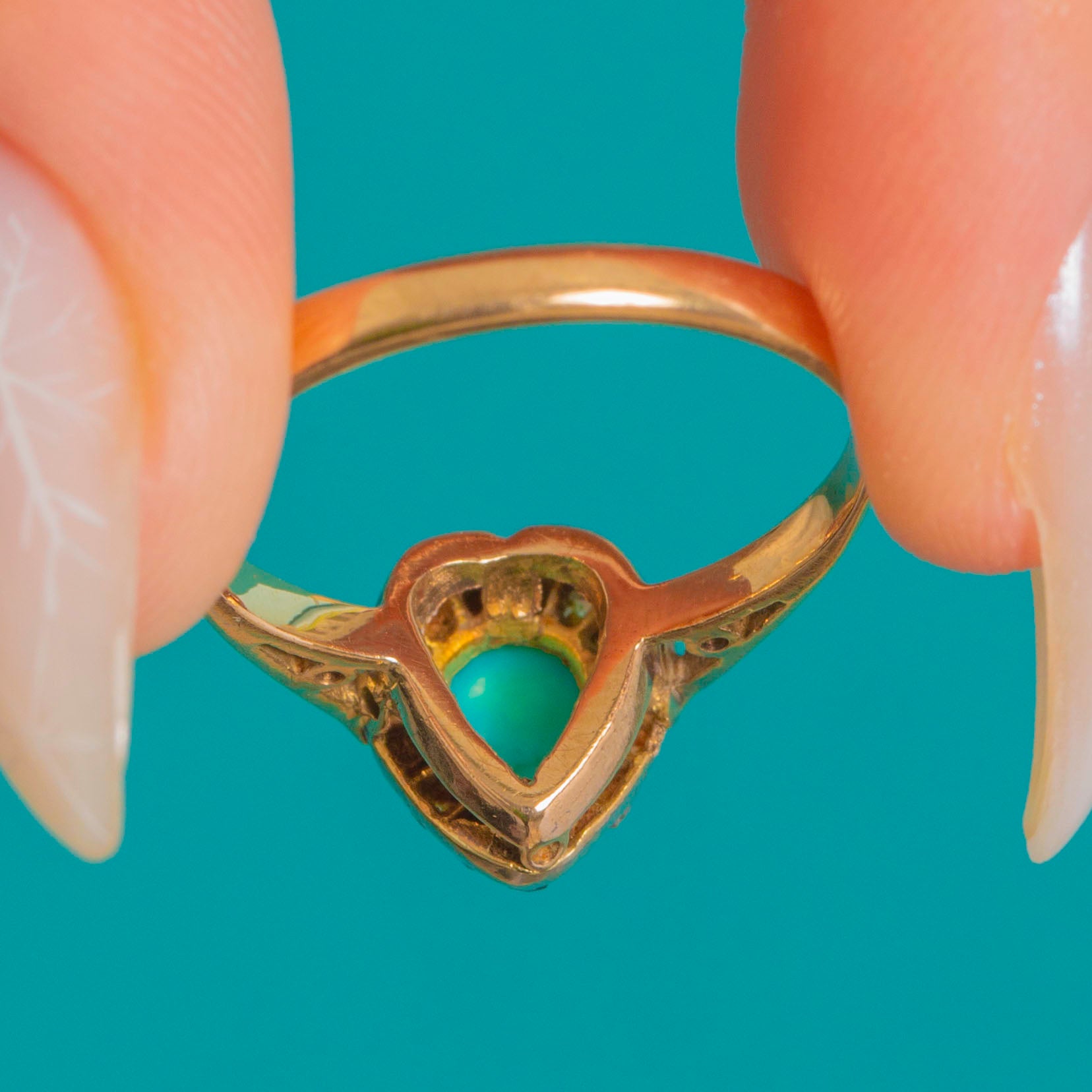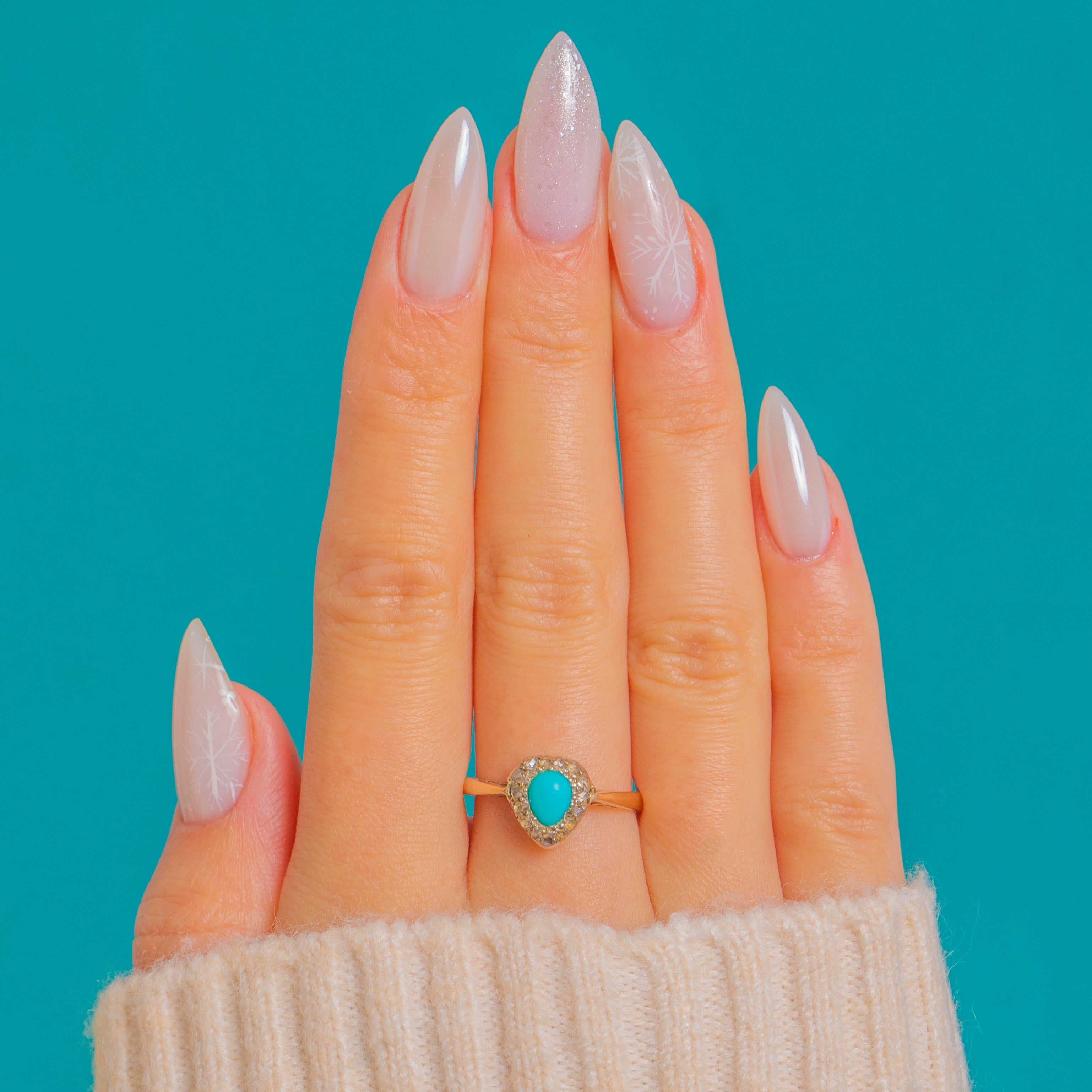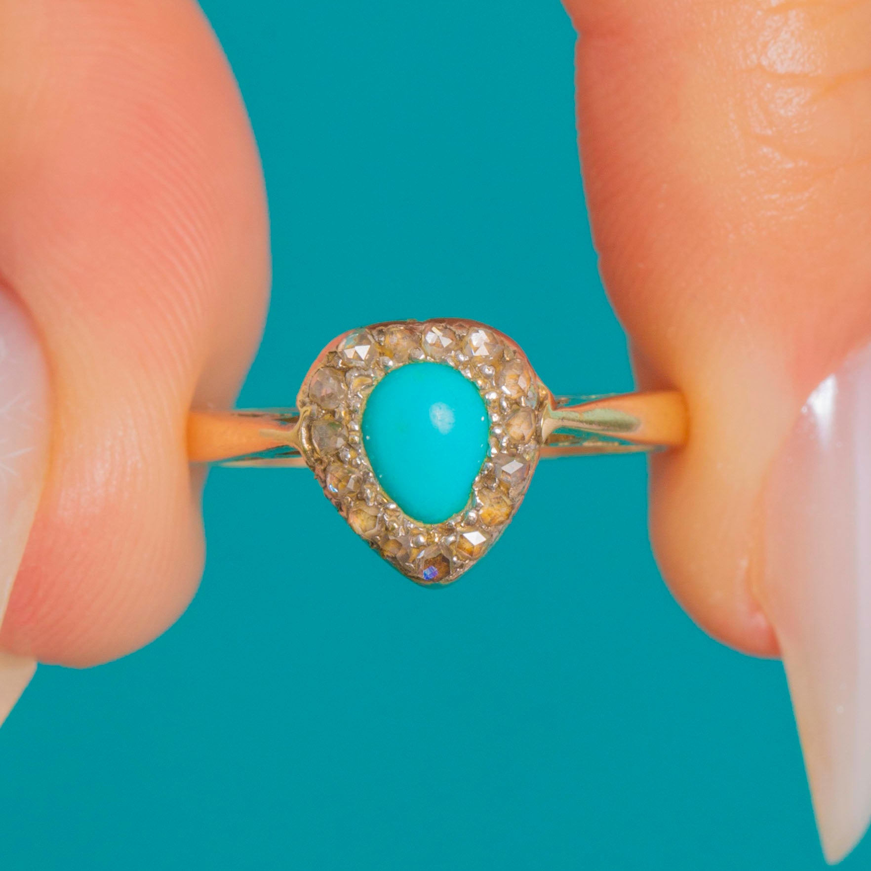 A darling heart cluster ring that marries vibrant colour with timeless sparkle. At its centre sits a bright Turquoise cabochon, framed by a scalloped halo of glinting Rose Cut Diamonds set in cool Platinum for that beautiful “white-topped” contrast against the warm 9ct Gold band.