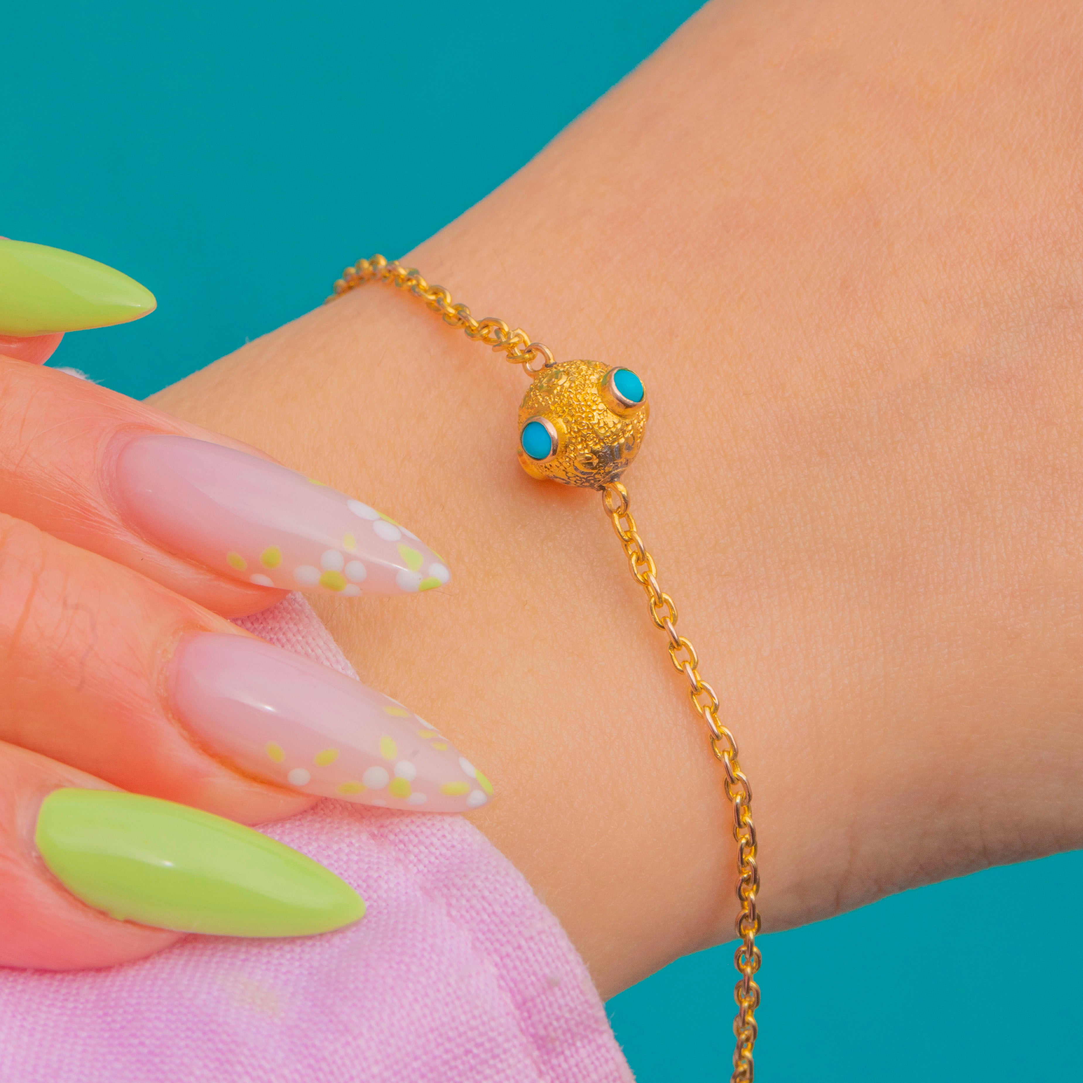 Elegant yet playful, the textured orb and bezel-set Turquoise create a chic, distinctive silhouette that layers beautifully or shines on its own—an easy, refined touch of colour for every day.