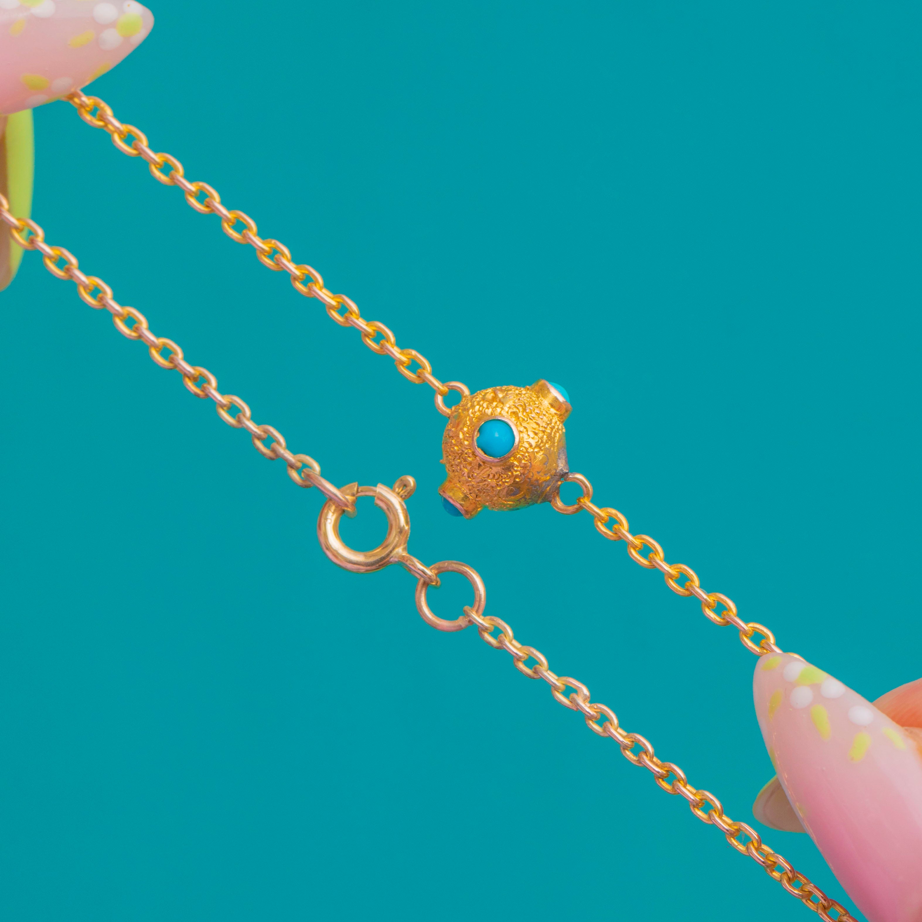 A dainty Victorian treasure in 9ct Gold, this bracelet centres on a tactile orb bead delightfully dotted with vivid Turquoise cabochons. The smooth, fine chain lets the spherical focal point take centre stage, its lively pops of blue bringing a fresh, uplifting accent to the warm glow of Gold.