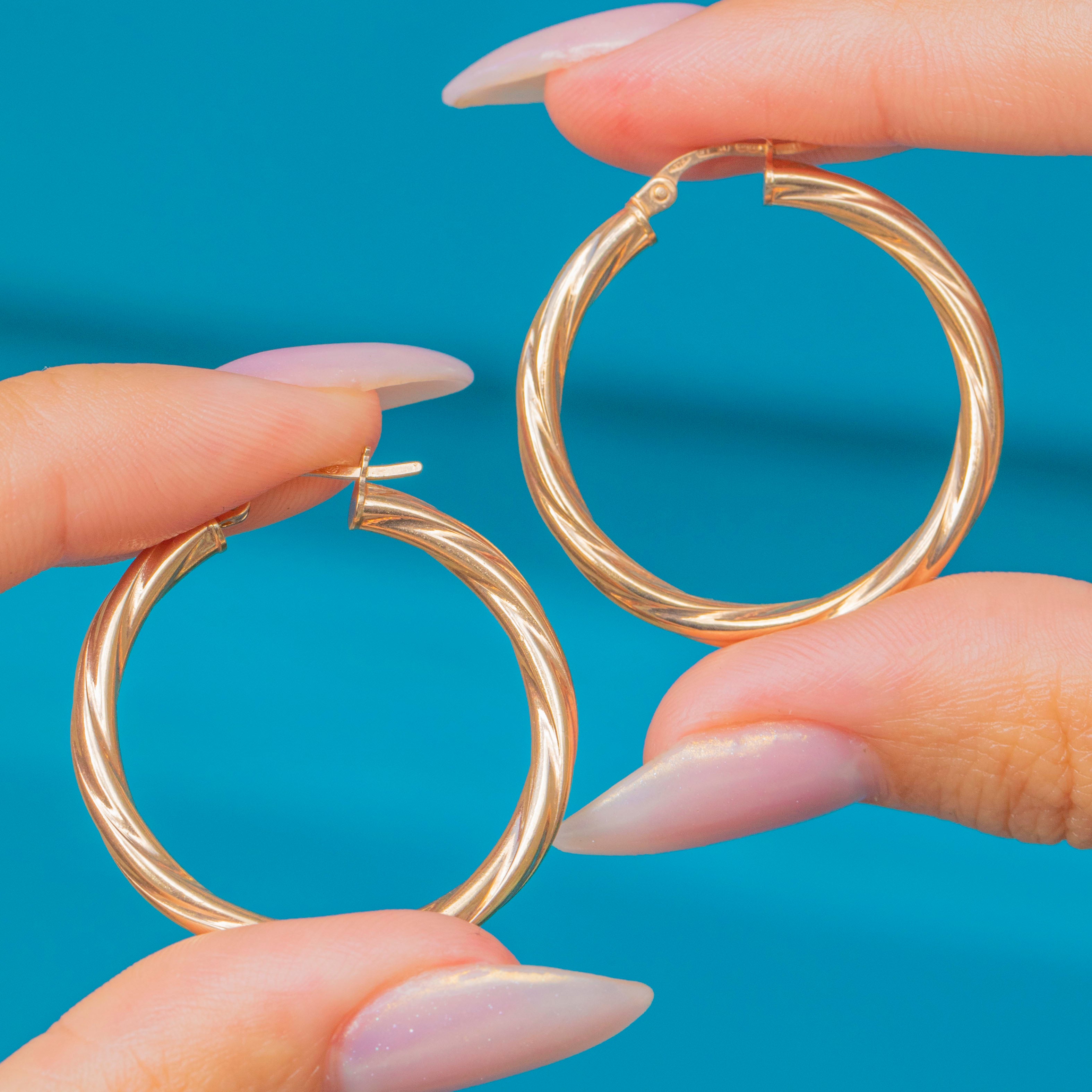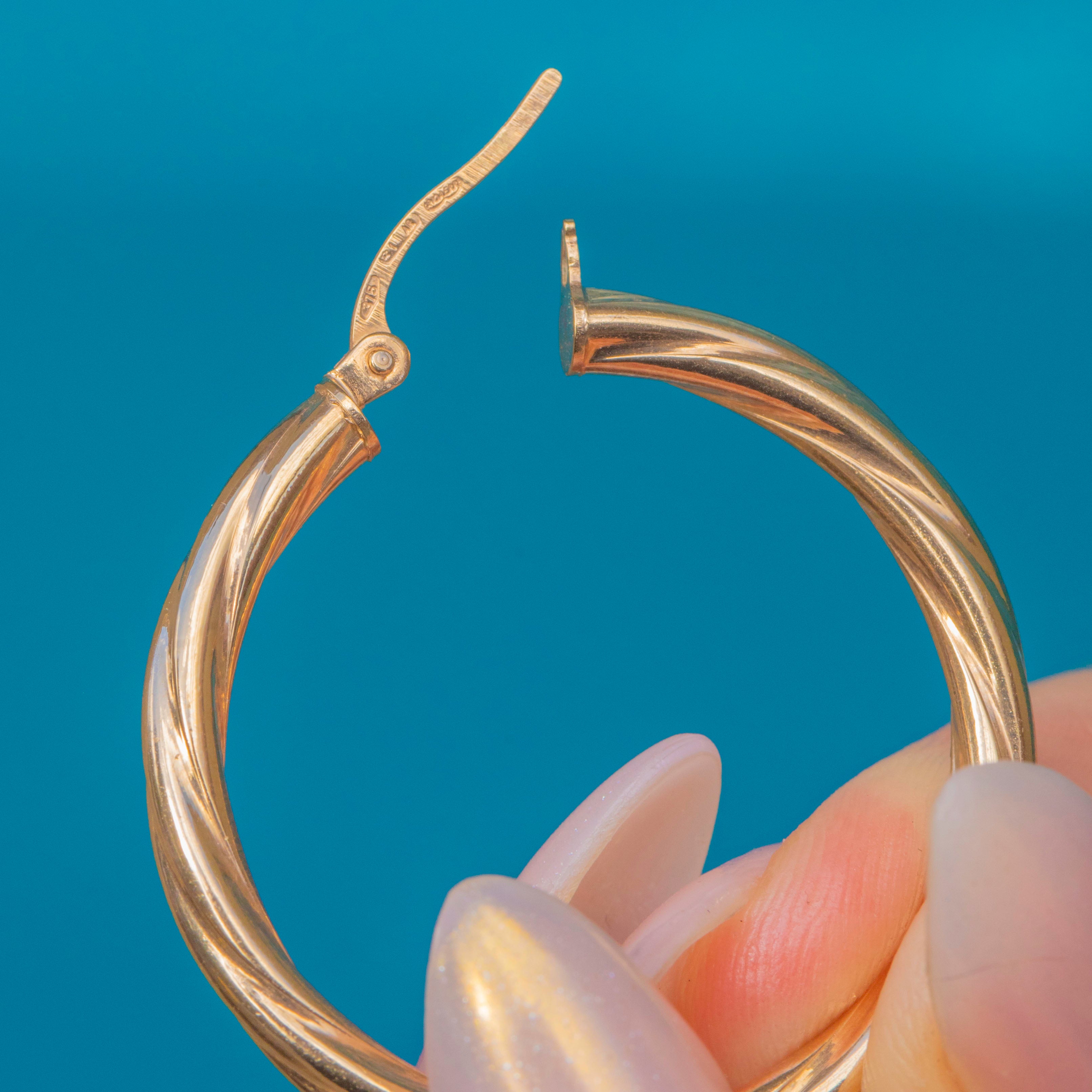 EXCELLENT: Hoops are bright and well-polished with no dings, scratches, or dents visible. The twisted Gold design is crisp, and the posts and clasps close securely.