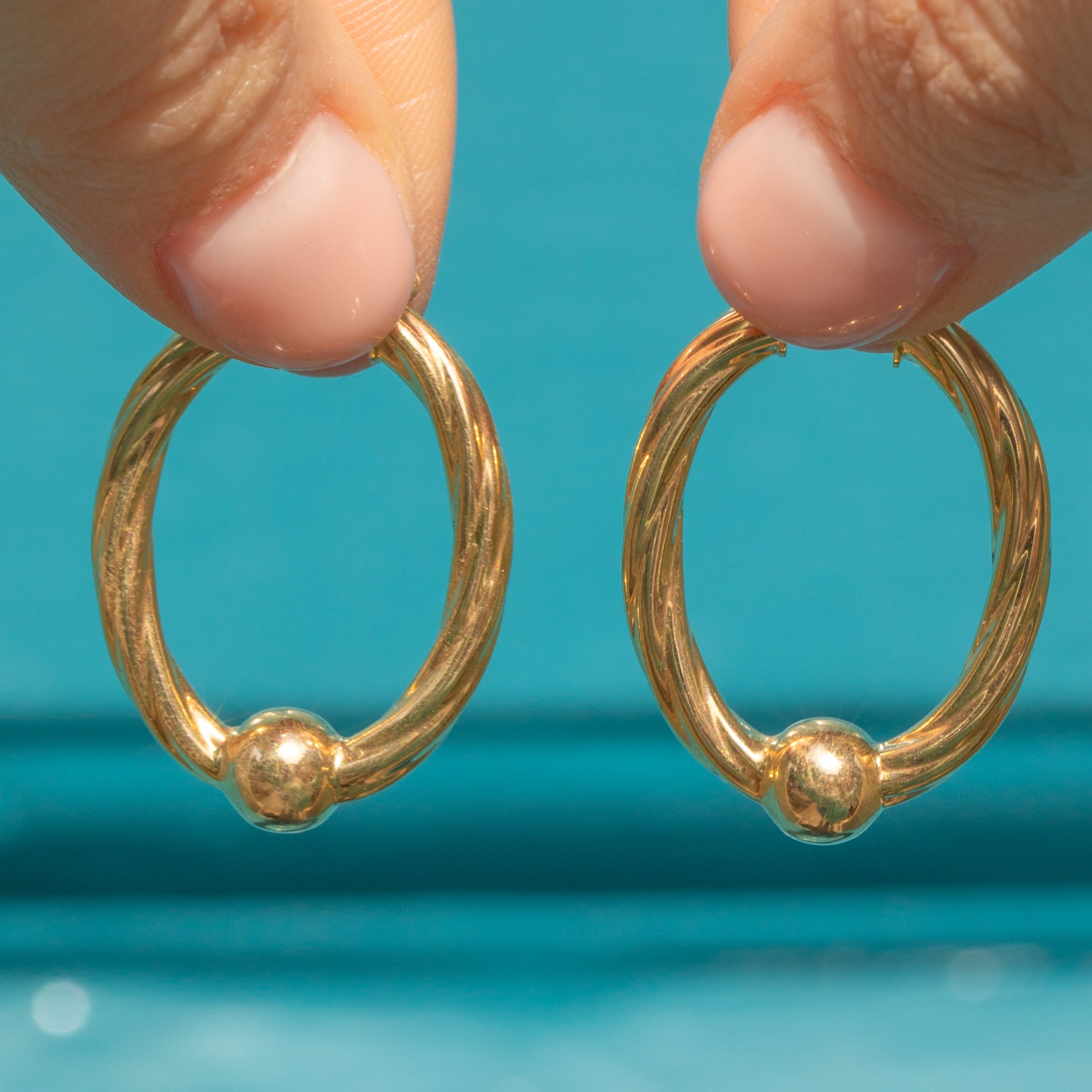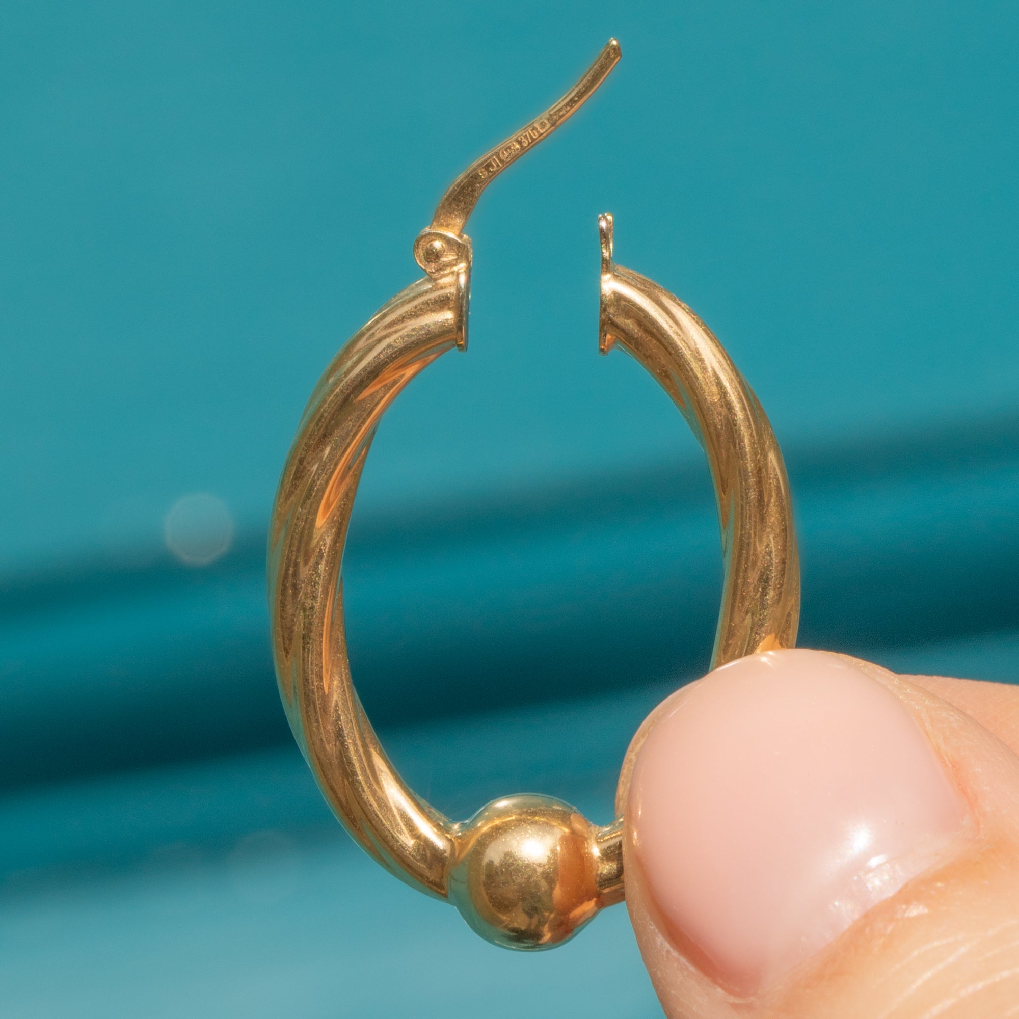 EXCELLENT. These 9ct Gold twisted hoop earrings are in excellent condition! Each of the textured Gold hoops remains crisp with no damage to note and their smooth Gold shows no signs of wear. Each ear post lever is in perfect working order and securely clicks into place. With nothing else to report, they are ready to adorn your ears straight from the box!